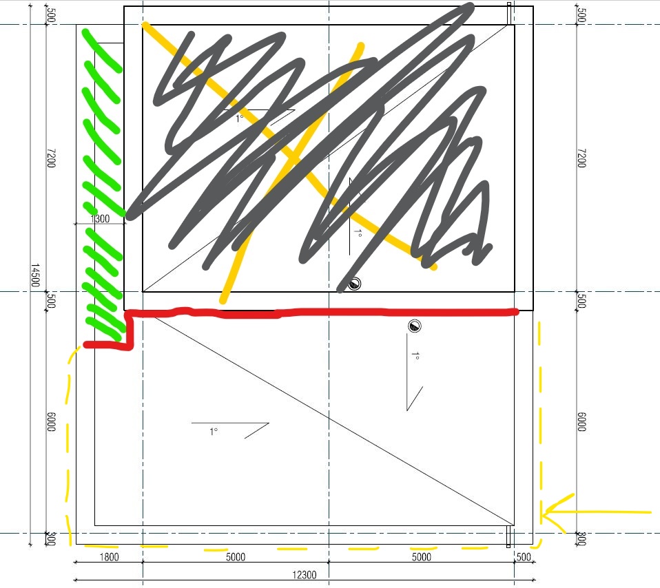 On vaja ümber teha lamekatust-rõdu eramajas (avastatud leked). Kuna leked on mitmes kohas oleks vaja ümber teha suurem osa katusest - 12300x6300mm ehk u 77,5m2(kollasega näidatud plaanil). See väike osa (rohelisega märgitud plaanil) ei ole vaja ümber ehitada kuid on vaja teha veekindlat liitumiskoha ( uus katus vana PVC katega).