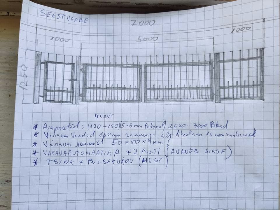 Pakkumine sisaldab poste 80x80x3mm (2000mm) koos paigaldusega, ühte varbtäitega aiaelementi ja varbtäitega väravaid paigaldusega mis on valmistatud 60x40x2mm materjalist ja varbid 15x15x1mm materjalist vahedega 140mm üleval ja 60mm all, kõik tooted tsingitud ja pulbervärvitud. Jalgväraval Lockinox lukusüsteem ja autoväravatel BFT Kustos automaatika. Enne töödega alustamist teeme ka joonised kooskõlastamiseks. Lugupidamisega, ST |