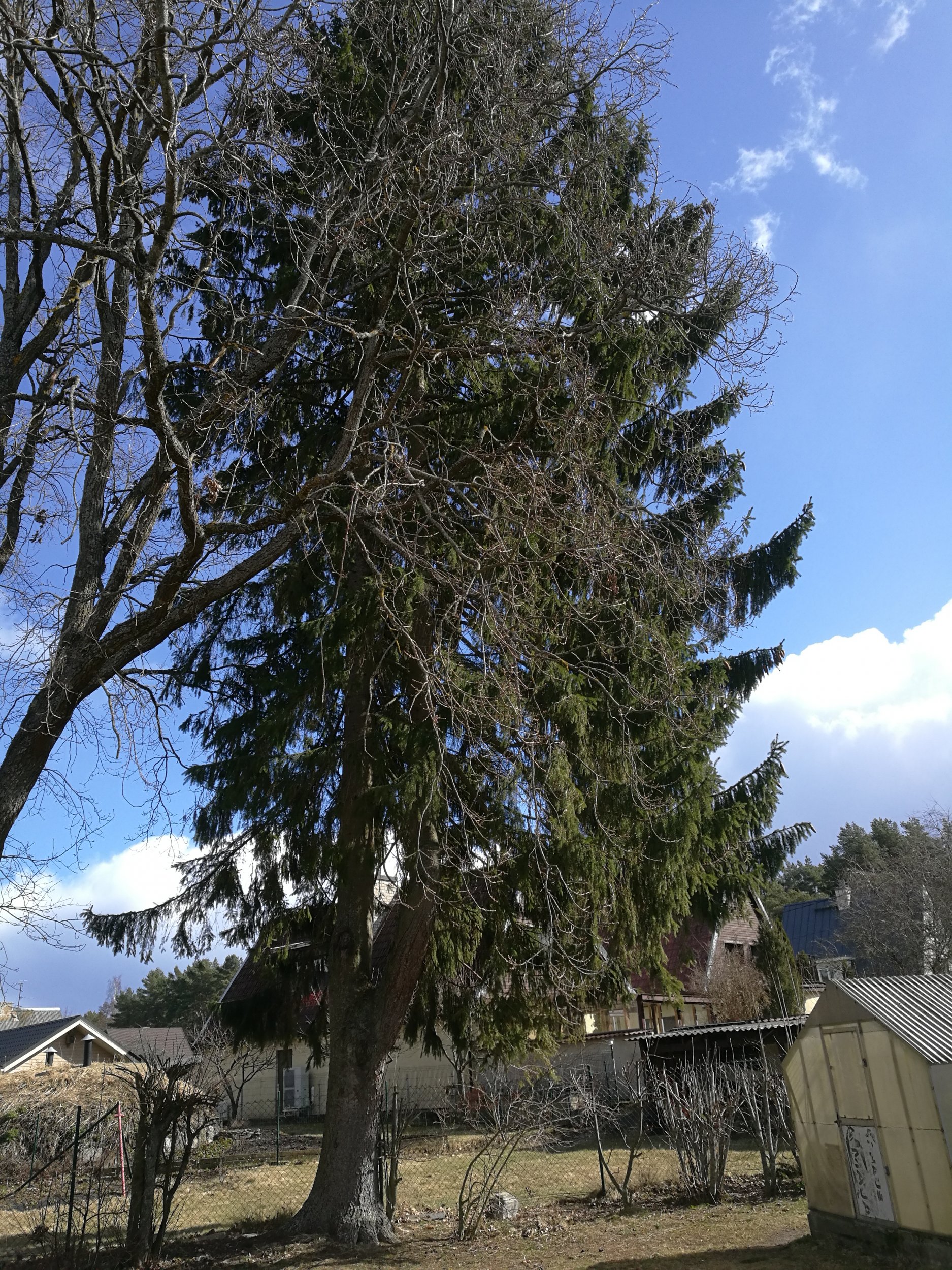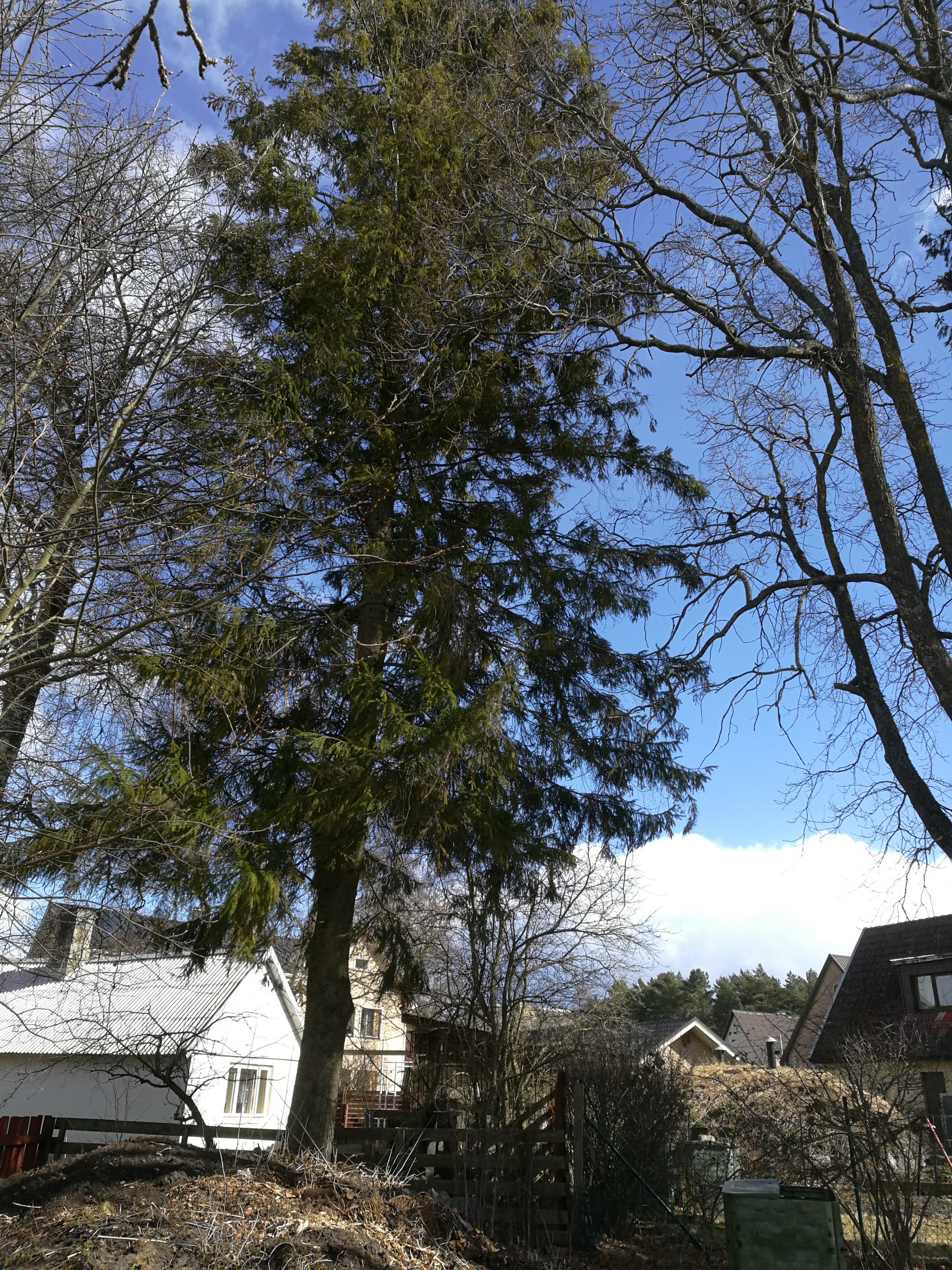 Kahe kuuse (üks kaheharuline) langetamine, okste äravedu, tüvi tükeldada pakkudeks, kännud freesida.
