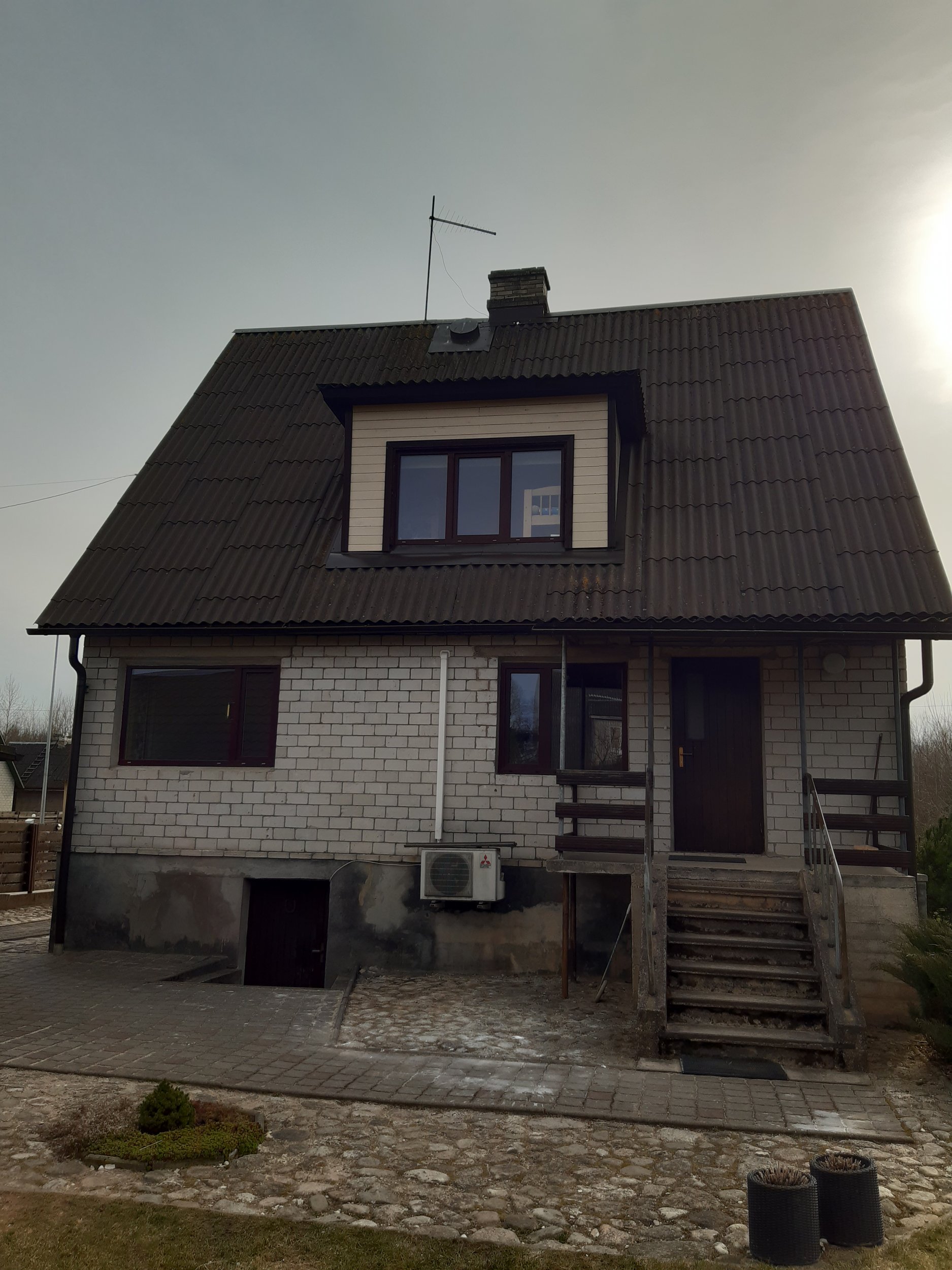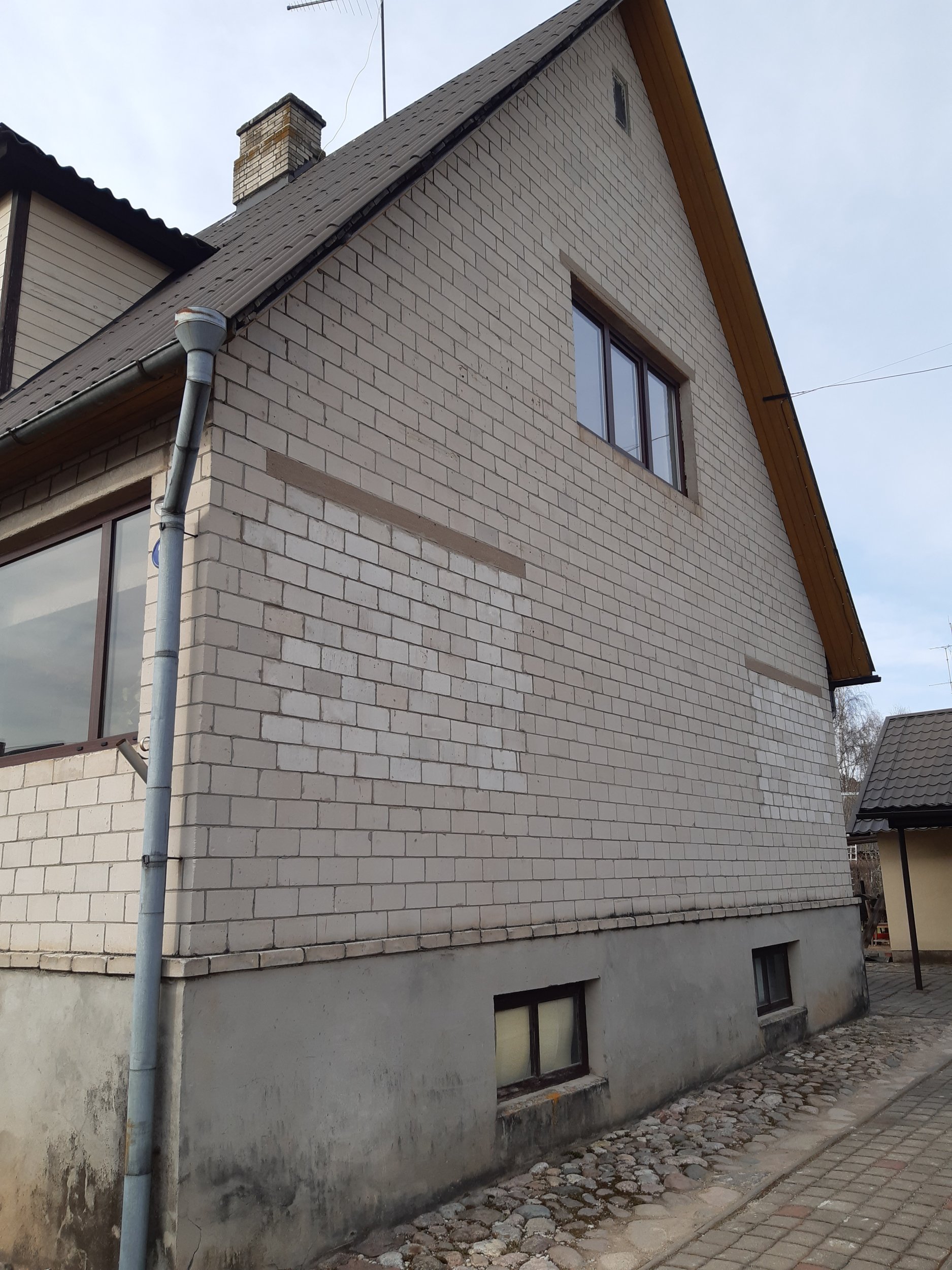 Vana silikaadi eemaldamine, tuuletõkkeplaadi paigaldus ja uue silikaat(tellise)voodri paigaldus. Maja mõõdud - külg 9 m*9,4 m. Vundamendi kõrgus 1,25 m.