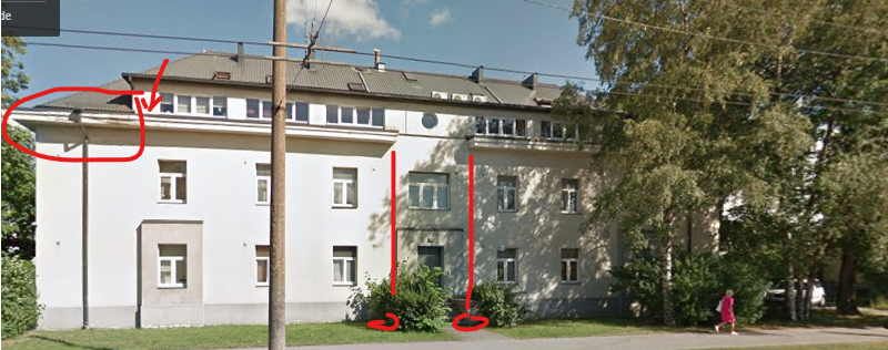 Katuse pind on umbes 15mx30m . Üks nurk on korda tehtud. Kolm nurka vajavad ümbertegemist et vesi ei voolaks valest kohast sisse (pildi peal on noolega probleemne koht, kus vesi esimesekatuse pealt läheb mitte ümber vaid seina sisse). On vaja paigaldada korstnamehe liigipääsud 2 kortsnale. On vaja alla veedata 4 lisa vihmatoru. 2 maja ees (vaata pildi peal) ja samasugused 2 maja tagant. Lisatoru pikkus 2 korrust alla umbes 6m pikk. Torude alla paigaldada mingi vihmavee vastuvõtmise asi.