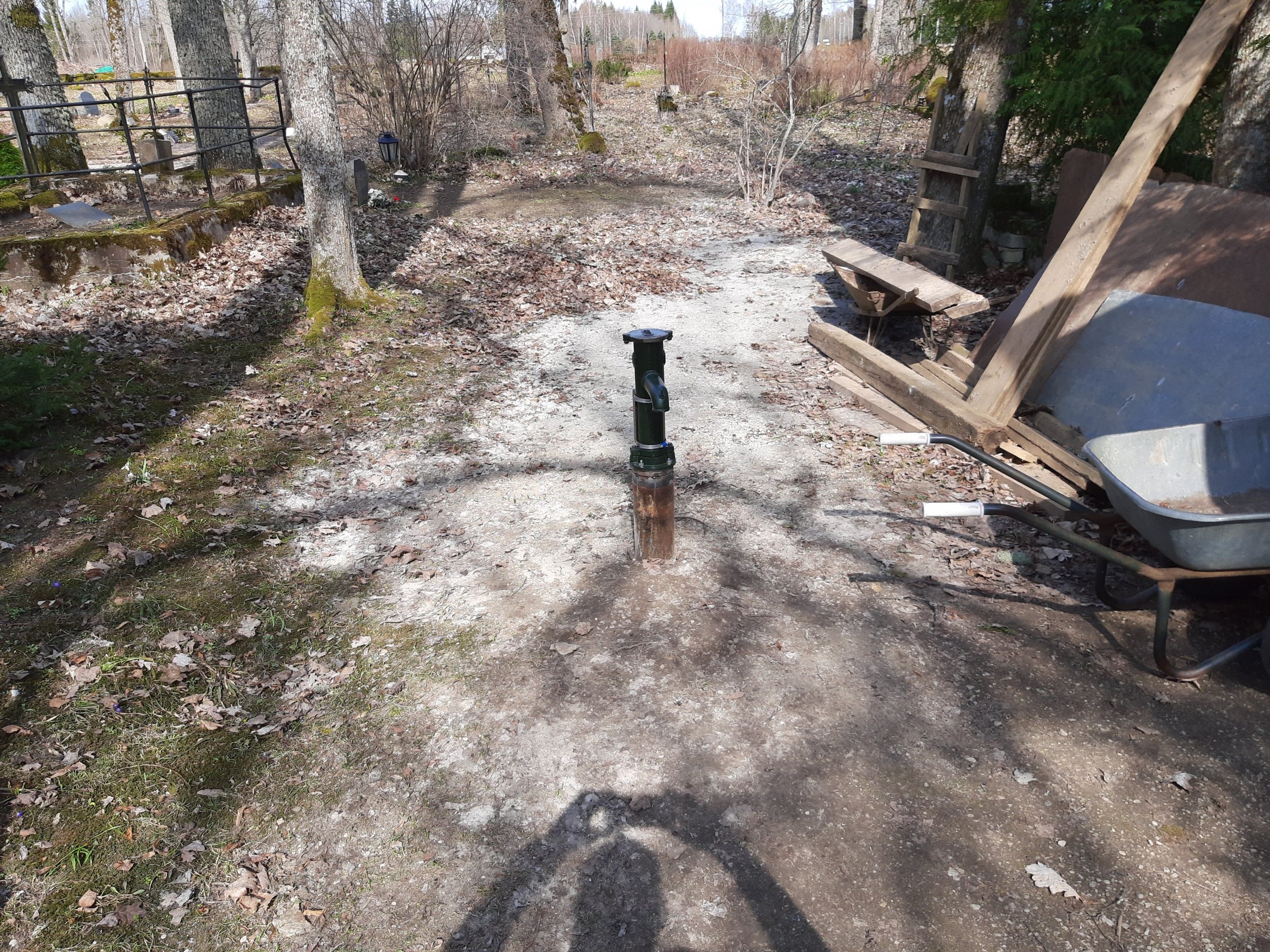 Kalmistul on puuritud kaev. Tellime tänavakivide ehk betoon plaatide paigalduse. Me näeme ette, et need peaks olema näiteks 500 x 500 plaadid, selleks, et kui rahvas pumba juures lödistab, siis vesi voolaks ära ja ei uuristaks kivide alust pinnast ( lihtalt üle ehitatava platsi ääre). Paigaldatud kividele tuleks teha nagu ikka - korralik põhi ja peame vajalikuks ka ääred näiteks kõnnidekividega ümbritseda. Kogu pumba alune ala võiks olla min. 4 x 4 meetrit. Natukene tuleks alust ka tõsta, valmis osa võiks maapinnast olla u. 10 cm kõrgem.