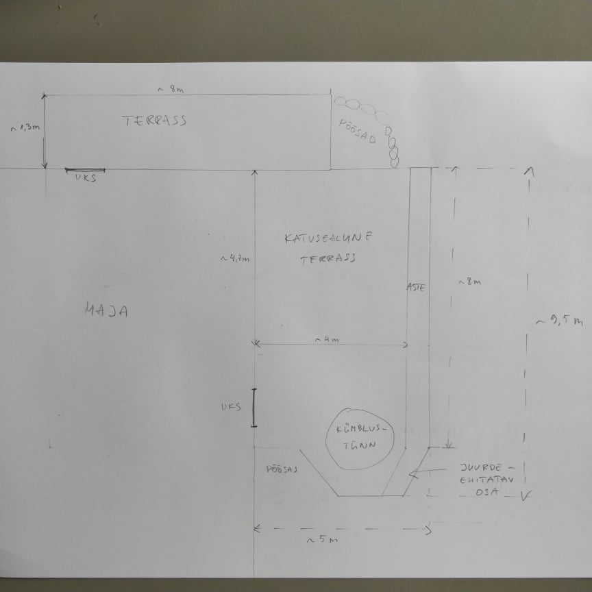 Piltidel näha praegune terrass, planeering on sarnane v.a kümblustünni paigaldamisega juurdeehitatav osa.