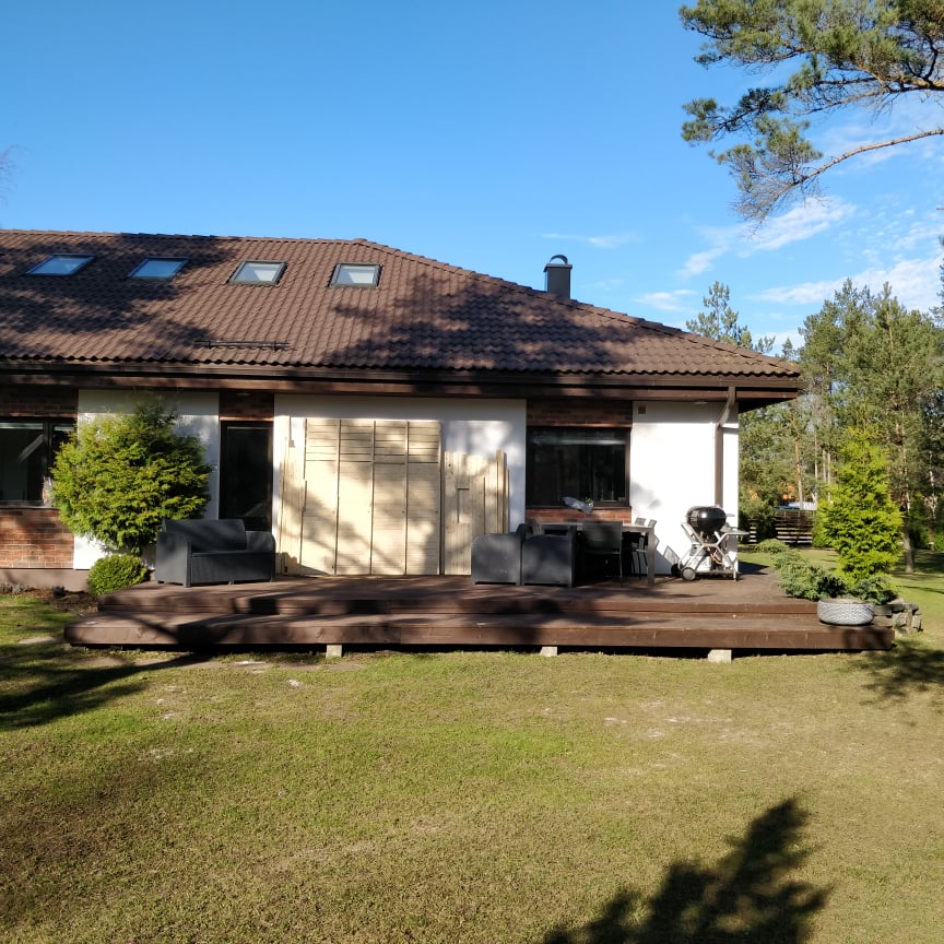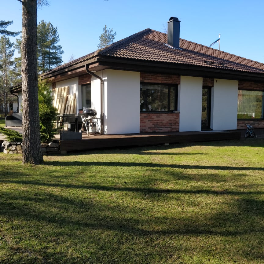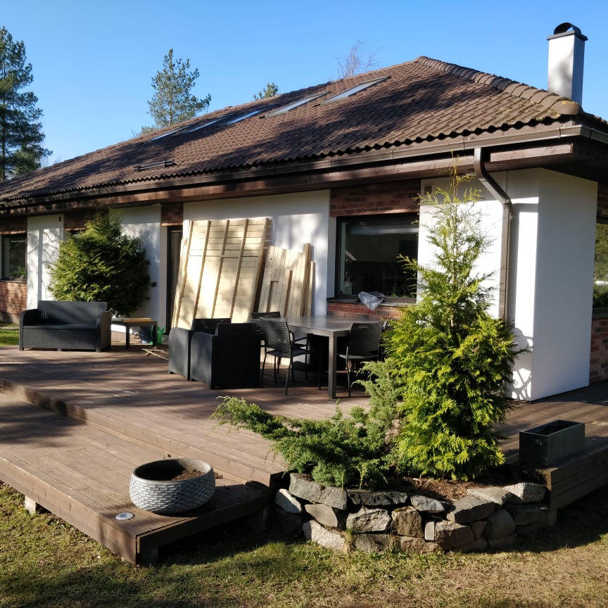 Hetkel terrass on fibo plokkidel, uus tuleks betoonpostidele. Geotekstiil jms juurdekuuluv. Soonitud terrassilaud, nt lehis.