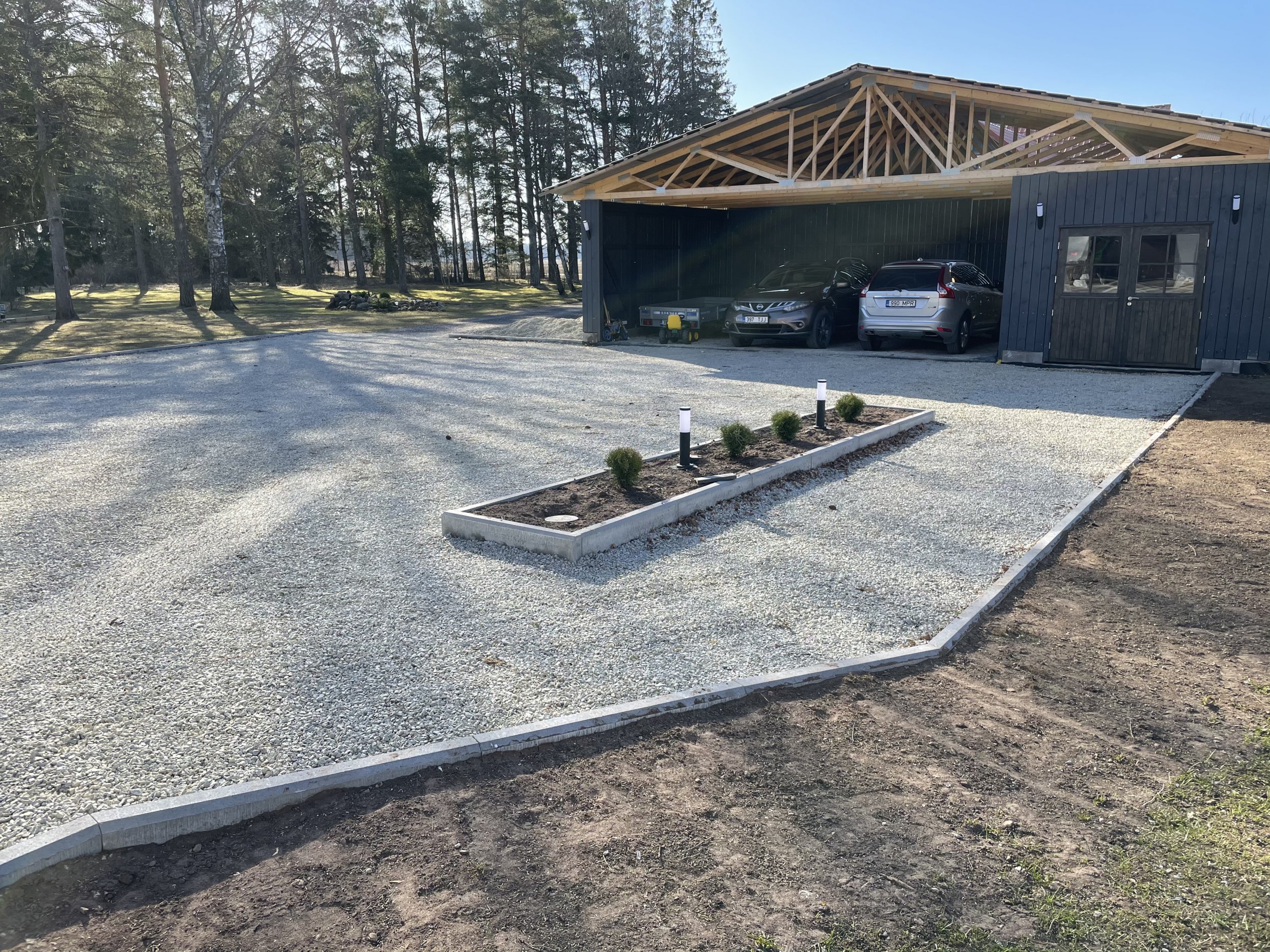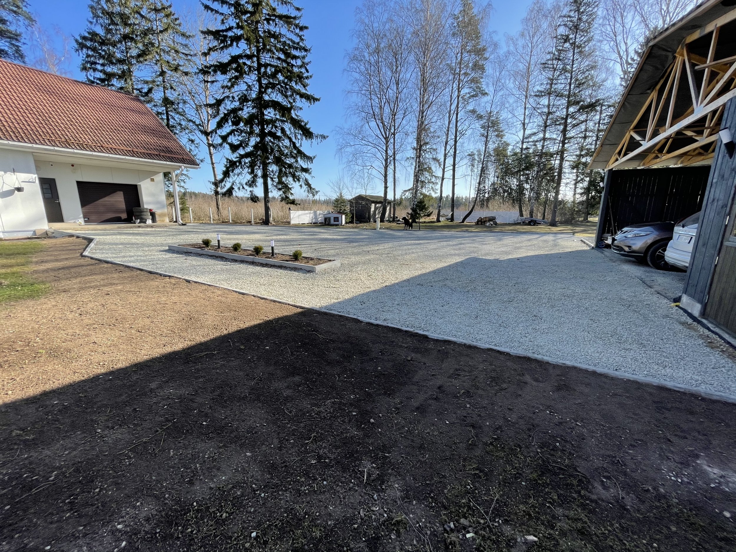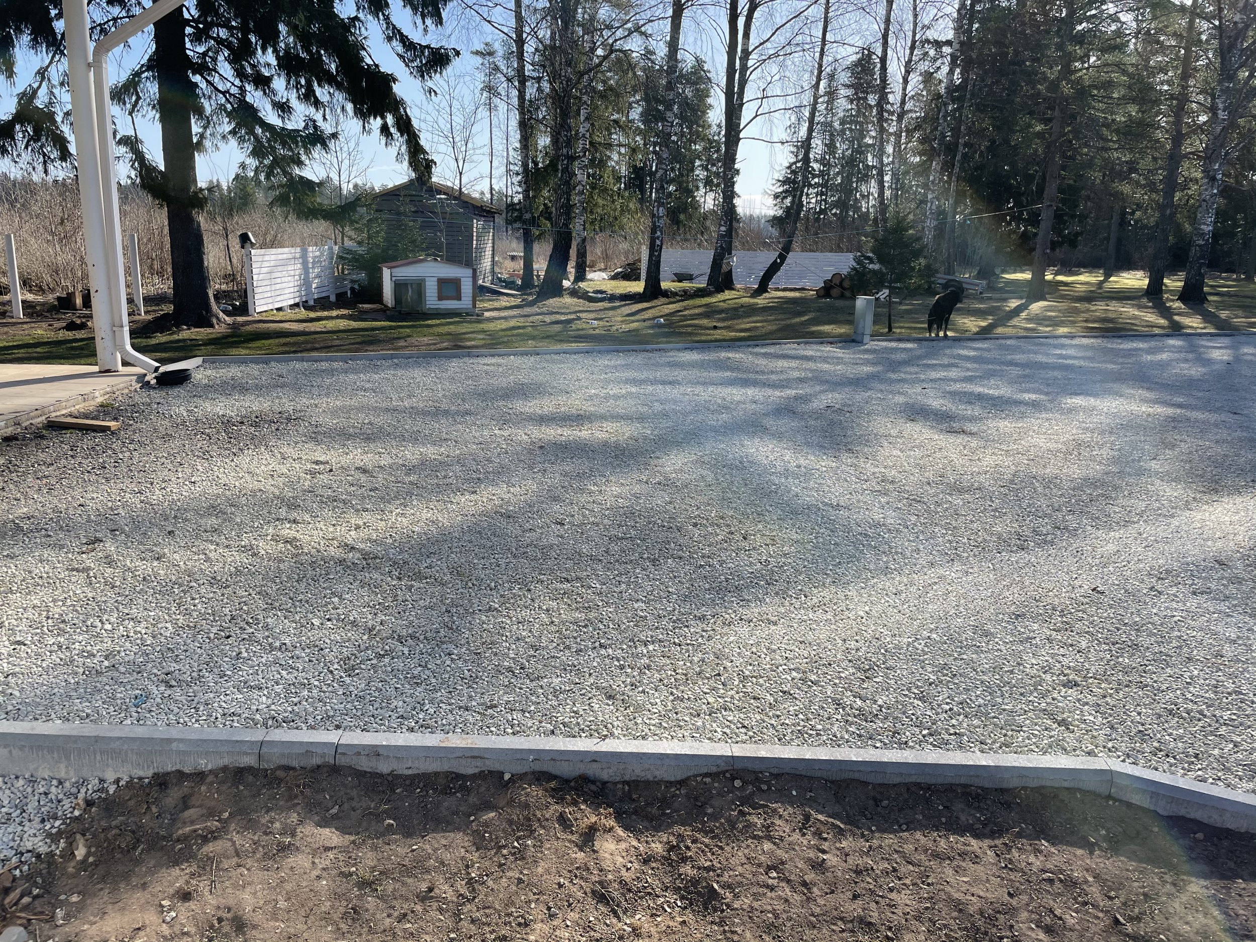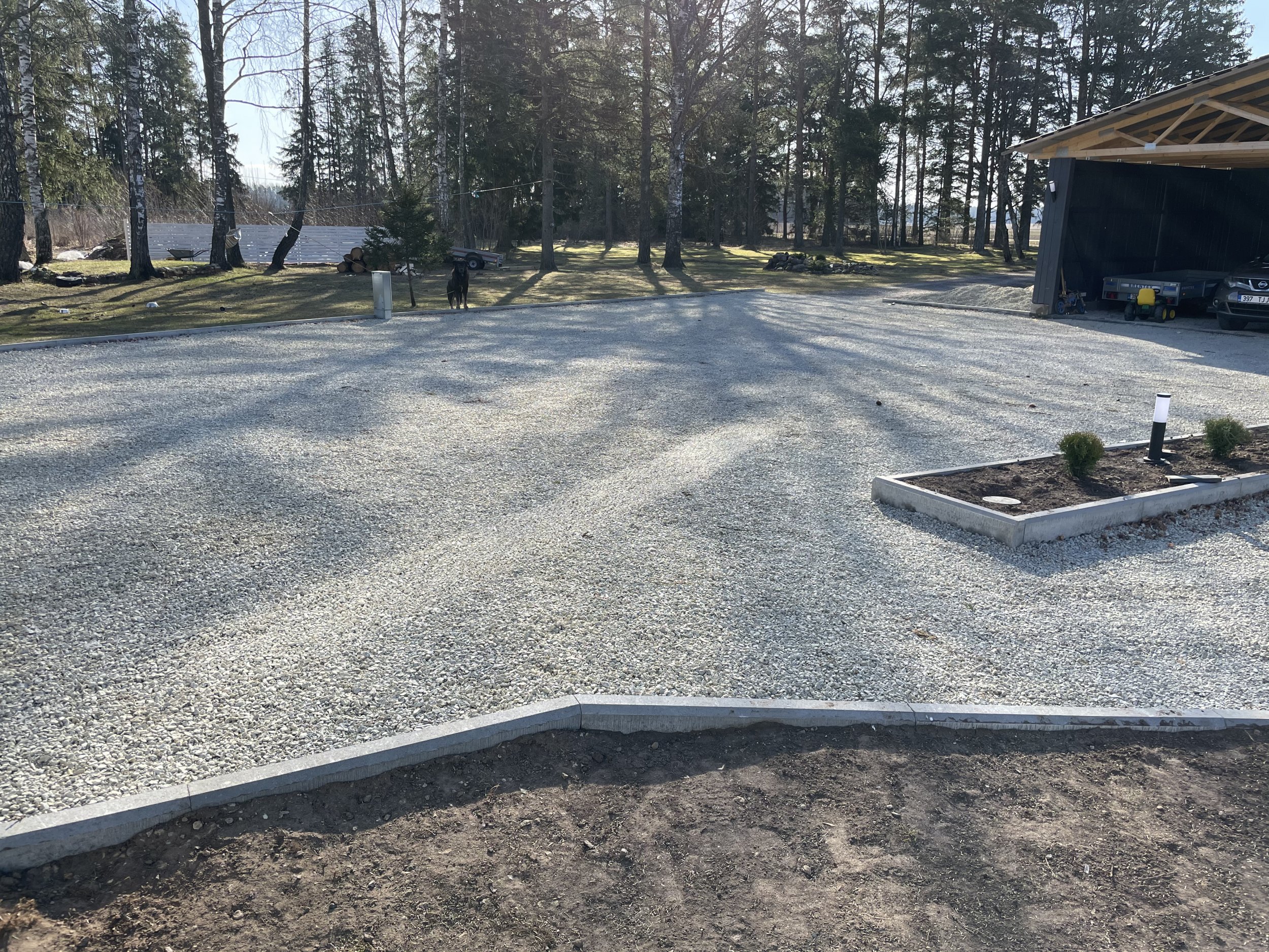 Plats, ca 300m2, äärekivid paigaldatud ja kalded killustikuga paika sätitud. Edasi vaja sõelmetega viimane lihv ja kivi ladumine. Kivi - Nunnakivi. Töö teostamine soovituslikult mai keskel.