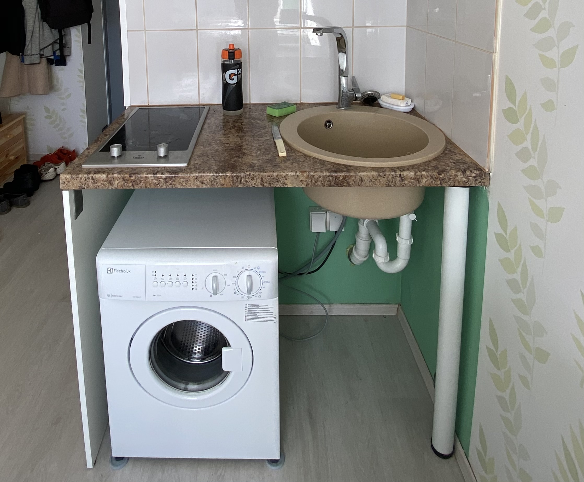 Köögi tasapinna külge ehitatud kahe uksega kapp, mis uste sulgemisel varjaks ära pesumasina ja torustiku või terve köögitasapinna ümber vahetus ja uue kapi pakkumised.