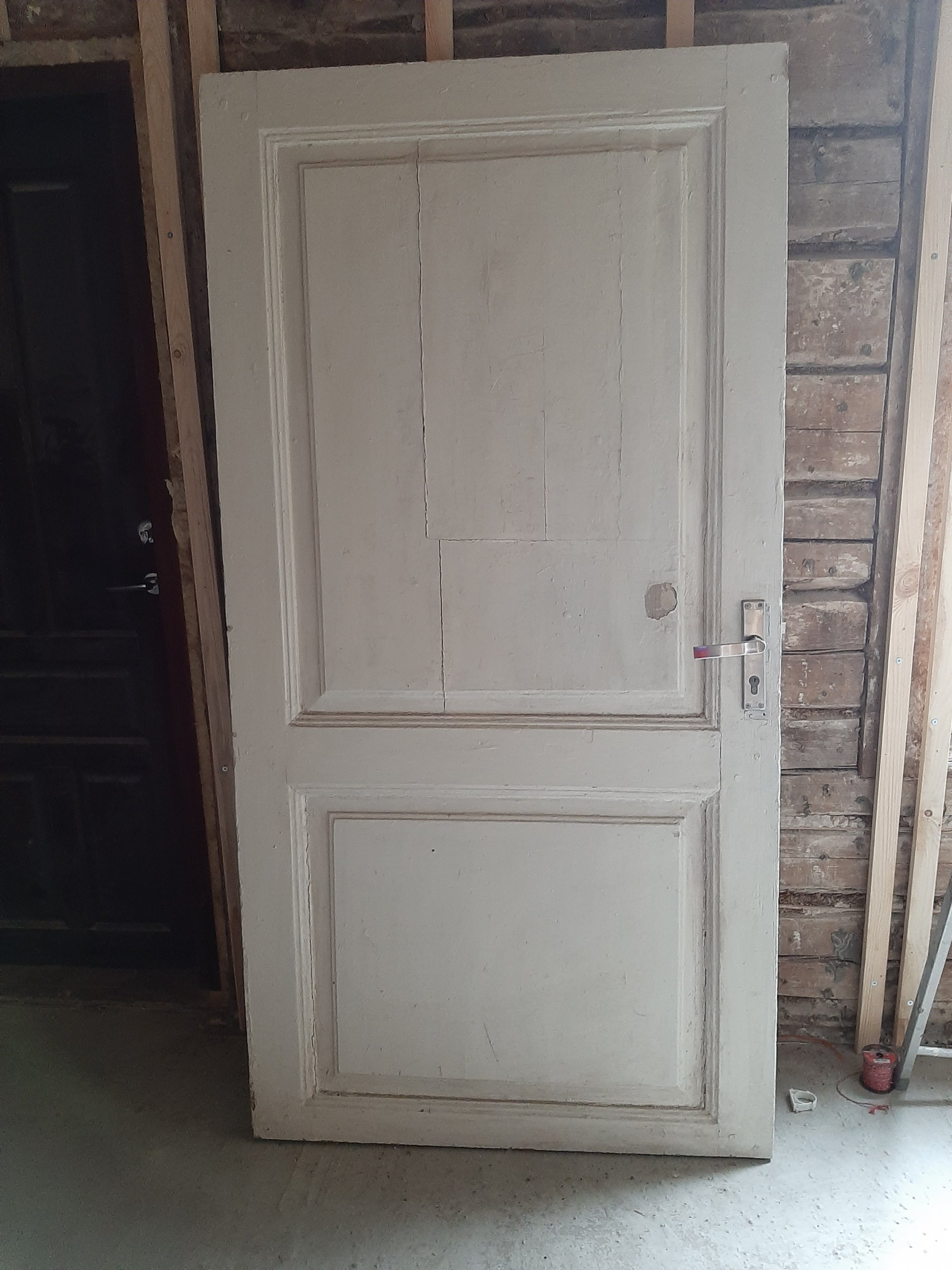 Siseukse kohandamine standardlaiusesse 80cm, muud mõõdud jäävad samaks. St ukseplaatide eemaldamine raamist, mõõtulõikamine, freesimine ja seejärel uuesti raamiga sobitamine. Ukse originaalmõõt 98,5 x 194,5 x 4,5 cm. Ukse restaureerimine - vana värvi eemaldus ning seejärel sobiv viimistlus vastavalt spetsialisti soovitusele (peitsimine, õlitamine vms naturaalne viimistlus) olenevalt sellest, milline on uks pärast värvi eemaldamist. Vastavalt uuele mõõdule ukselengide tegemine (vana on alles kuid eemaldamisel kahjustatud - ei pruugi olla taastatav).