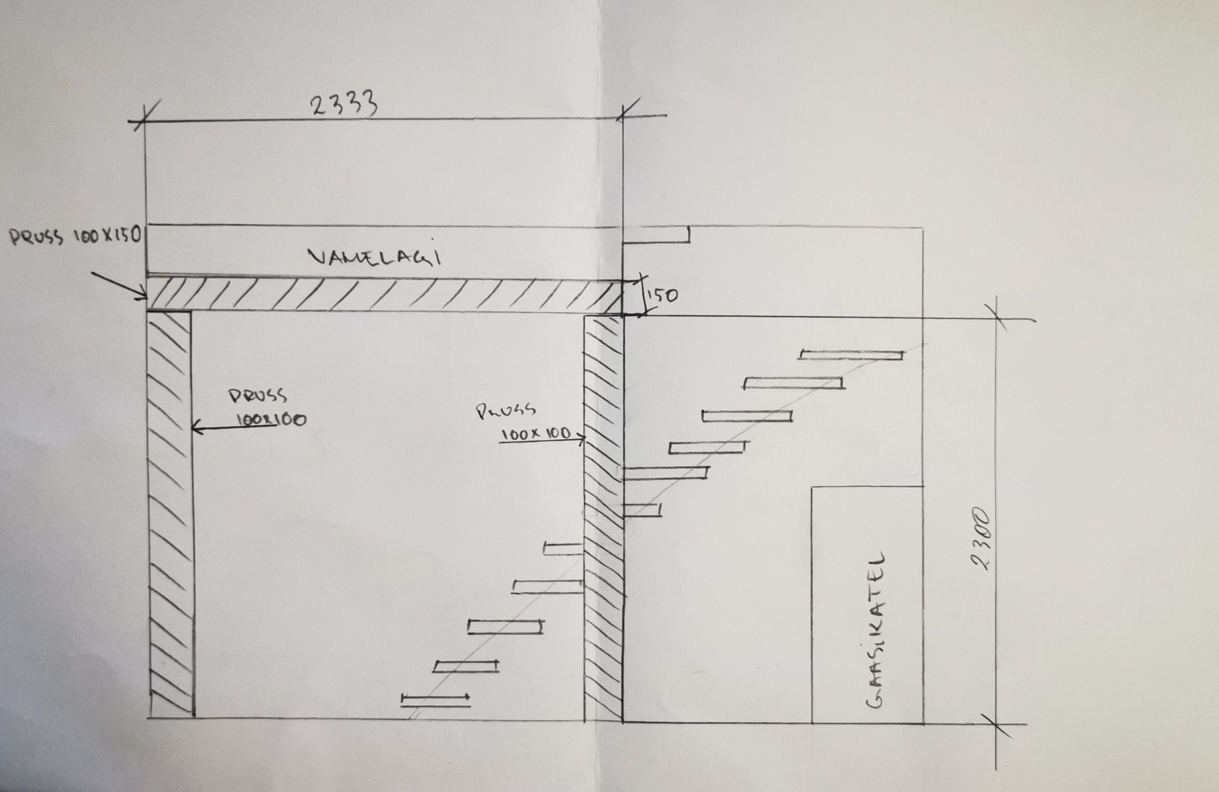 Seoses korteriomandi ehitusjärgse seadustamisega on tarvis toestada korteri esikus olev vahelagi. Lae keskele asetatakse 100 x 150 pruss, mis toetub otstest kahele 100 x 100 prussile. Prussid peavad olema kuivad, servad faasitud ning viimistluseks valge värv. Kuna postid toetuvad põrandale, milles on põrandakütte torud, siis kruvisid kasutada ei saa. Vasakus seinas kandva posti kohal on IKEA jalanõu riiul, mis tuleb ilmselt lahti võtta ja peale talade paigaldust tagasi monteerida.
