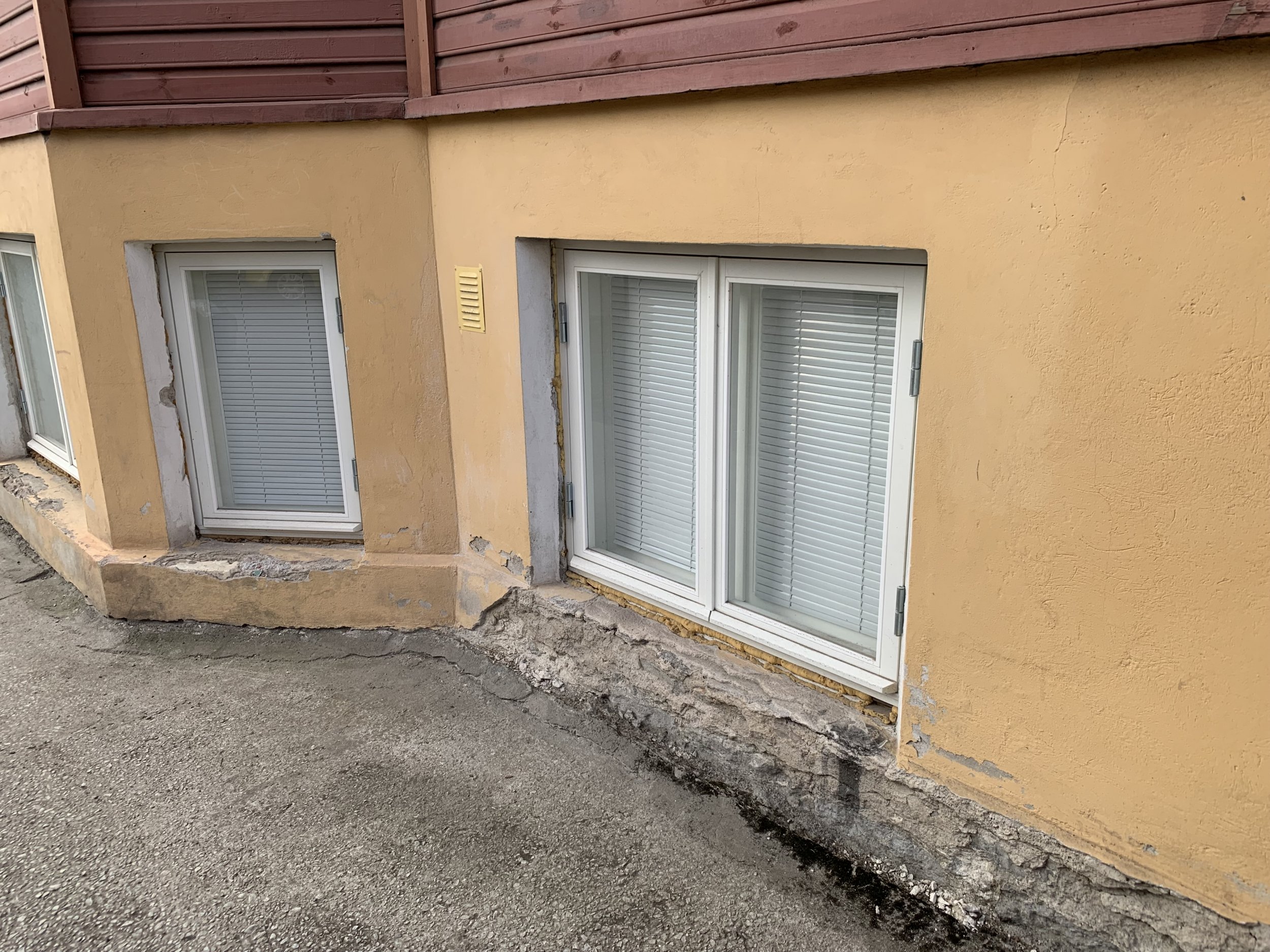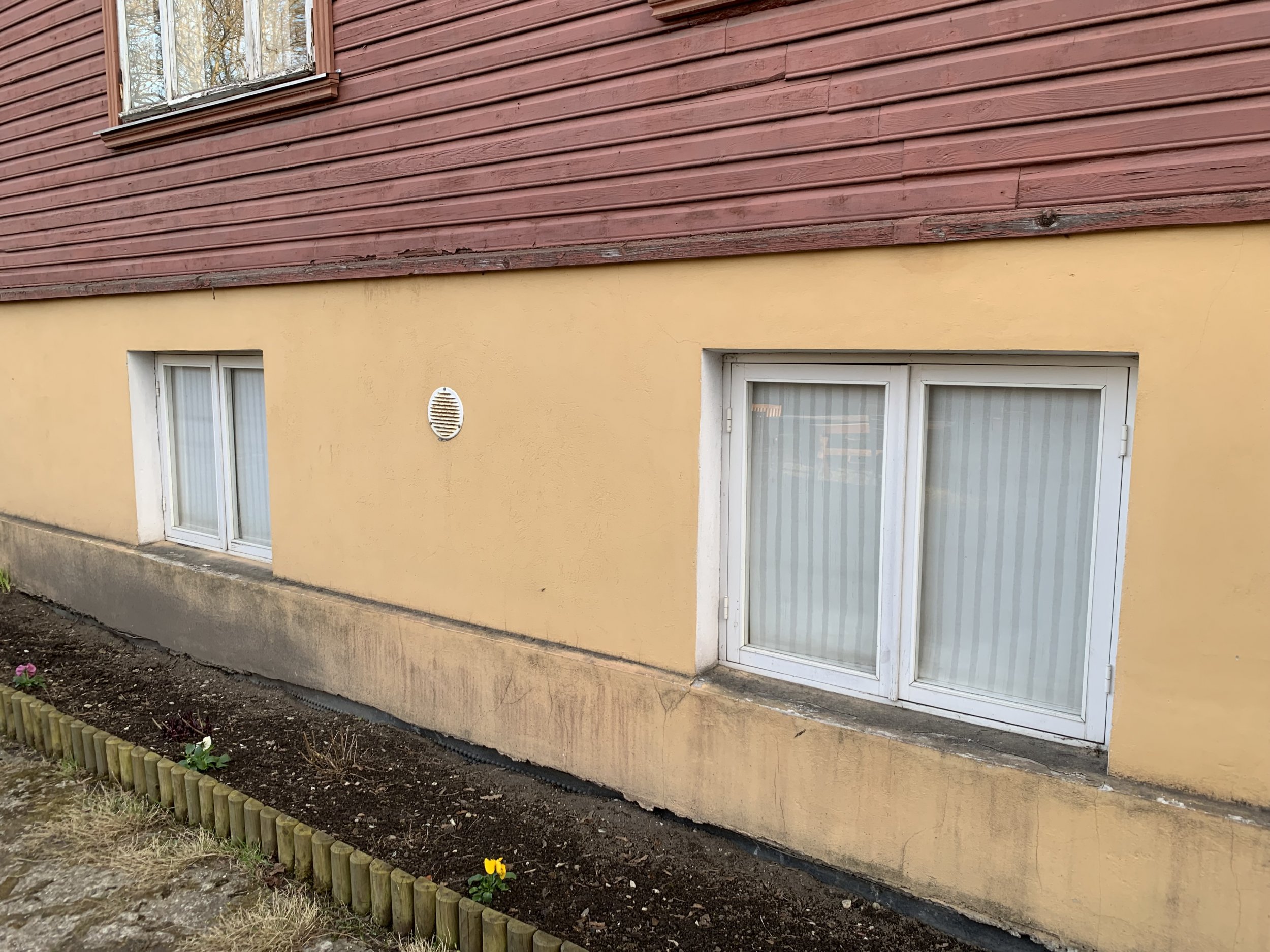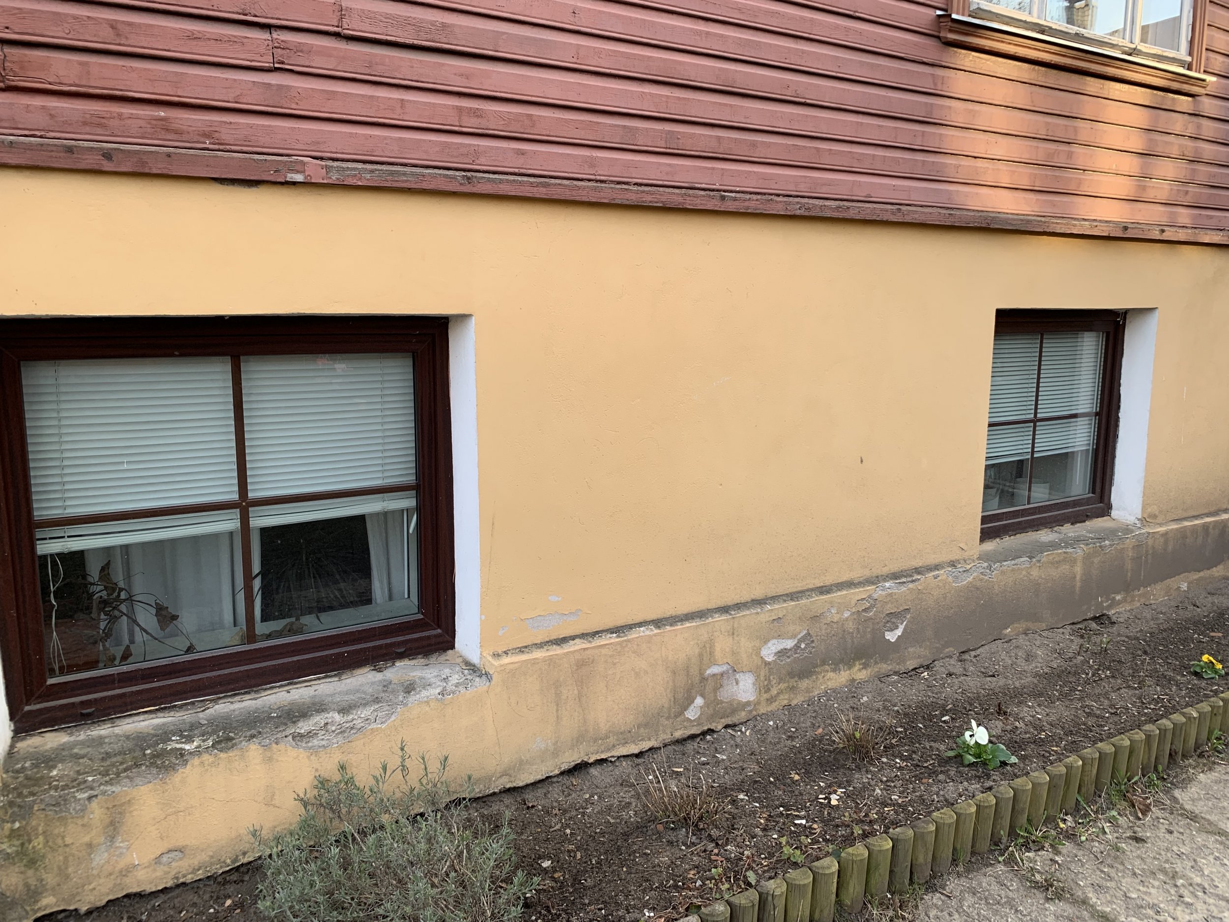 Maja mõõdud on u 20x13 meetrit ja sokli kõrgus maapinnast ligi 2m koos akende ja ustega, üle poole ulatuses krohv enamvähem püsib, rohkem on maas akende juurest, kuhu tuleks ilmselt paigaldada ka plekid, sest ilma lagunes kiiremini (viimati krohvitud 2006, aga juba lagunenud). Nii et päris paarisadat ruutmeetrit ei tule kokku reaalselt, aga peab läbi koputama, palju veel lahtist on. Tänava pool tuleb tagada maapinna juures kalle, et rennidest tulev vihmavesi maja alla tagasi ei imbuks.