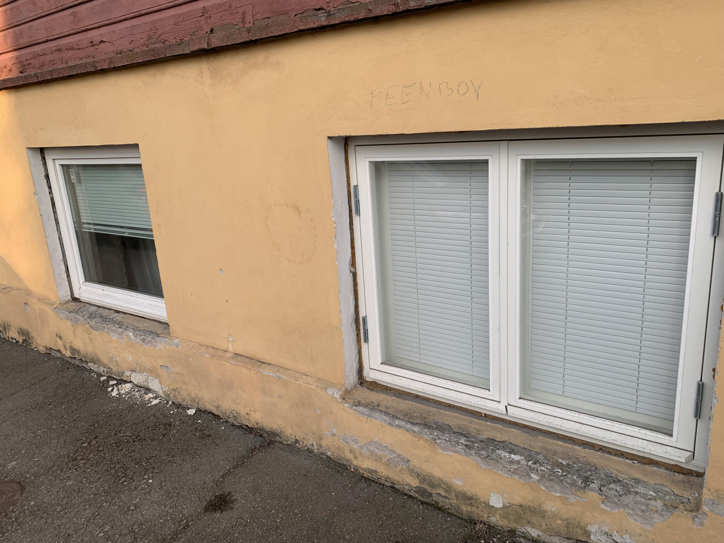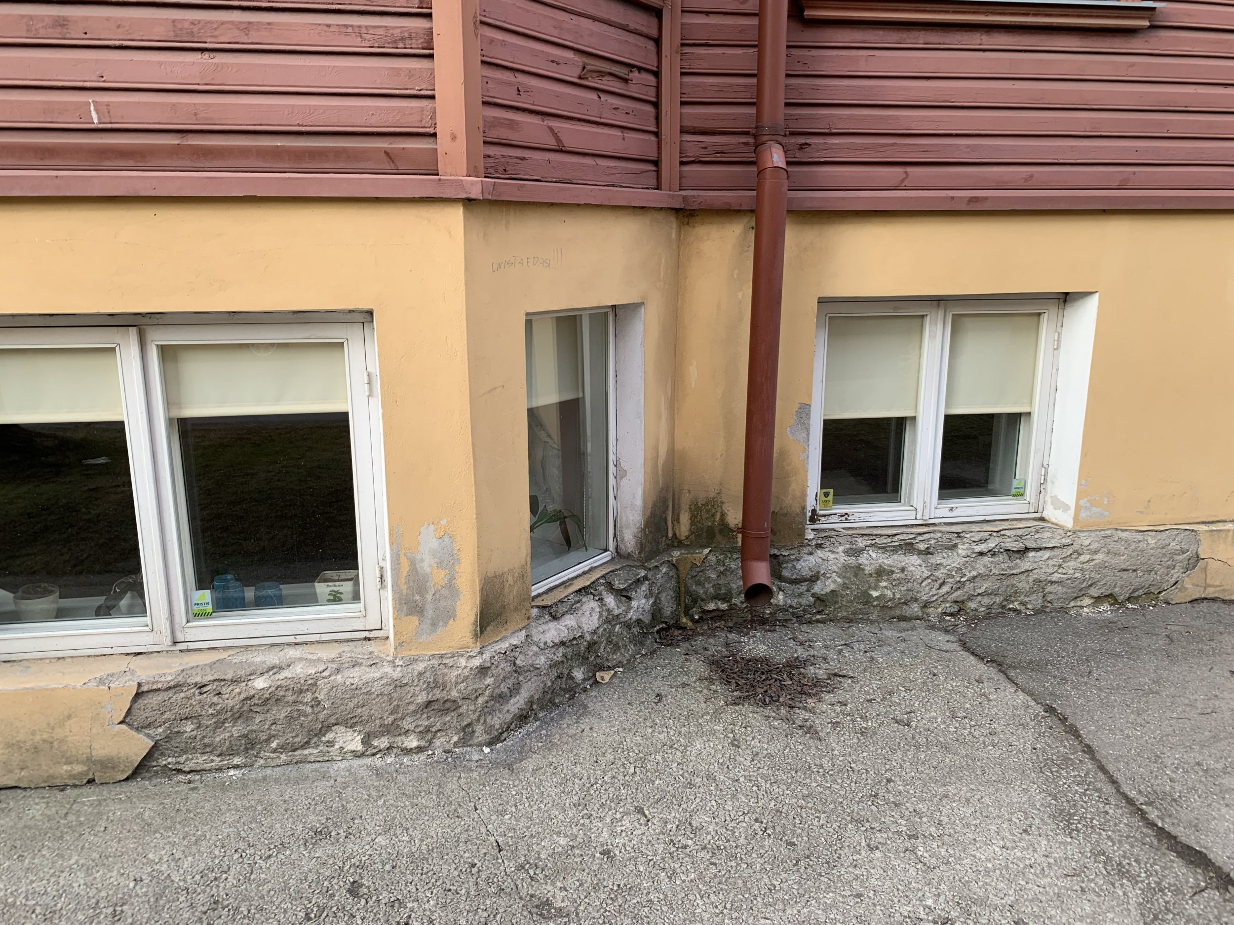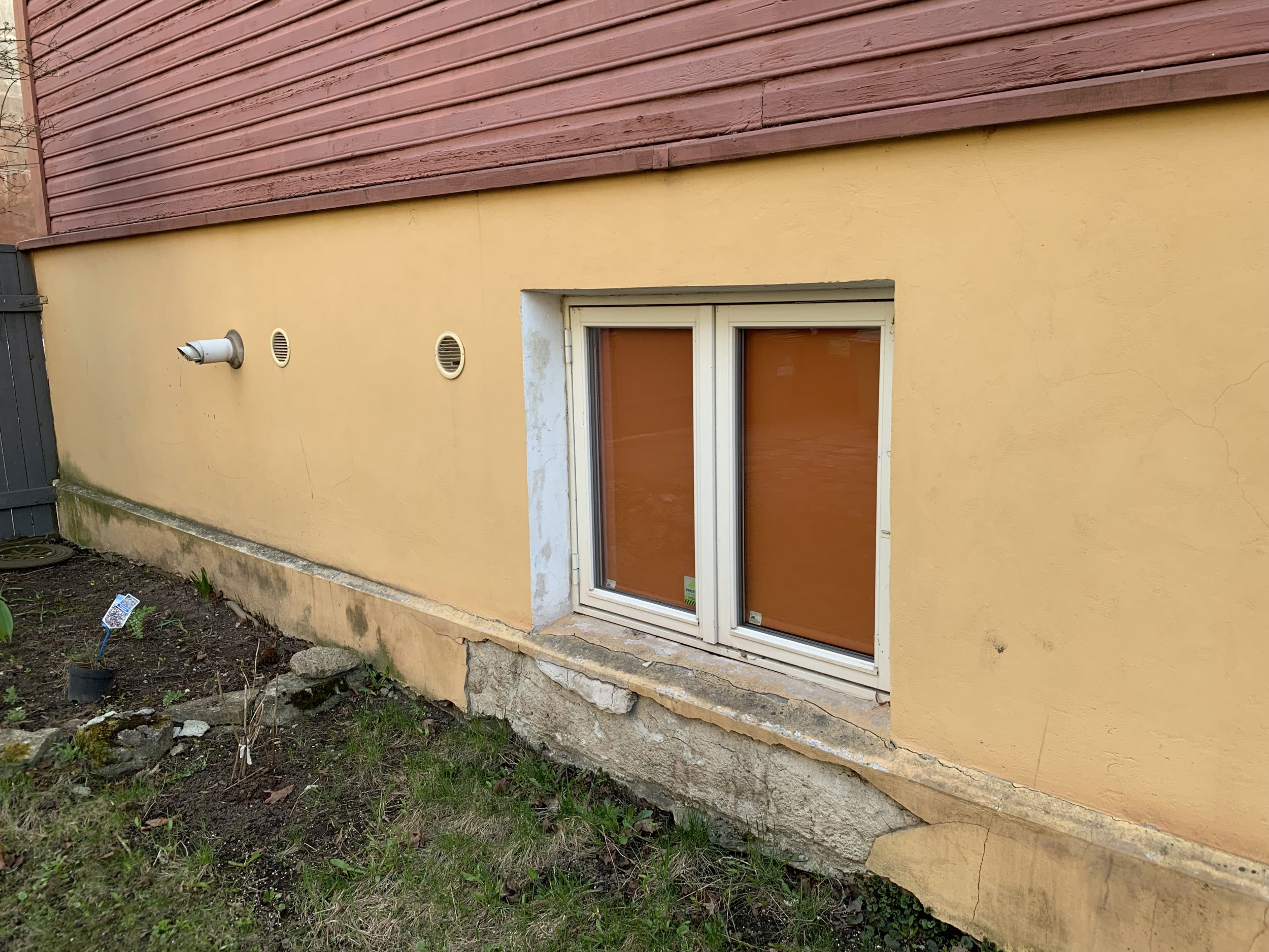Maja mõõdud on u 20x13 meetrit ja sokli kõrgus maapinnast ligi 2m koos akende ja ustega, üle poole ulatuses krohv enamvähem püsib, rohkem on maas akende juurest, kuhu tuleks ilmselt paigaldada ka plekid, sest ilma lagunes kiiremini (viimati krohvitud 2006, aga juba lagunenud). Nii et päris paarisadat ruutmeetrit ei tule kokku reaalselt, aga peab läbi koputama, palju veel lahtist on. Tänava pool tuleb tagada maapinna juures kalle, et rennidest tulev vihmavesi maja alla tagasi ei imbuks.