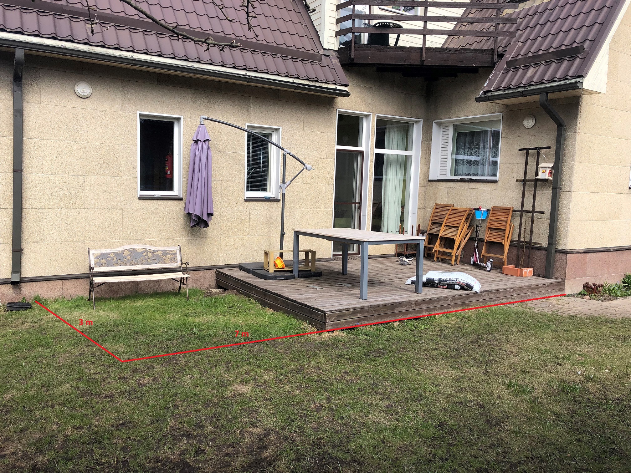 On vaja renoveerida ja laiendada terrass. Praeguse terrasse mõõdud - u 4.5 x 3 meetrit, on vaja kõik puudetaile (lauda ja prussi) vahetada ning ka laiendada terrassi et ta oleks u 7 x 3 meetrit (kokku ~21m2), kõrgus 25 sm. Peaks olema võimalik kasutada praeguse terasse vundament, aga ta peaks ka olla laiendatud. Terassi lauad\prussid peavad olema immutatud.