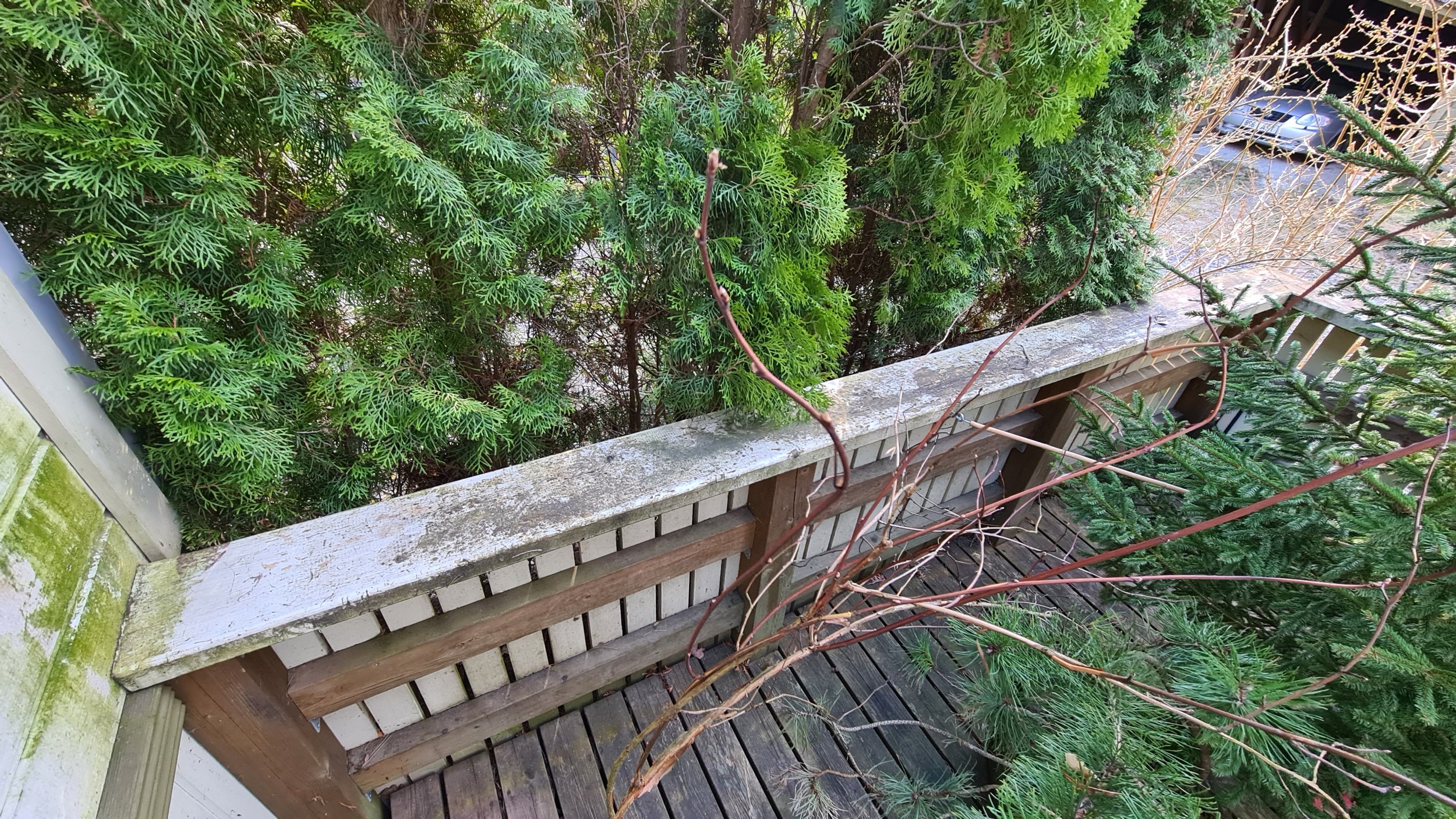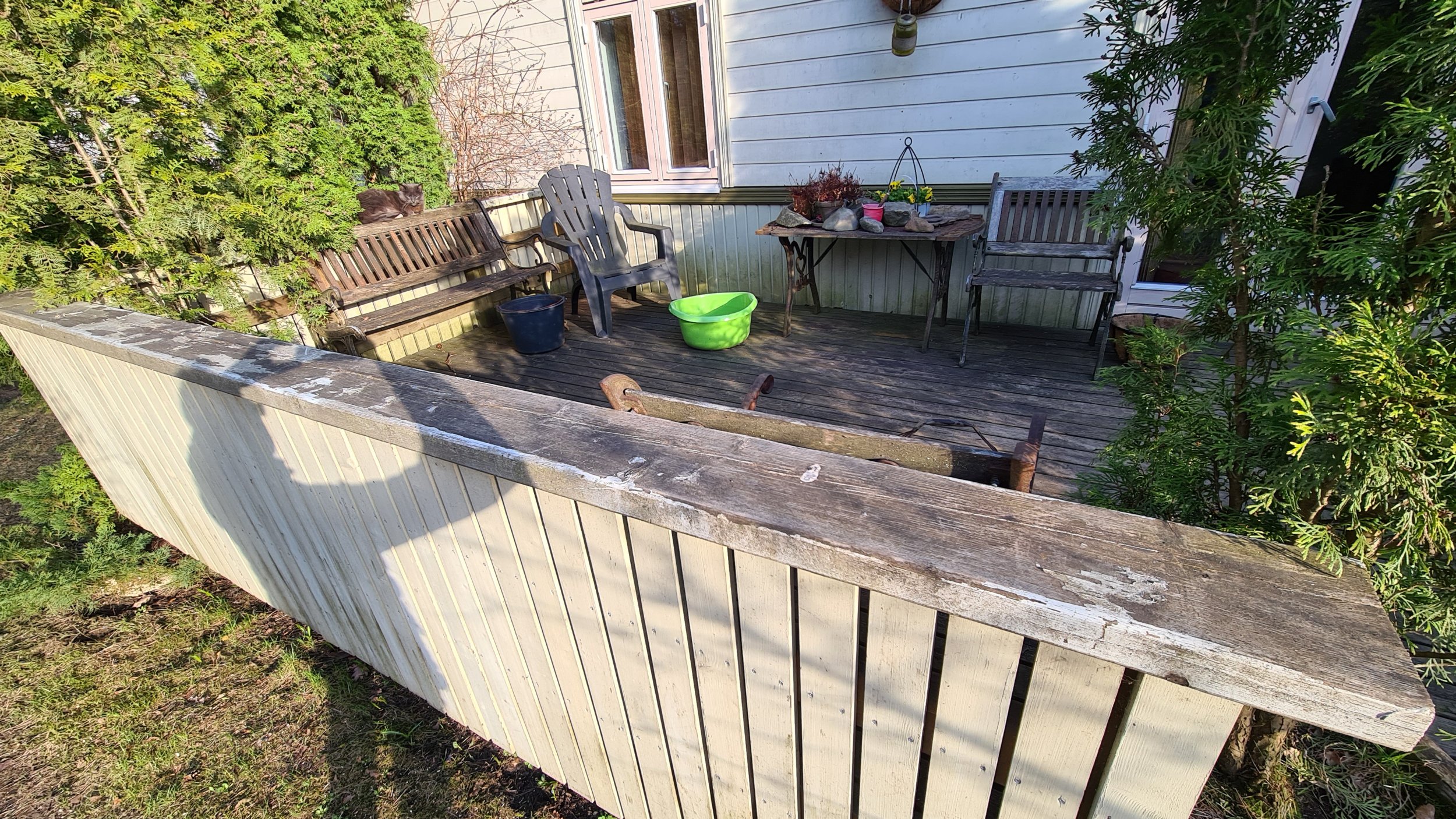 3. Puhastada, lihvida ja üle värvida terrassi piirde pealne paneel (3+6+3 = 12m)(vajab terrassi äärsete puude - elupuud - eemale painutamist? ... igal juhul neid ei saa eemaldada lõplikult/maha raiuda.