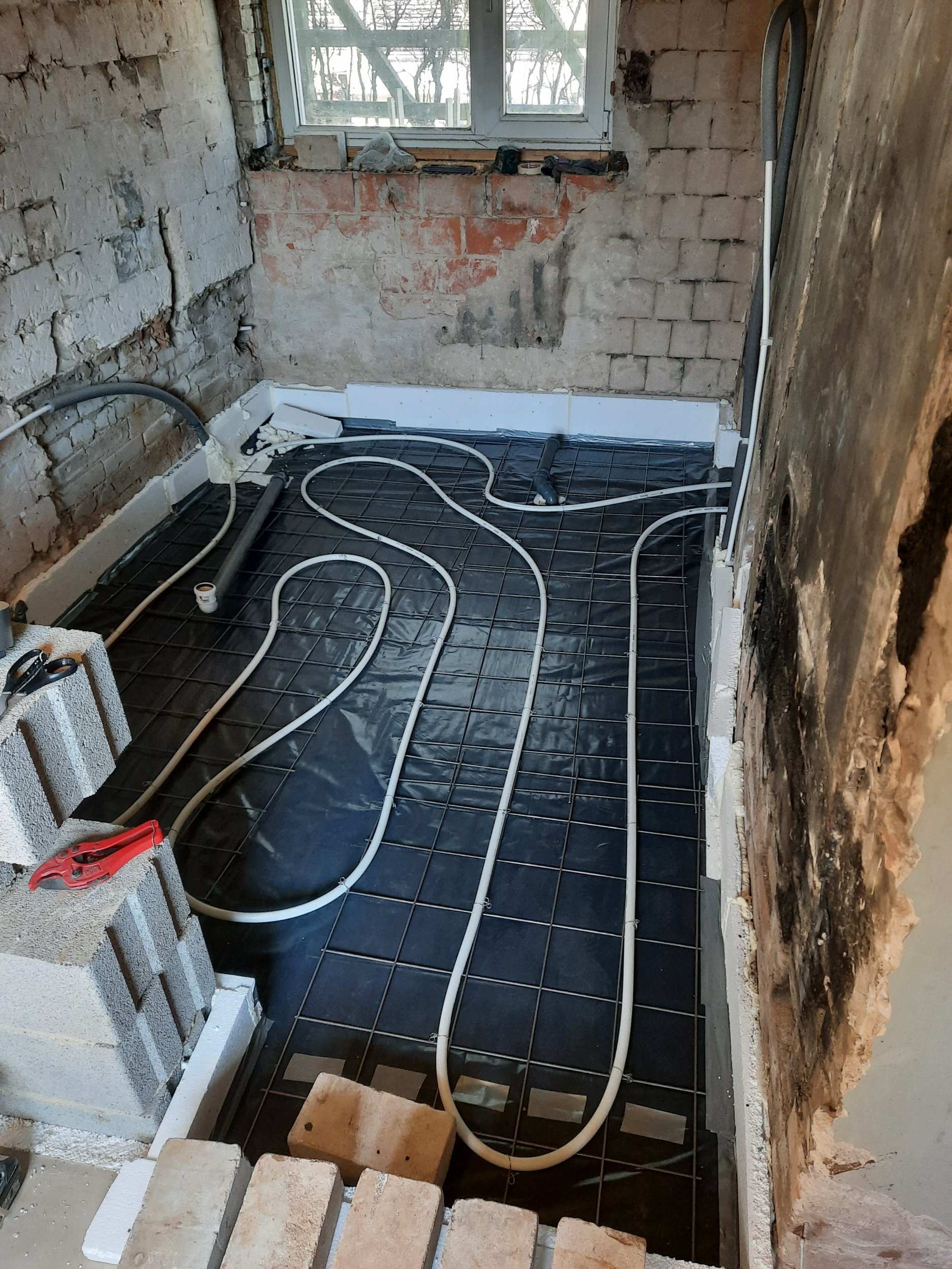 Eramu sauna dushiruumi ja leiliruumi põranda valamine. 2 ruumi, põrand on ühendatud, küttetorustik on paigaldatud ja seinad isoleeritud.