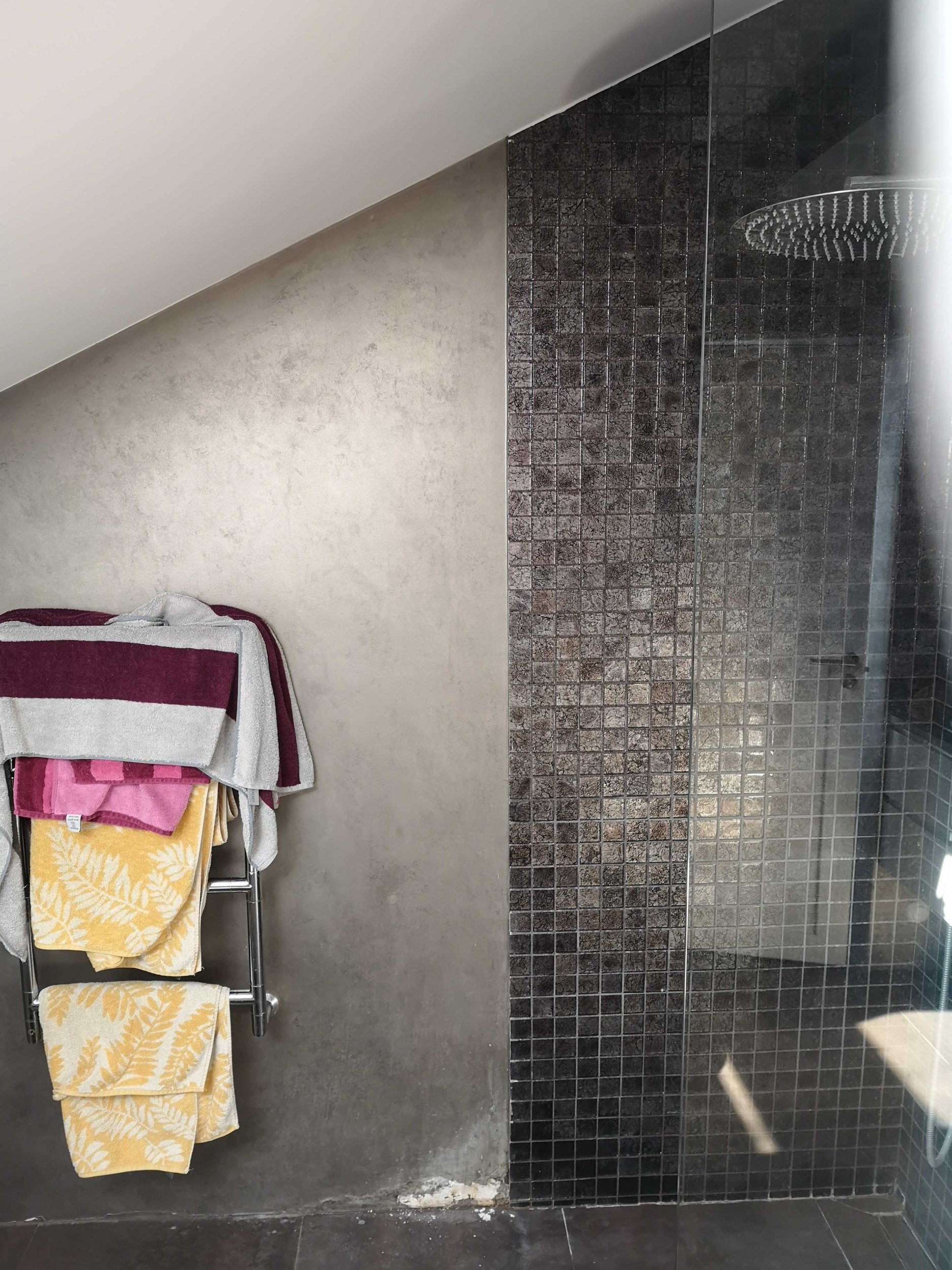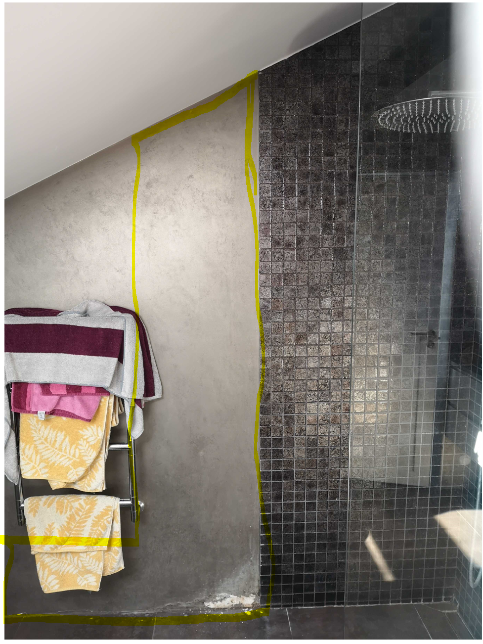 Vannitoas hetkel osaliselt sein plaaditud ja osaliselt värvitud. Vaja plaaditu ala pikendada, kuna värv kipub lahti kooruma. Vajalikud plaadid ja vuugivahed olemas.