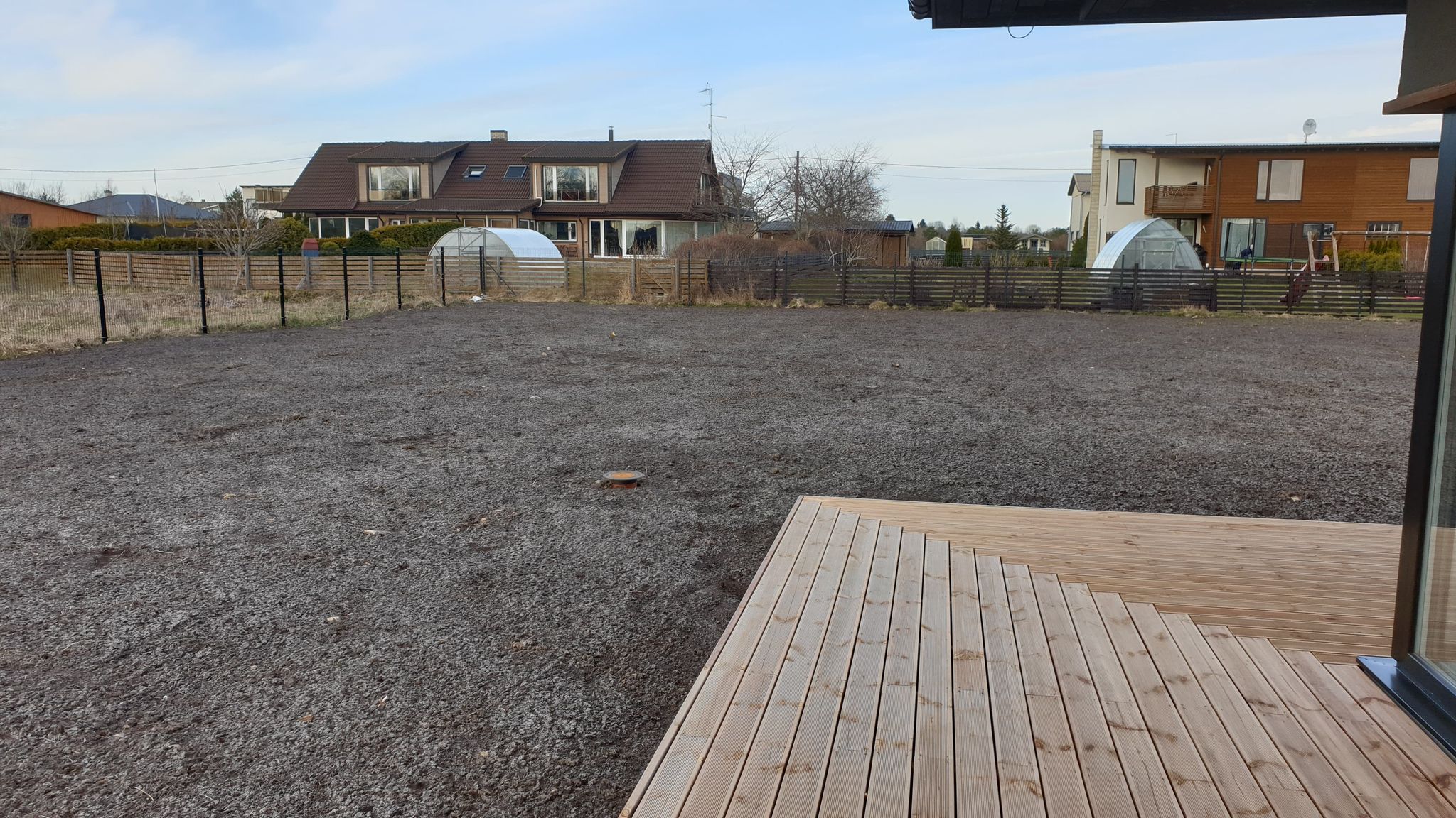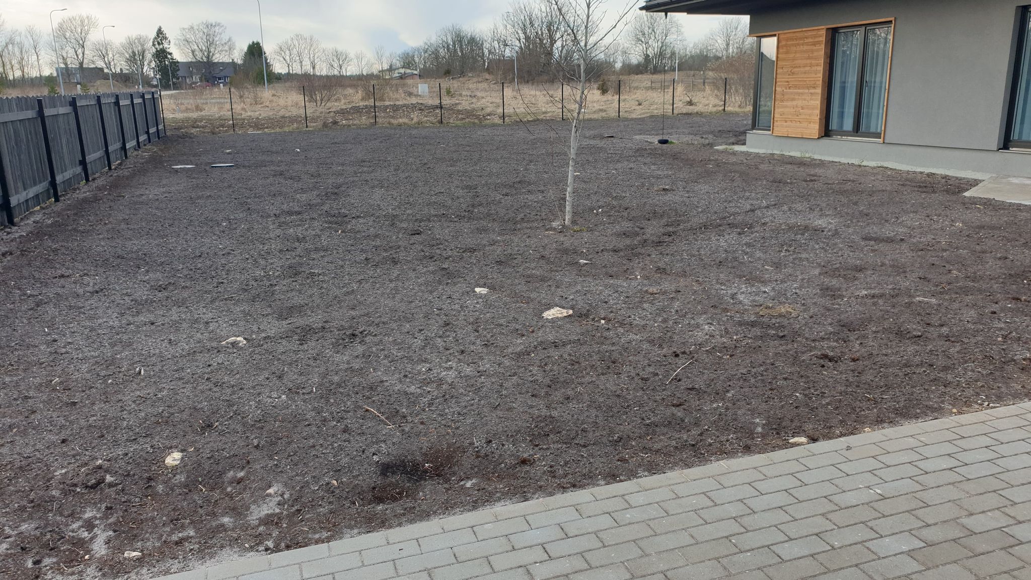 Me ostsime eelmisel aastal maja, Tallinna külje alla ning arendajate lubadus oli ka muru see kevad maha külvata. Hetkel oleme seisus, kus muru on külvamata ning otsime kedagi, kes meid sellega aidata saaks. Meil on arendajate poolt kohale toodud ja laiali laotatud mullakiht ning üldine ettevalmistus on tehtud. Meie krundi pindala on 2000 ruutmeetrit, millest maja ja tänavasillutus katavad umbes 500 ruutmeetrit. Lisasin ka pildid hetkeolukorra kohta.