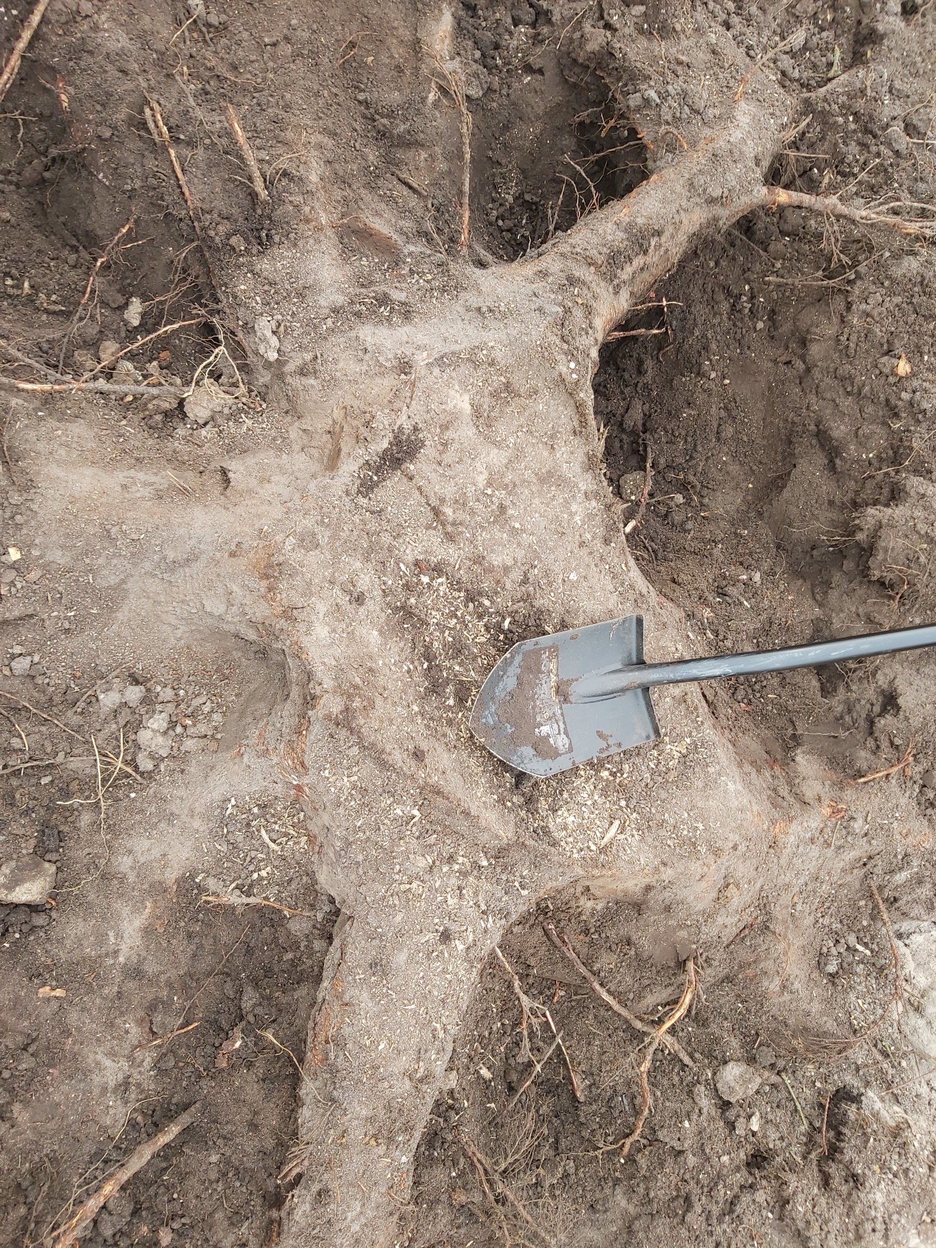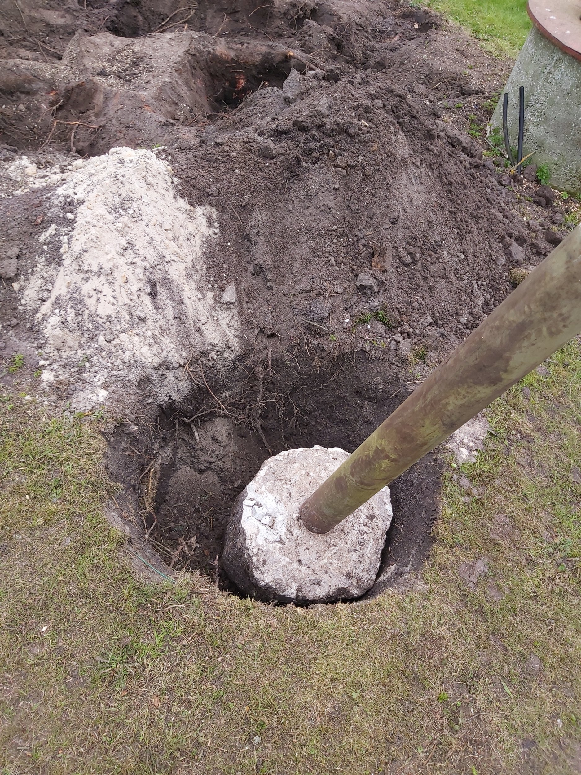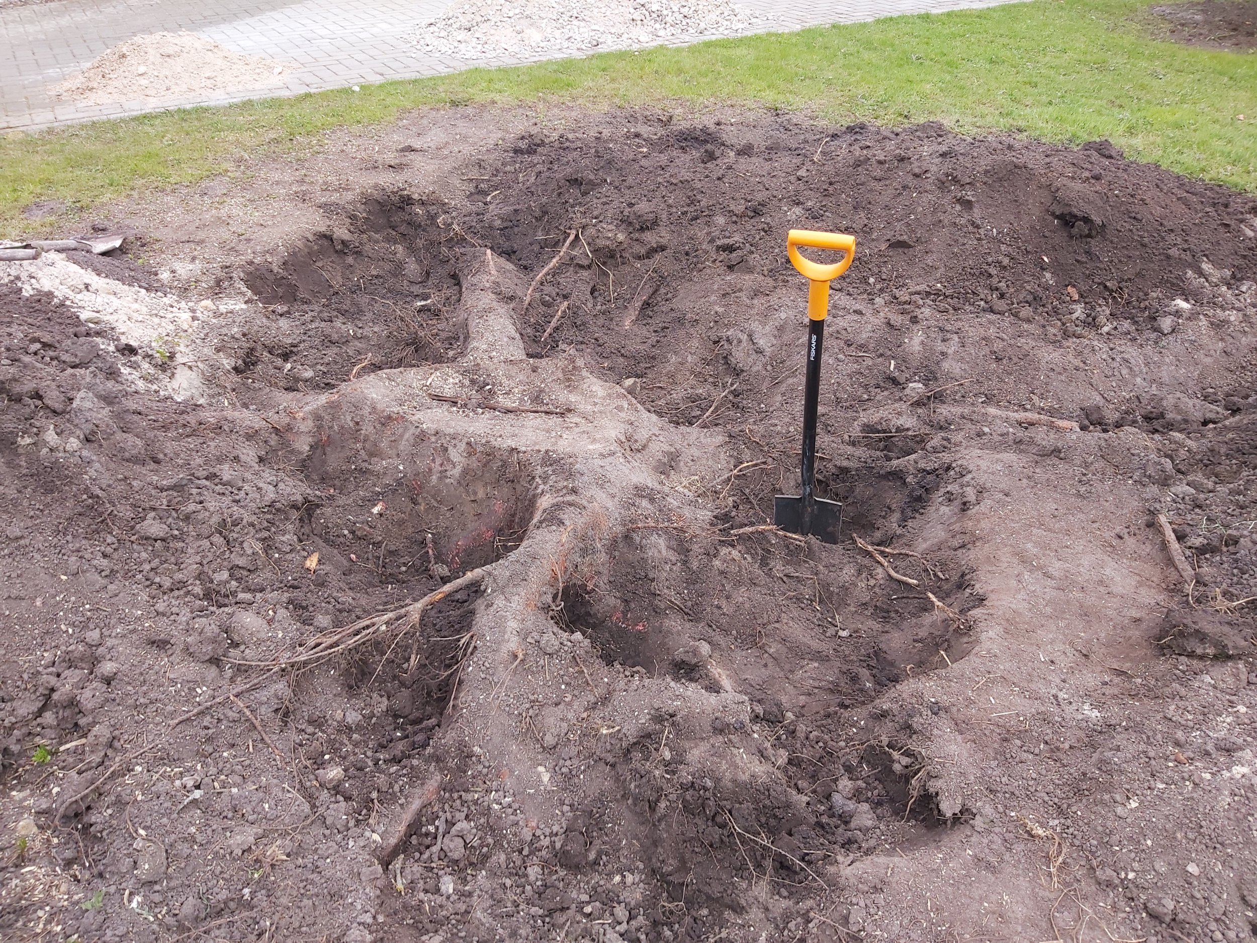 Hõbekuuse kännu eemaldamine täielikult koos juurtega. Ei tea, kas osa freesida ja siis masinaga tõmmata vms. Osaliselt lahti kaevatud. Lopergune mõõt u 50× 70 cm.