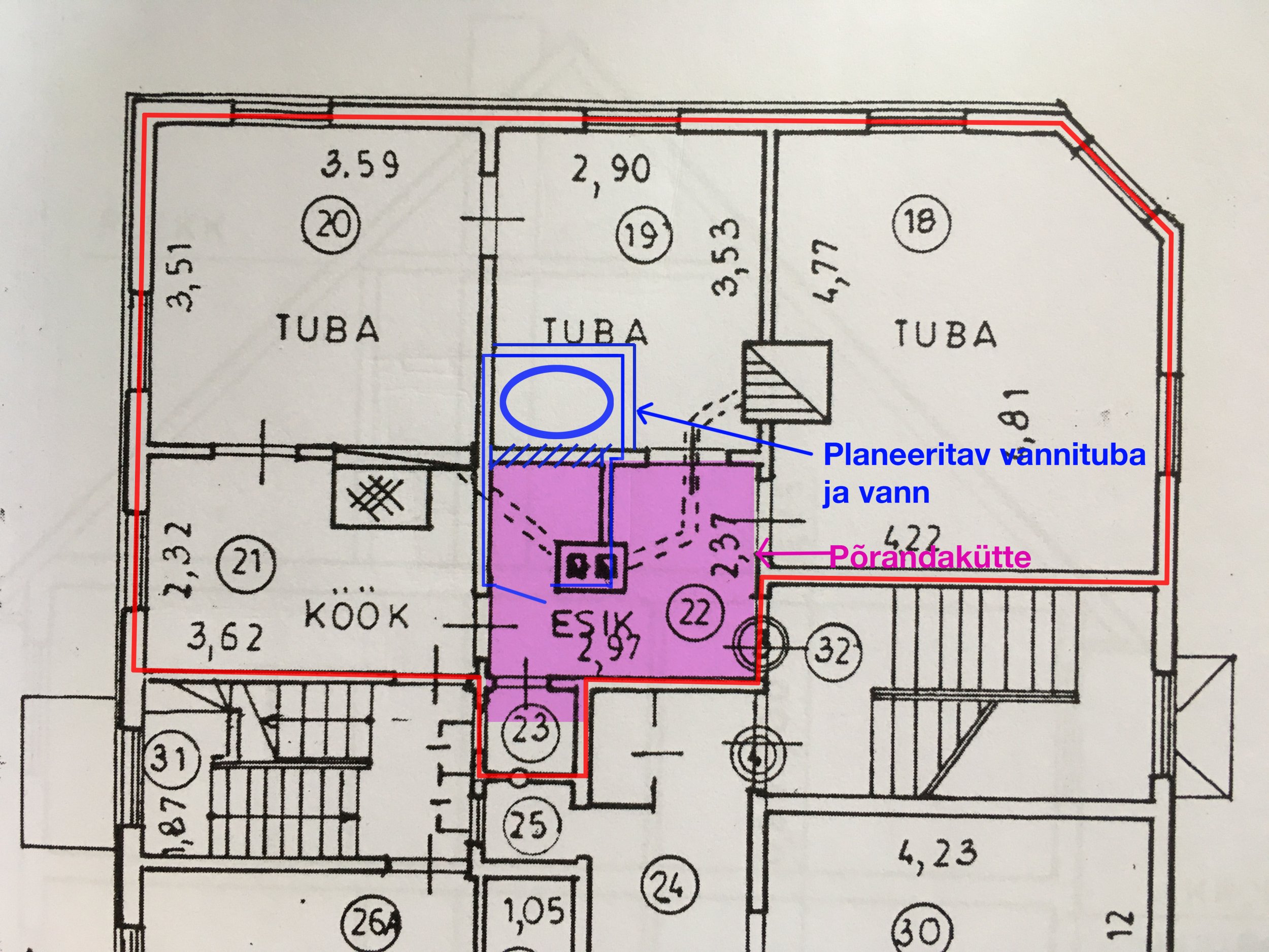 Põrandaküte ala on märgistatud piltidel. Kütet ei soovi wc poti alla ja alles tuleva vanni alla. Olemasolev vannitoa trapp võiks samas kohas jääda.
