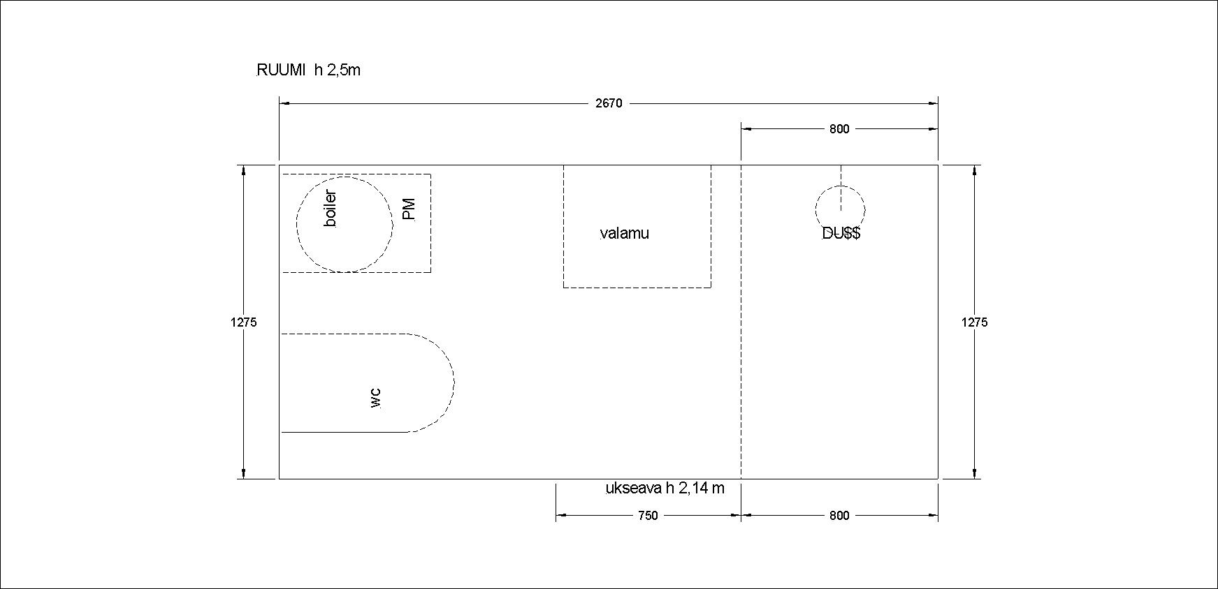 Vaja oleks teostada allolevad tööd puumaja 2.korruse pesuruumis. Mõõdud 2670x1270 h 2500 . Ukse ava on 2100*750.
