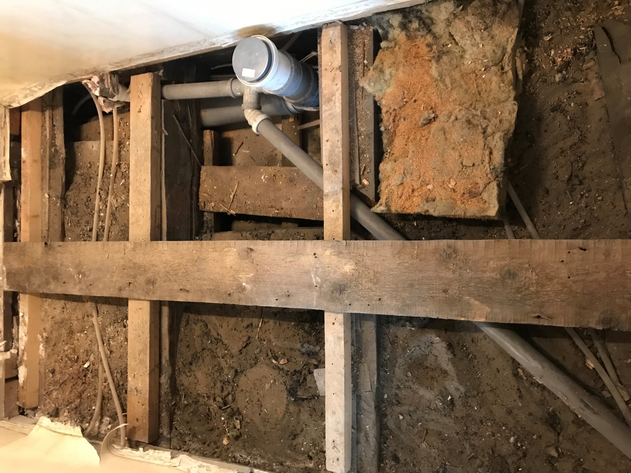 Hetkel on vana põrand lõhutud ja lagi eemaldatud.
