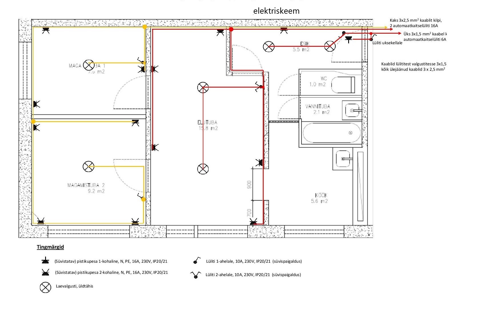 Soovin uute elektrikaablite vedamist koridoris asuvast kilbist kolmetoalise korteri koridori ja kolme tuppa. Korter asub Tartus. Hoone on paneelmaja, seinad betoonist. Tubade ja koridori pindala on 38,1 m2. Köögis, wc-s ja vannitoas on juhtmed vahetatud.