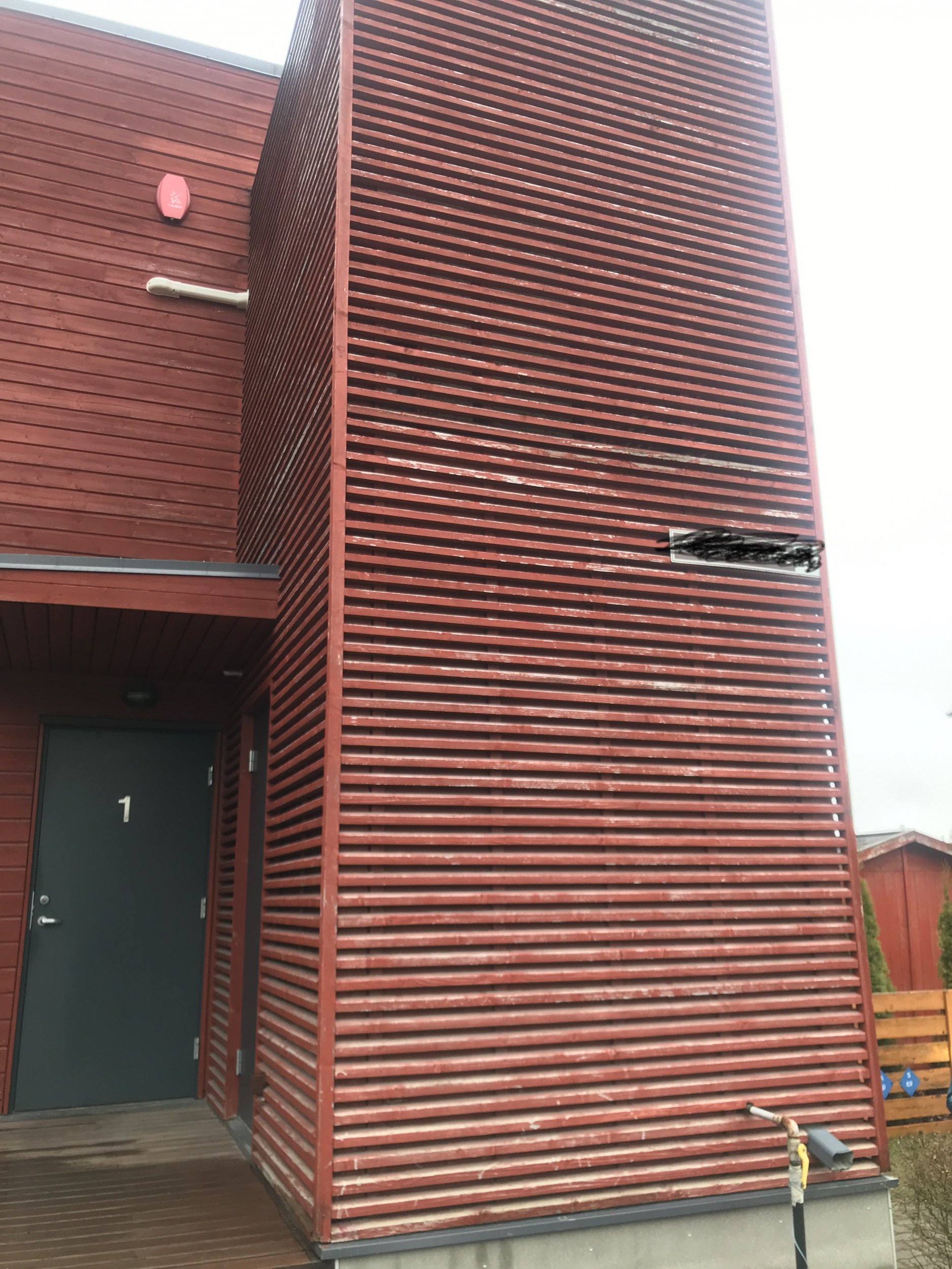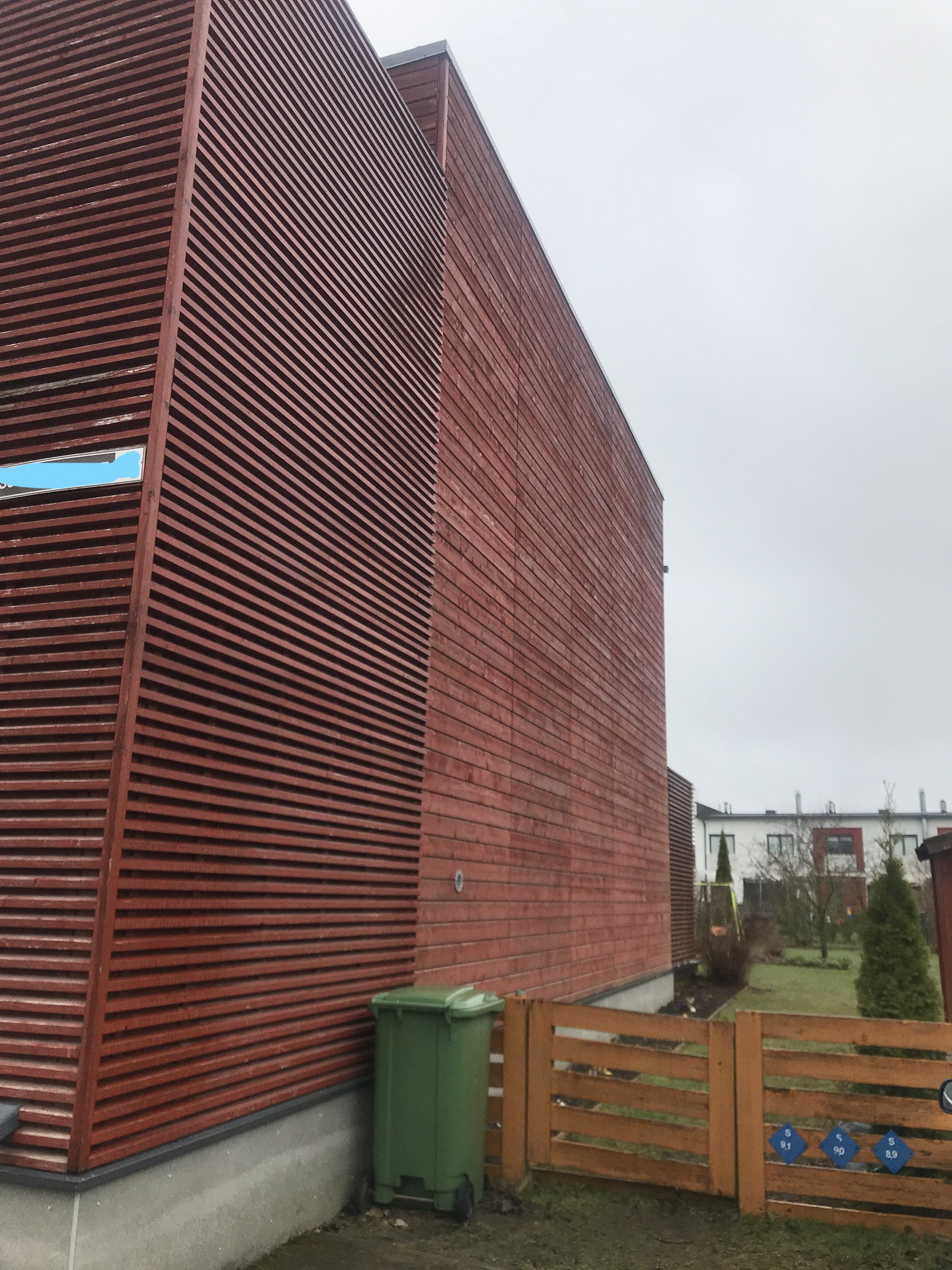 Töö sisu; Tellingud või korvtõstuk, Esemete, mis ei vaja värvimist, katmine kaitsekilega. Puidupinda töödeldakse Vivacolor Special Clean'iga, seejärel pestakse pind tolmu ja mustuse eest kersheriga. Pärast kuivamist värvitakse fassaad uuesti. Kliendivärv, Villa Protekt panipaigale ja majavärv. |