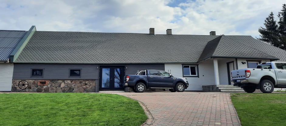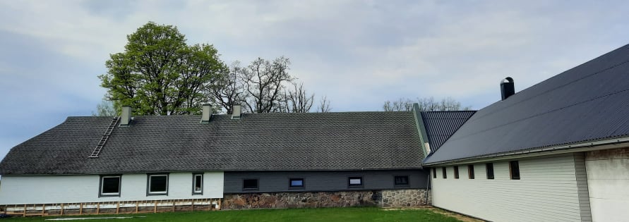 Tegemist on vana taluhoonega - 30mx10m. Harja kõrgus 7 m. Sarikad on korras. Katuse lammutamine (bituumensindel) utiliseerimisega , roovitus, katmine eterniitplaadiga (Leedu eterniit, 1130*2500,grafiit) ,tuulekasti ehitus ja vihmaveesüsteem. Ca 430m2