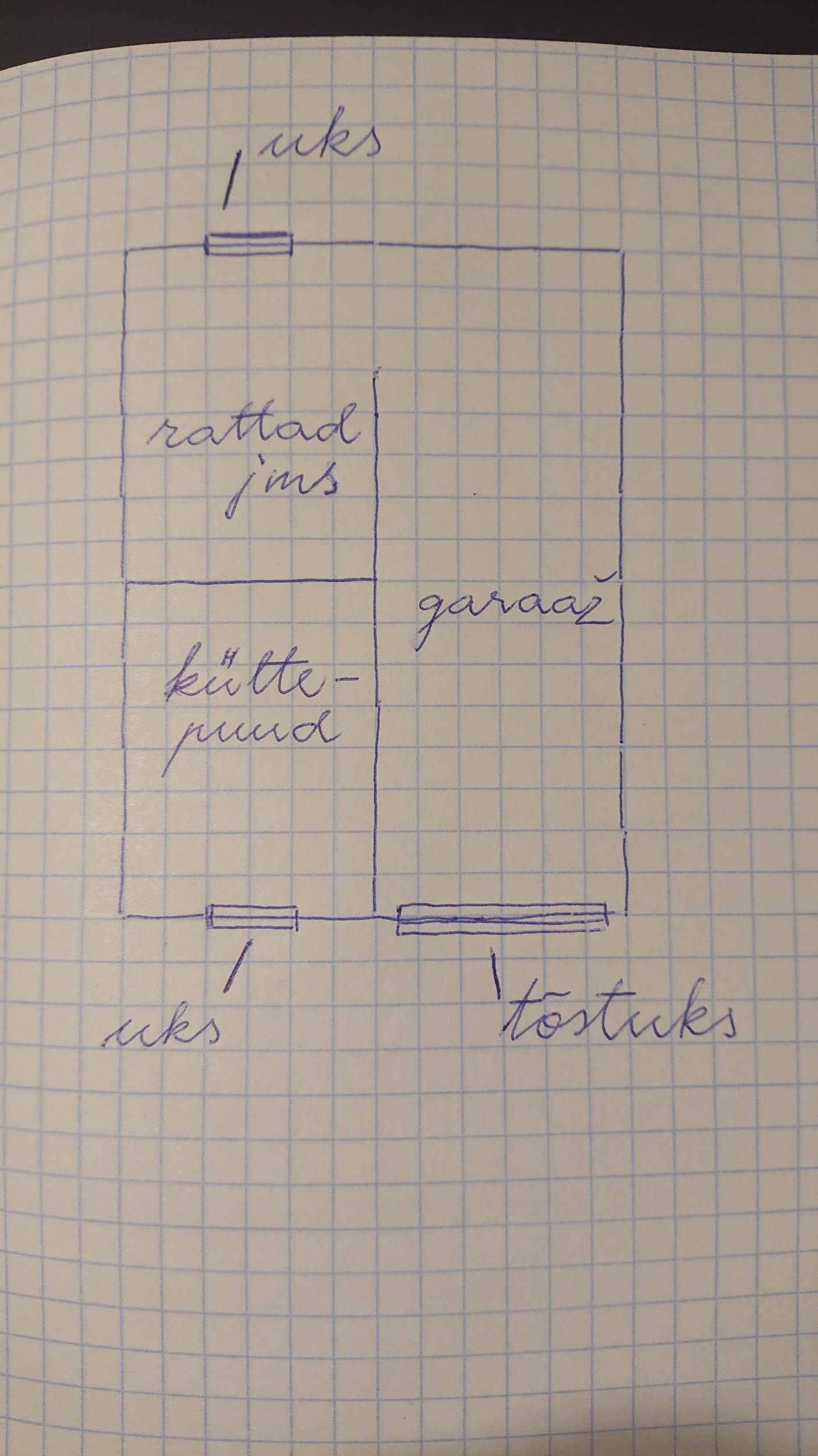 Hoone 6x8 m, vundament kandeseinte all, põrandal kiviparkett, tõstuks ja kaks tavalist ust, plekist viilkatus.