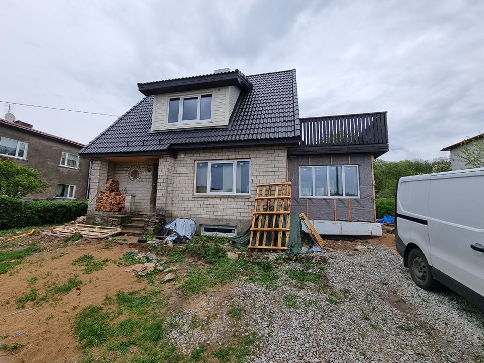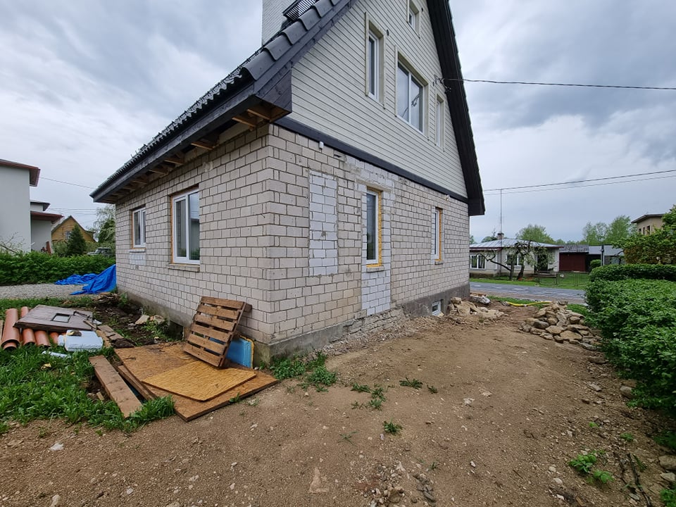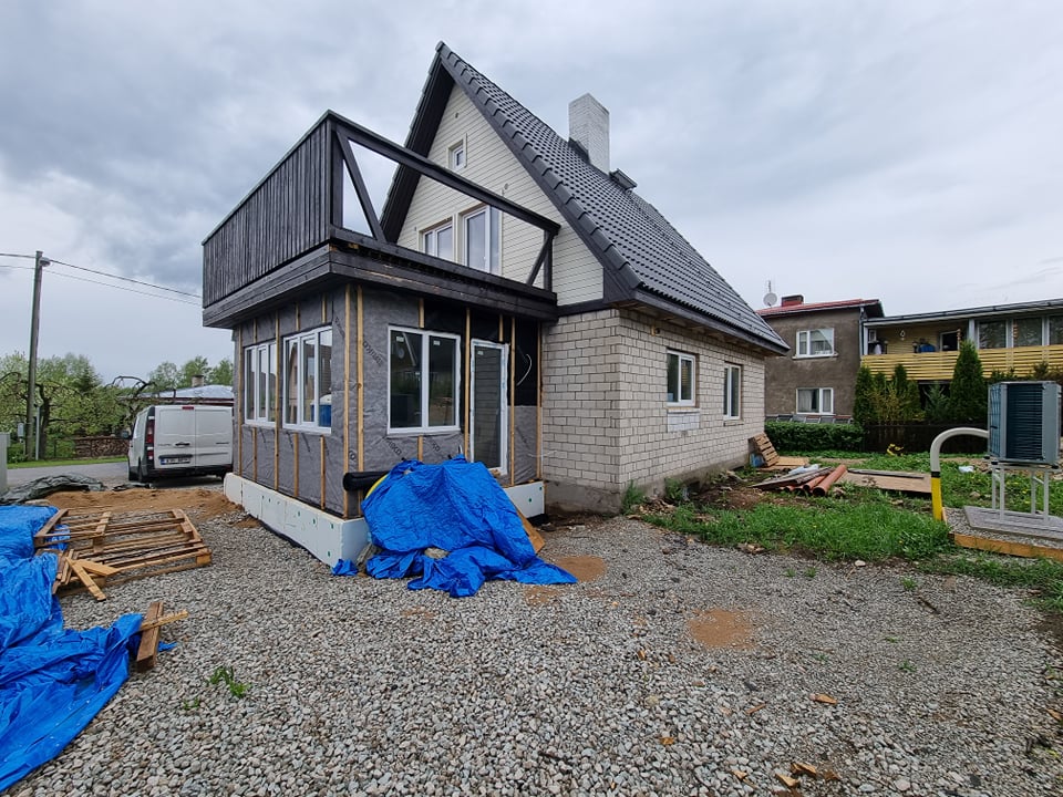 Telliskivi osa rihtida liimiga ja tüüblitega paigaldada 50mm vahtplast, võrk ja hõõrdekrohviga krohvida. (80m2 - avatäiteid pole maha arvestatud). Terrasiosale OSB (piltidel on OSB peale ajutiselt liistuga kinnitatud katuse aluskate) pinnale kinnitada 50mm vill, ja see krohvida sama krohviga mis telliskivi seinaosa (30m2 - avatäiteid pole maha arvestatud).
