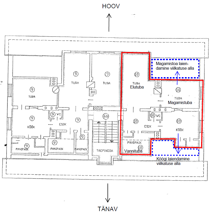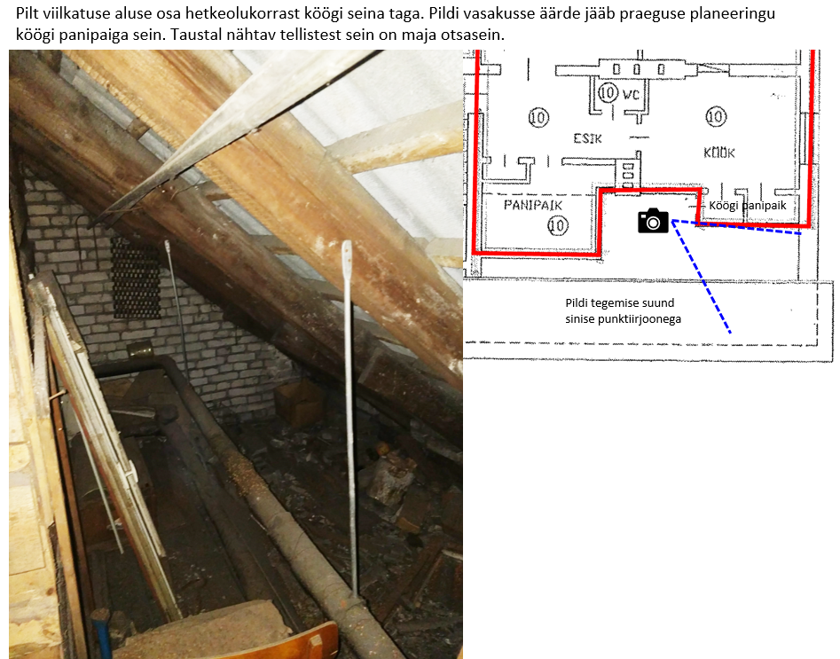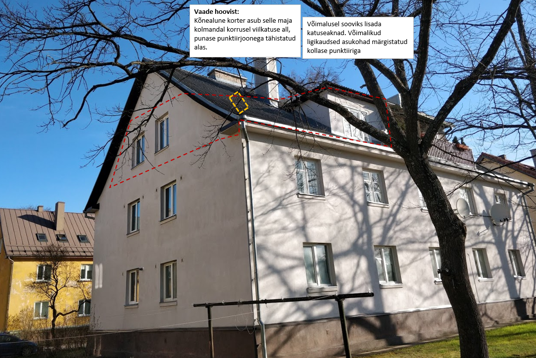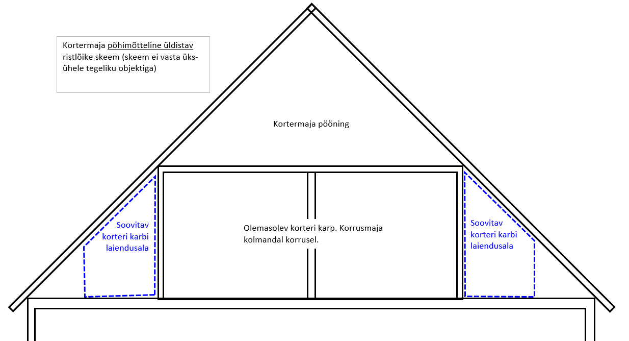 • Kas konstruktsiooniliselt on võimalik korteri pinda laiendada viilkatuse alla selles ulatuses nagu eskiisil märgitud sinise punktiiriga?
