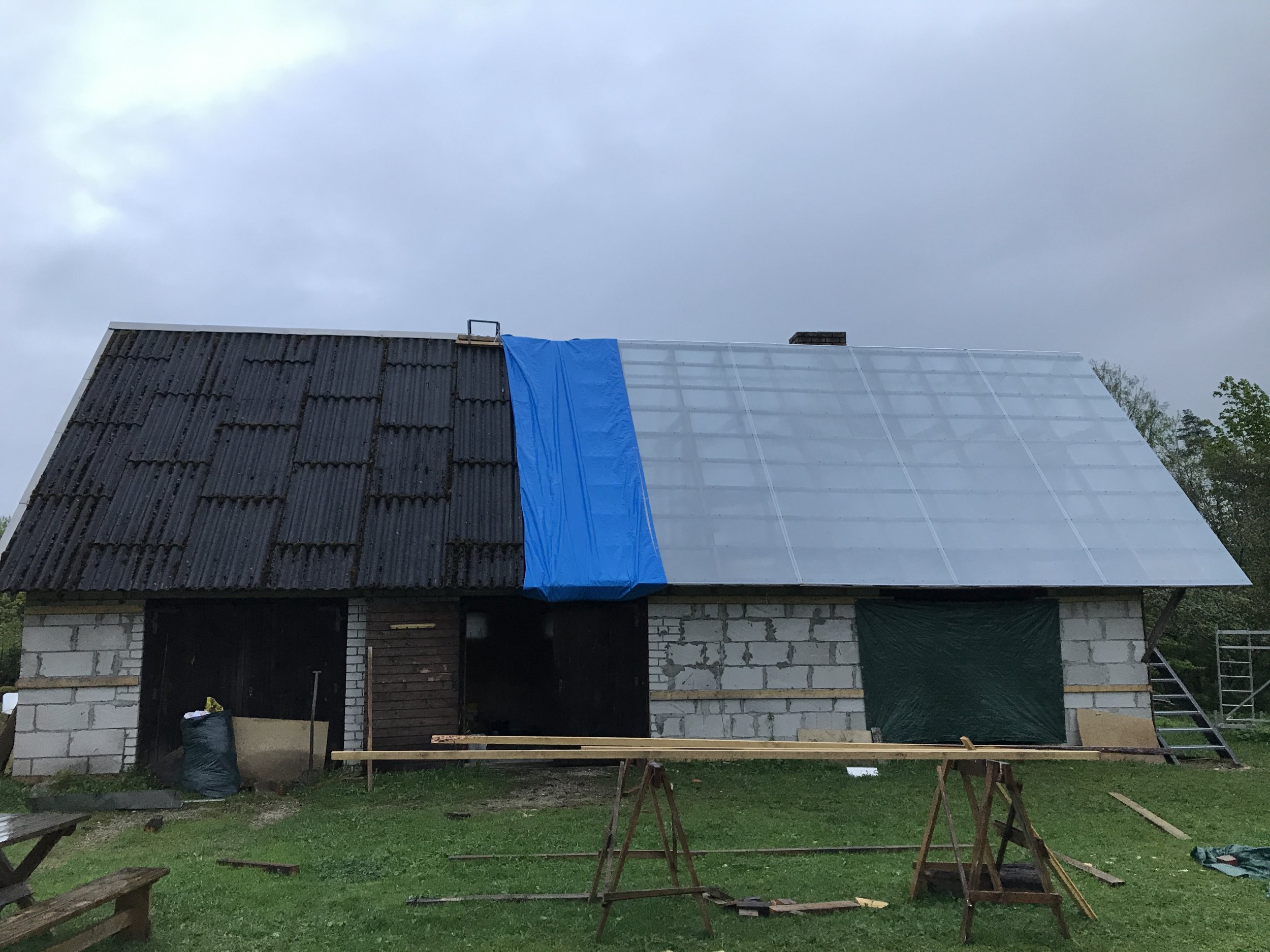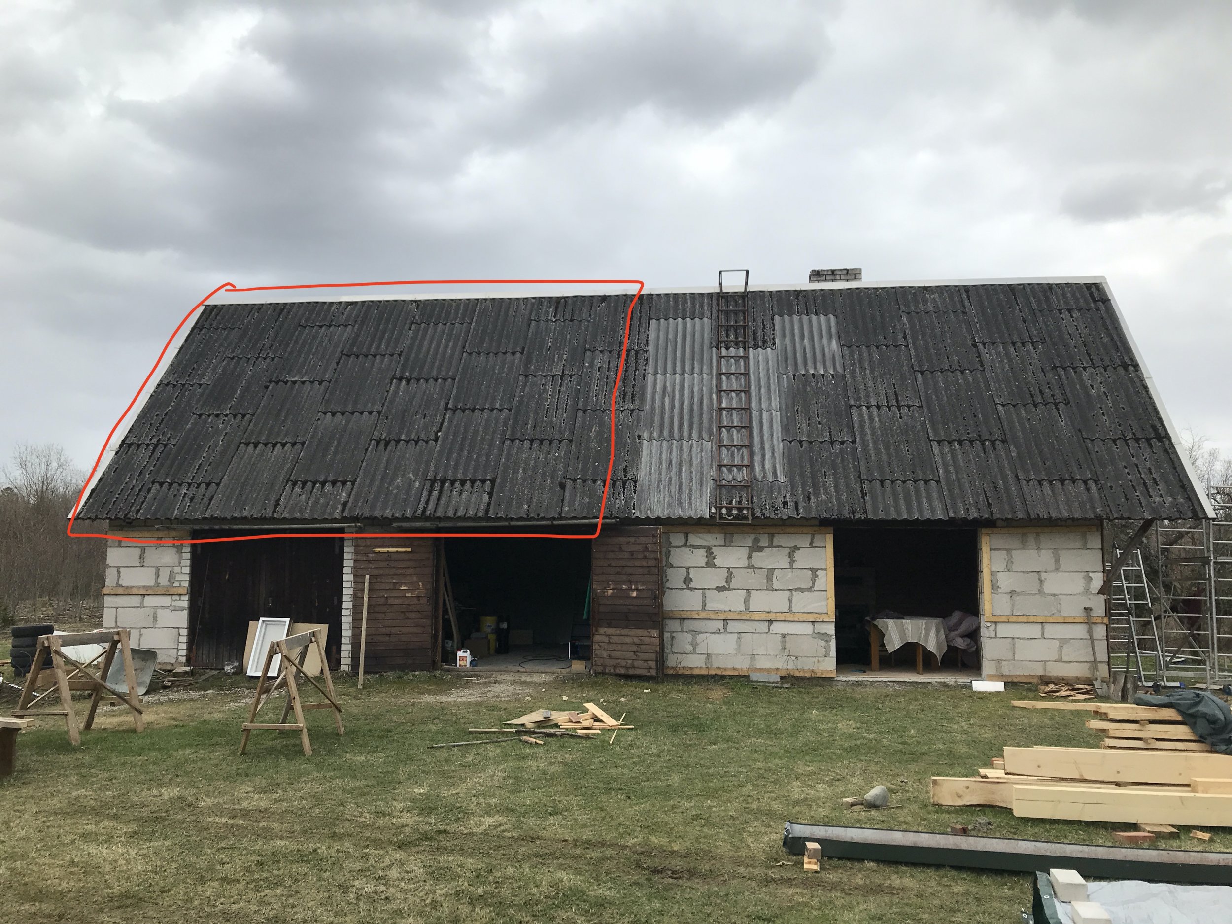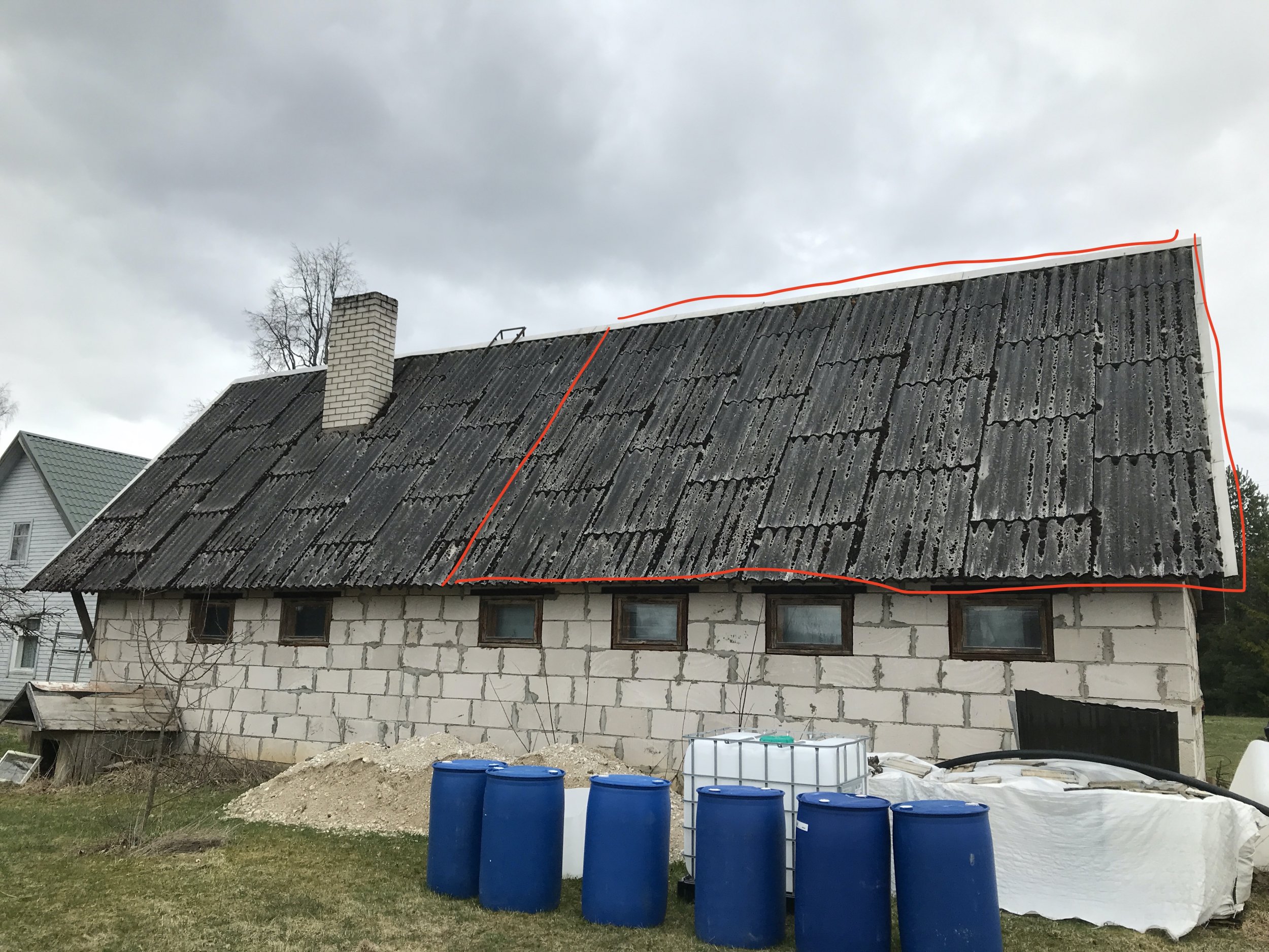 Praeguse eterniidi all on tõrvapapp ja selle all omakorda servamata laud, mis on otse sarikate peale löödud. Tõrvapappi ja vana servamata lauda ei ole tarvis eemaldada. Variant panna kile otse tõrvapapi peale (kuna tõrvapapp on pisut auklik) ja seejärel tuulutusliist ja ristroov. Korstnaid selle poole peal ei ole. puhas viilkatus. vana tuulekast peaks alles jääma. Alla tulnud eterniiti aitab koristada maja peremees.