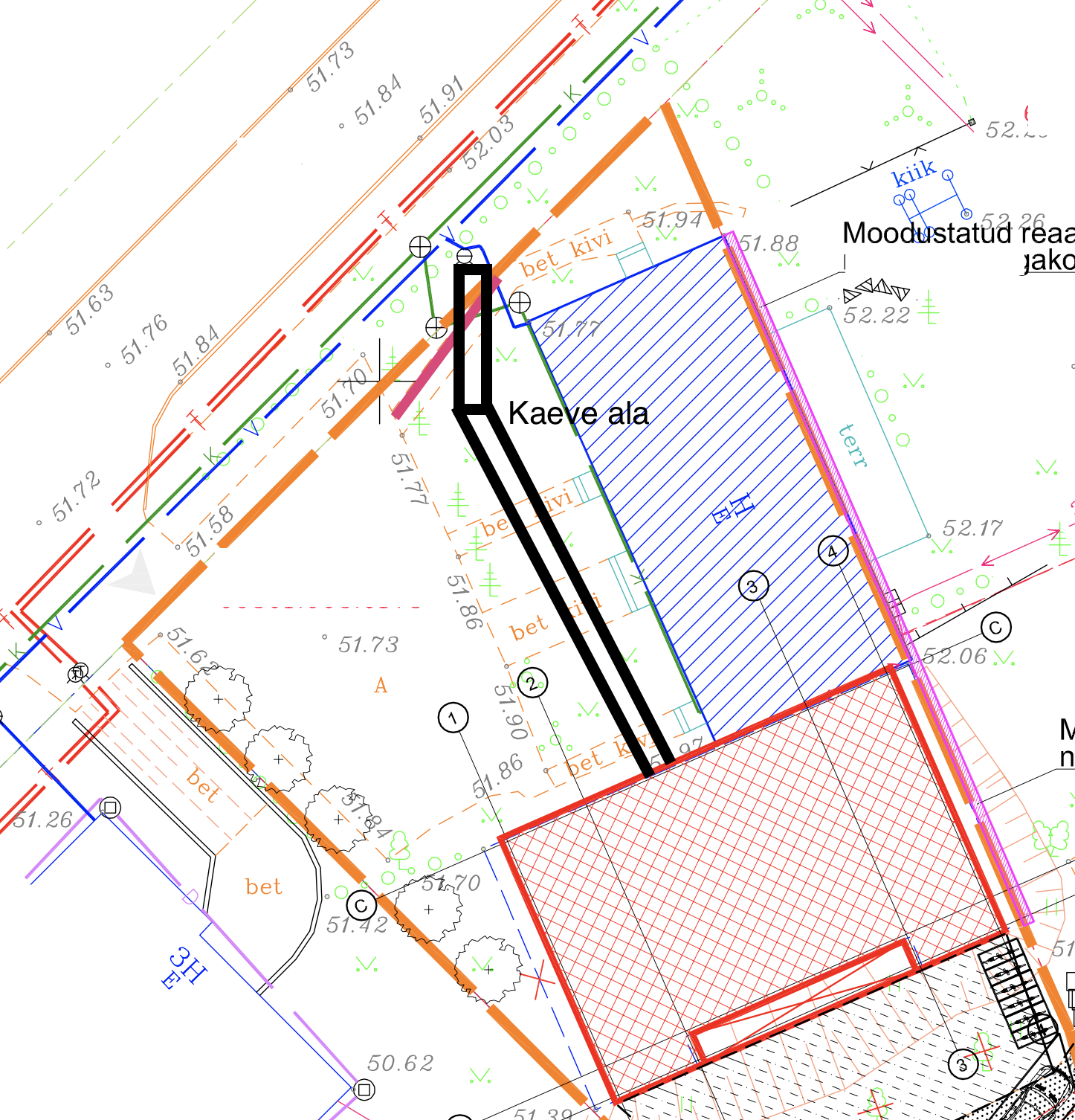 Pildilt näha kaeve trajektoor, mis kulgeb üle kõnniteede.
