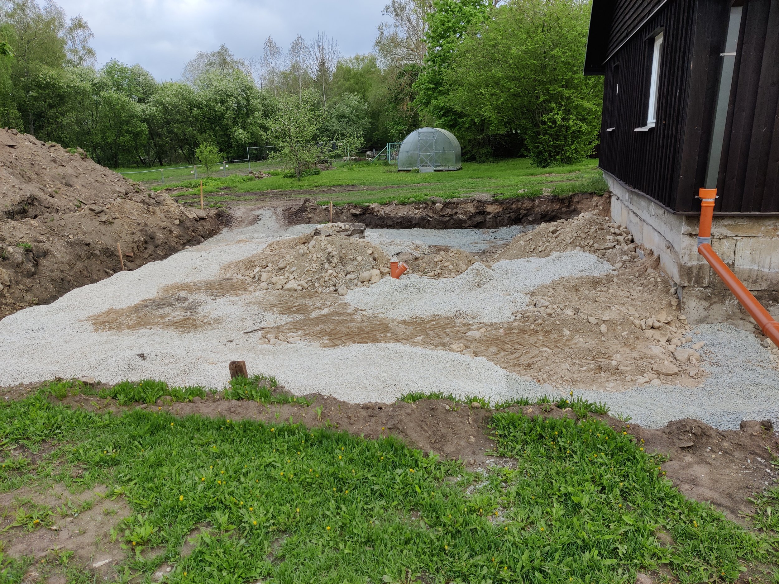 Olemasolev olukord: väljakaeve on tehtud, vundamendi alused torustikud on paigaldatud, killustikalus on ehitamisel.