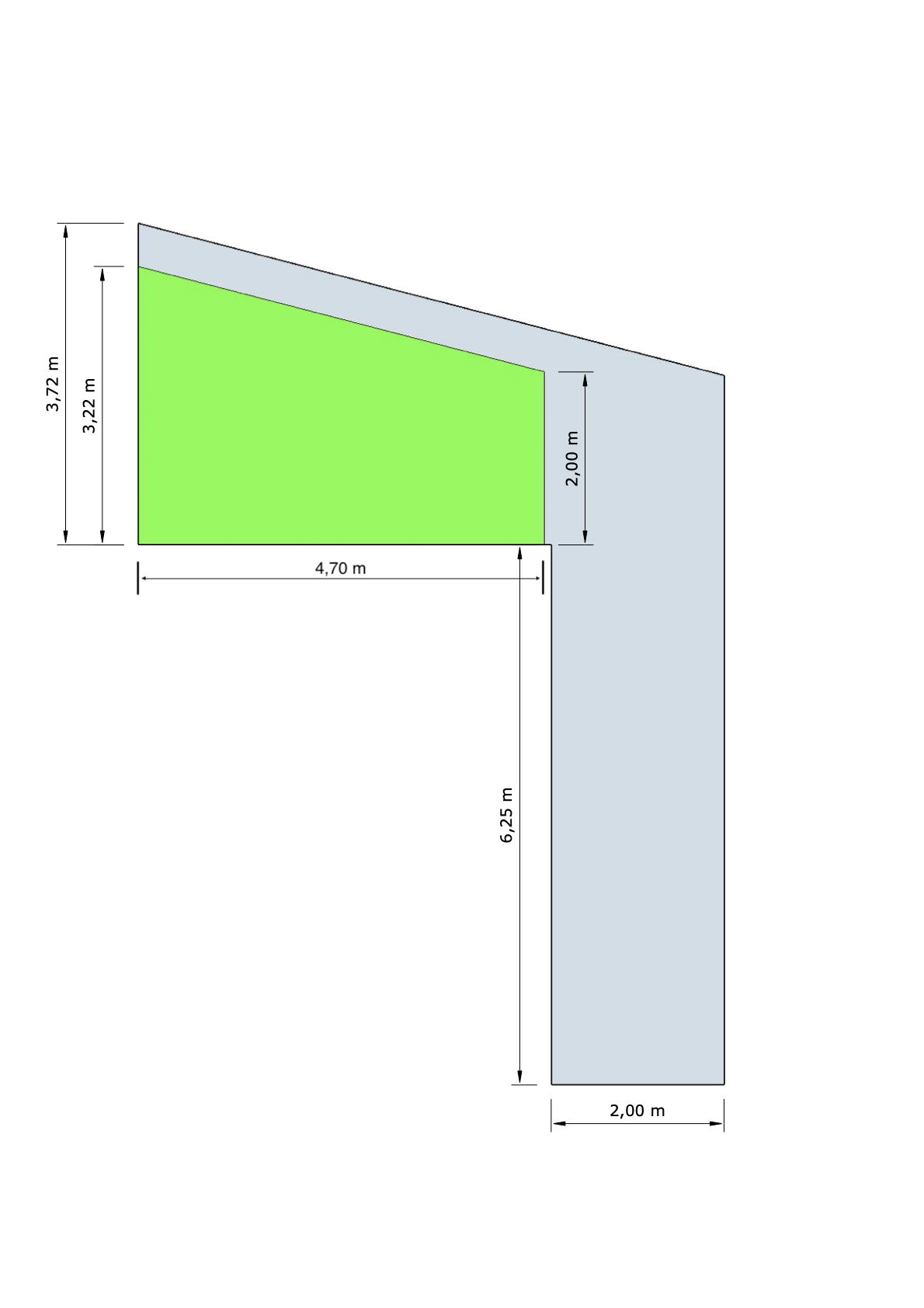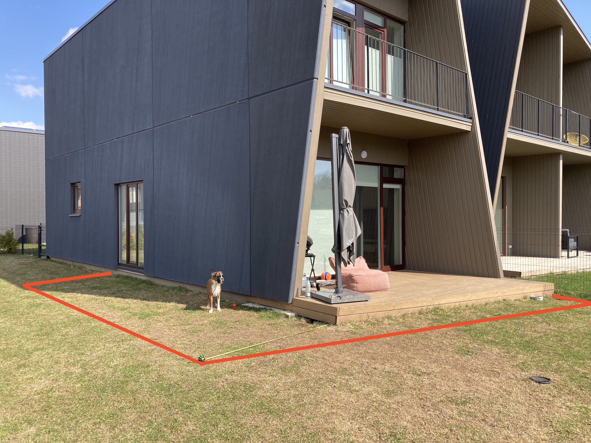 Soov oleks olemasolev terrass (umbes 13 m2, joonisel roheline ala) laiendada majast 50cm eemale ning ümber maja nurga edasi, kokku ca 19 m2 võrra (joonisel hall ala). Terrassilauad peaksid olema termotöödeldud mänd, kinnitada peidetud kruvidega ning terrassi sisse tuleks betooni valada ka päikesevarju kinnituspost (50cm pikkune, 5cm diameetriga metallpost).