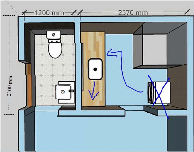 On veemõõdusõlm. Sealt viia torud põranda alt läbi tuulutusava järgmisesse tuppa, kuhu tuleb pesuruum ja wc. Et neid sinna saaks ehitada, tuleb eelnevalt lammutada toa põrand (osaliselt), teha vajalikud tööd jne, et saaks kõrvuti ehitada välja pesuruumi (mõõtmetega 2,5*2,1) ja wc (1,2*2,1).