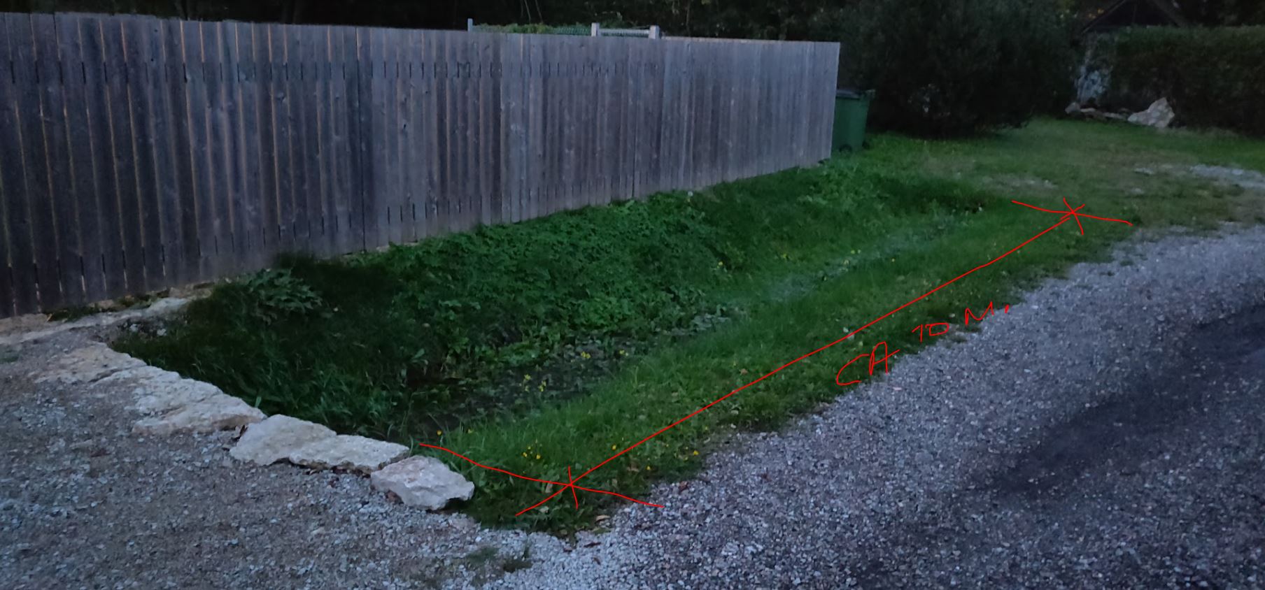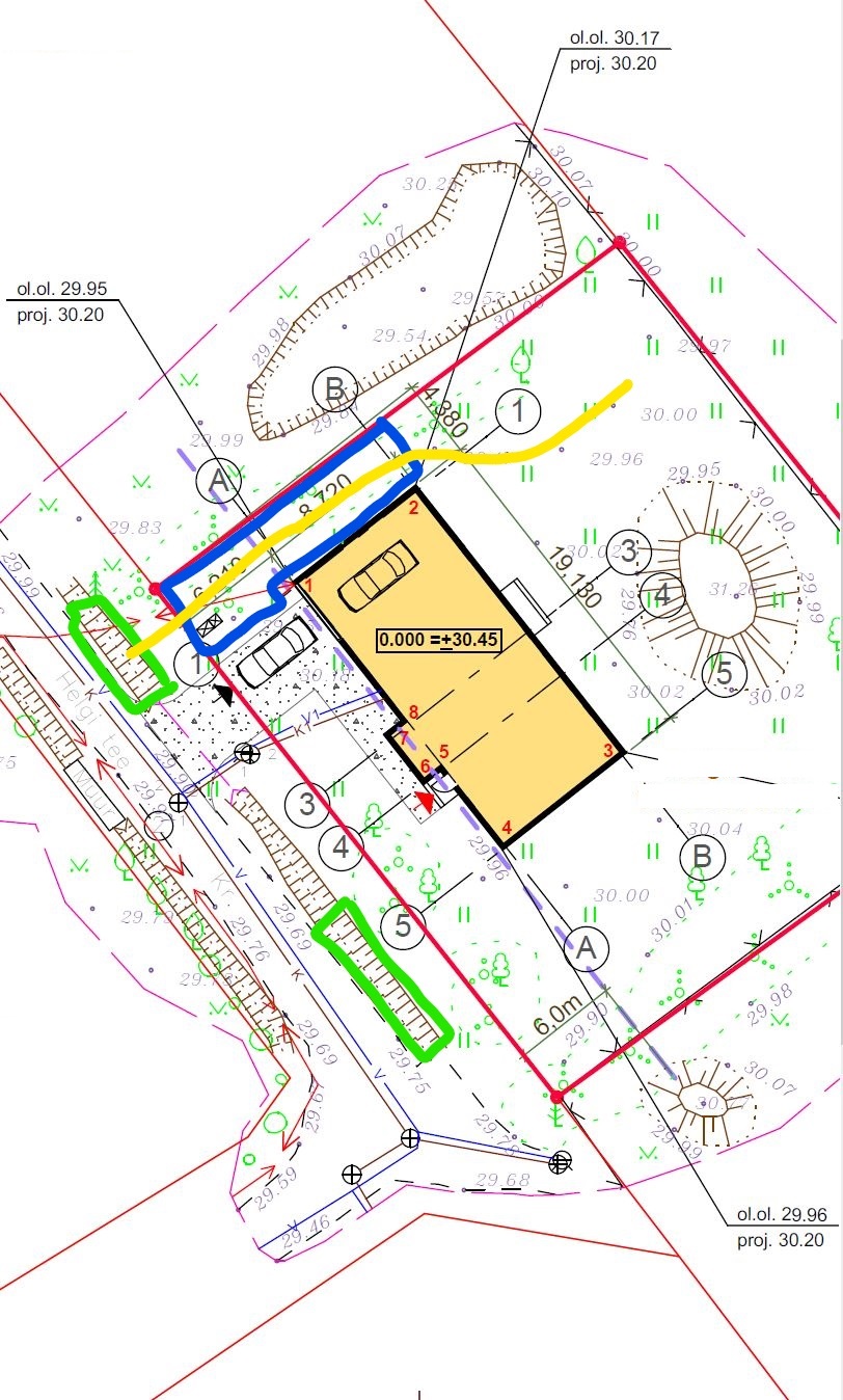 2. Vajalik natuke süvendada kraavi + paigaldada toru vee ära juhtimiseks. Väljakaevatud mulla punkt nr 1 juurest saab kraavi täiteks ära kasutada.