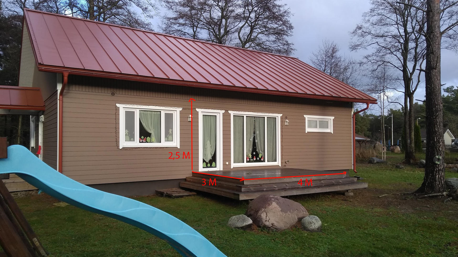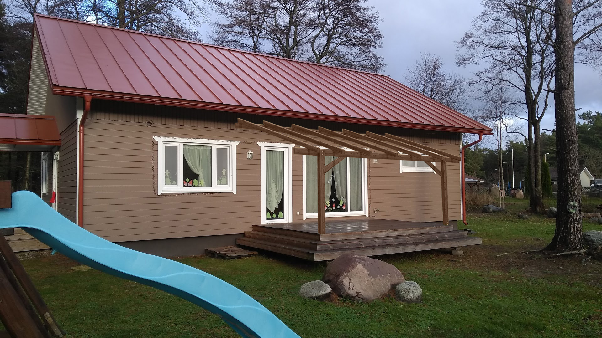 1. Terrassi varikatuse ehitamine: puidust varikatus tuleks kinnitada maja konstruktsiooni külge nagu lisatud fotol. Varikatusel on kaks puidust tugiposti (10 või 15 cm), katusekate peab olema punane nagu meie maja katus (lisan näiteks katusematerjali foto). Varikatuse mõõdud on 3mx4m, kõrgus umbes 2,5m kõrgeimas punktis. Katus on kergelt kaldus. Kogu materjali toob firma.
