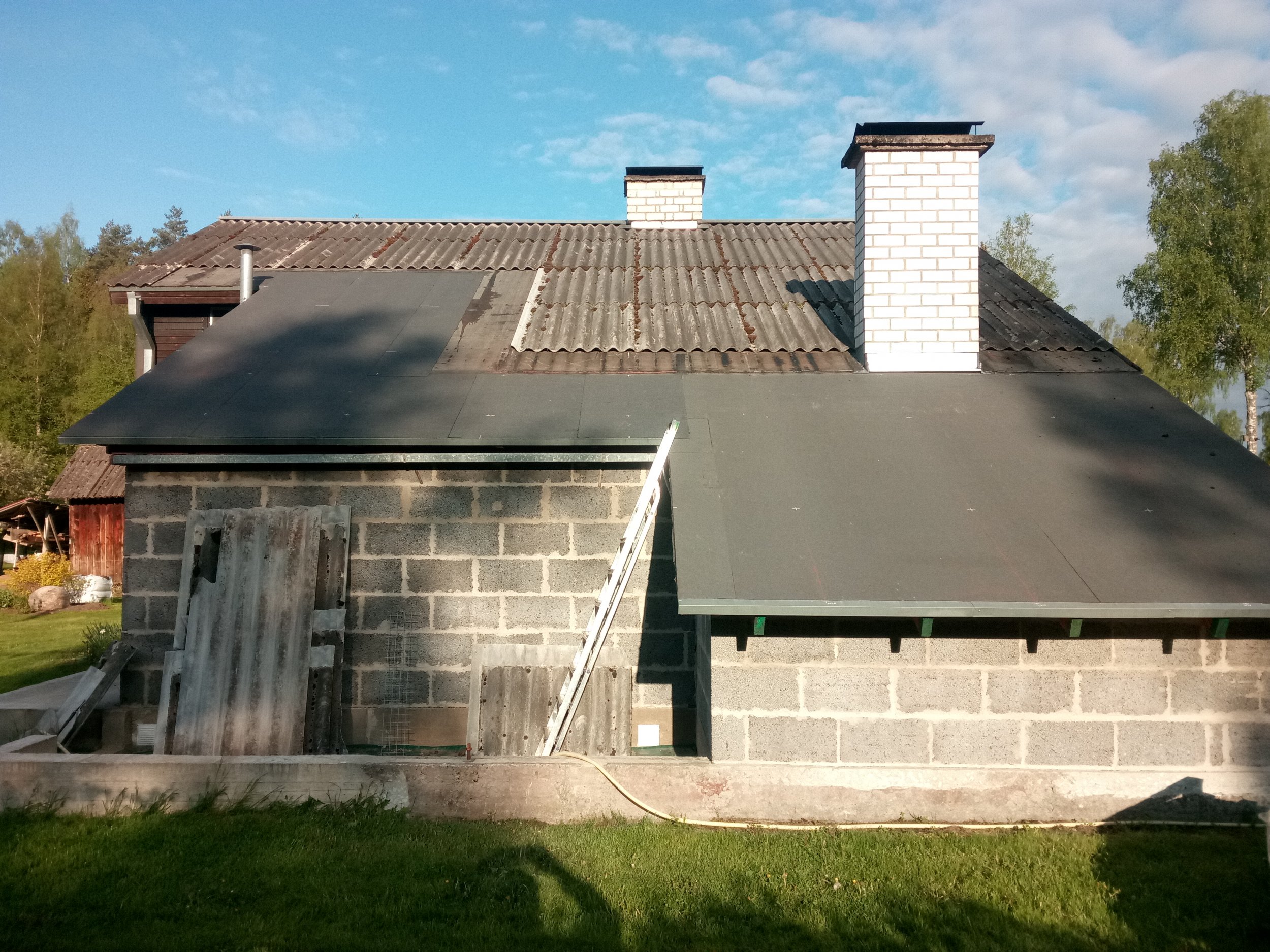 Paigaldada 25 uut eterniitplaati AgroL 1130×1750 katusele, kokku olemasoleva samamõõdulise nõuka eterniidiga. Ruberoidi all täislaudis. Roovitust ei tule. Katuse kalle 1:2 ( 26 kraadi). Korstnast vee ümberjuhtimine teha gofreeritud alu lindiga.