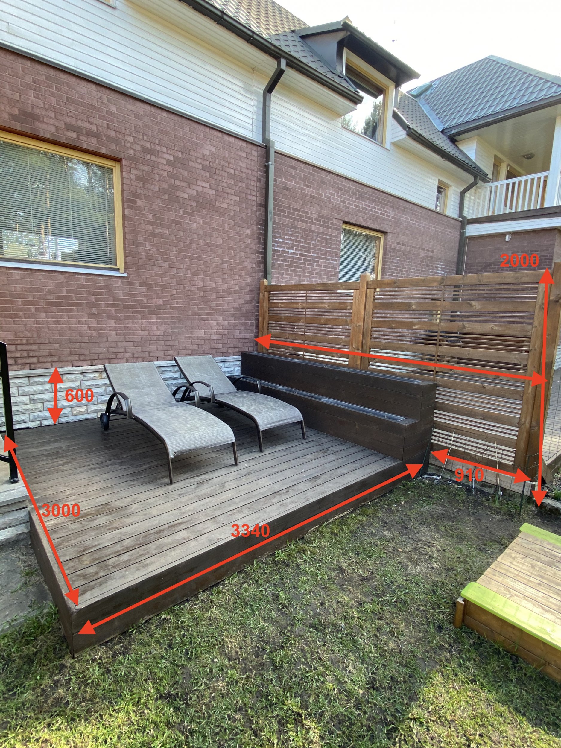 Uus terrass tuleb praegusega täpselt samasse kohta, aga pikeneb 910 mm võrra ehk vaheseina lõpuni. Vahesein tuleb uus, aga samas mõõdus nagu praegune - uue näidis on pildil olemas. Vahesein keerab terrassi lõpus ka nurga alla nagu on näidispildil ehk 350 mm ulatuses tekib lõppu väike nurk.