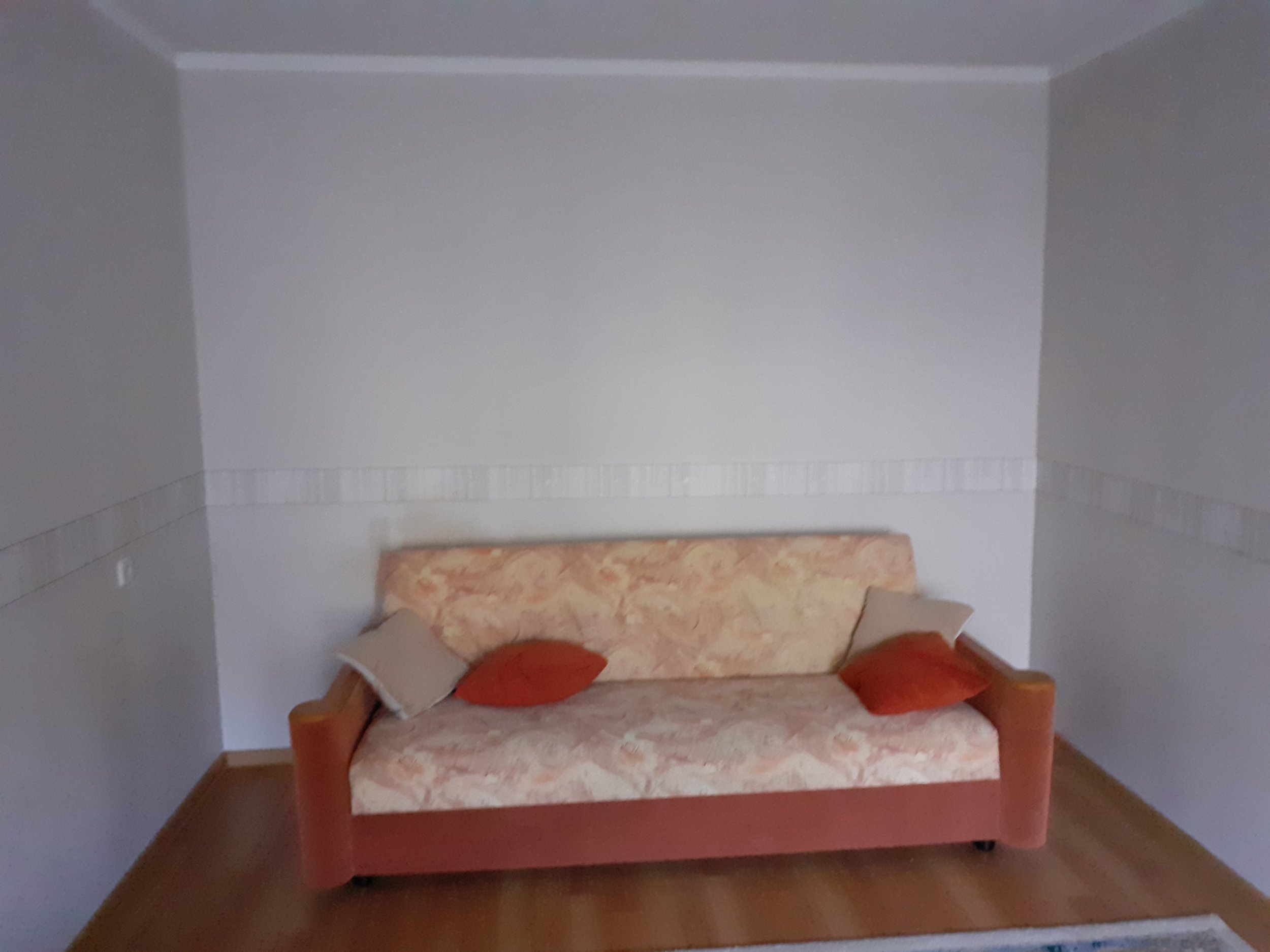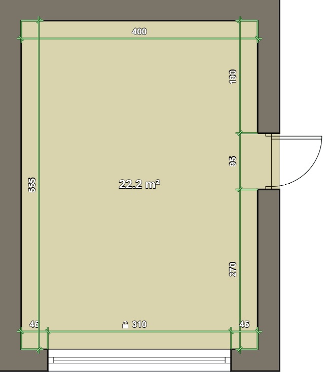 Toas on tapeediga kaetud 3 seina, üks sein 400cm, teine sein 555cm ja kolmas sein 555cm koos 95cm ukseavaga.
