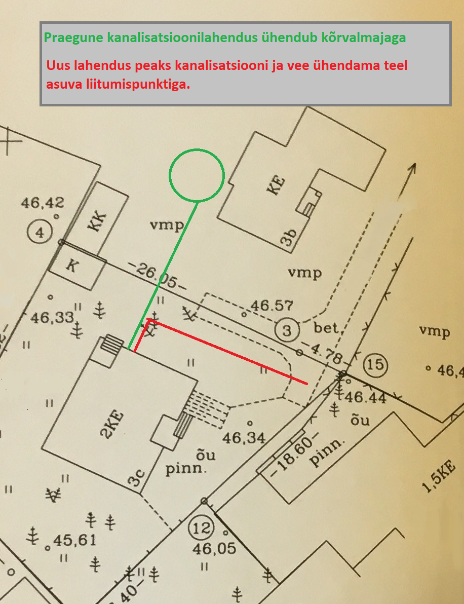 Maja on hetkel veesüsteemiga ühendatud kõrvalmajaga ja on soov ühendada vesi ja kanalisatsioon ümber linna teel oleva liitumispunktiga. Majast liitumispunktini on ~12 meetrit.