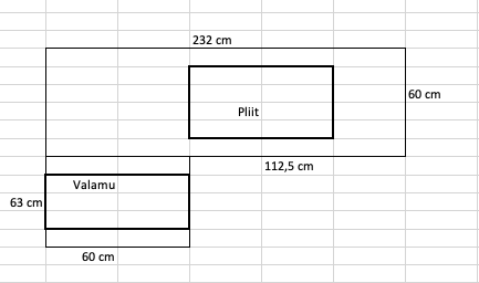 Tegu nurgaköögiga, mille pikem külg seina ääres 232cm ja lühem 123cm. Töötasapind, kahes tükis, on olemas, ülejäänud materjal töö teostaja poolt. Seinaplaadid samuti olemas, ülejäänud materjal töö teostaja poolt.