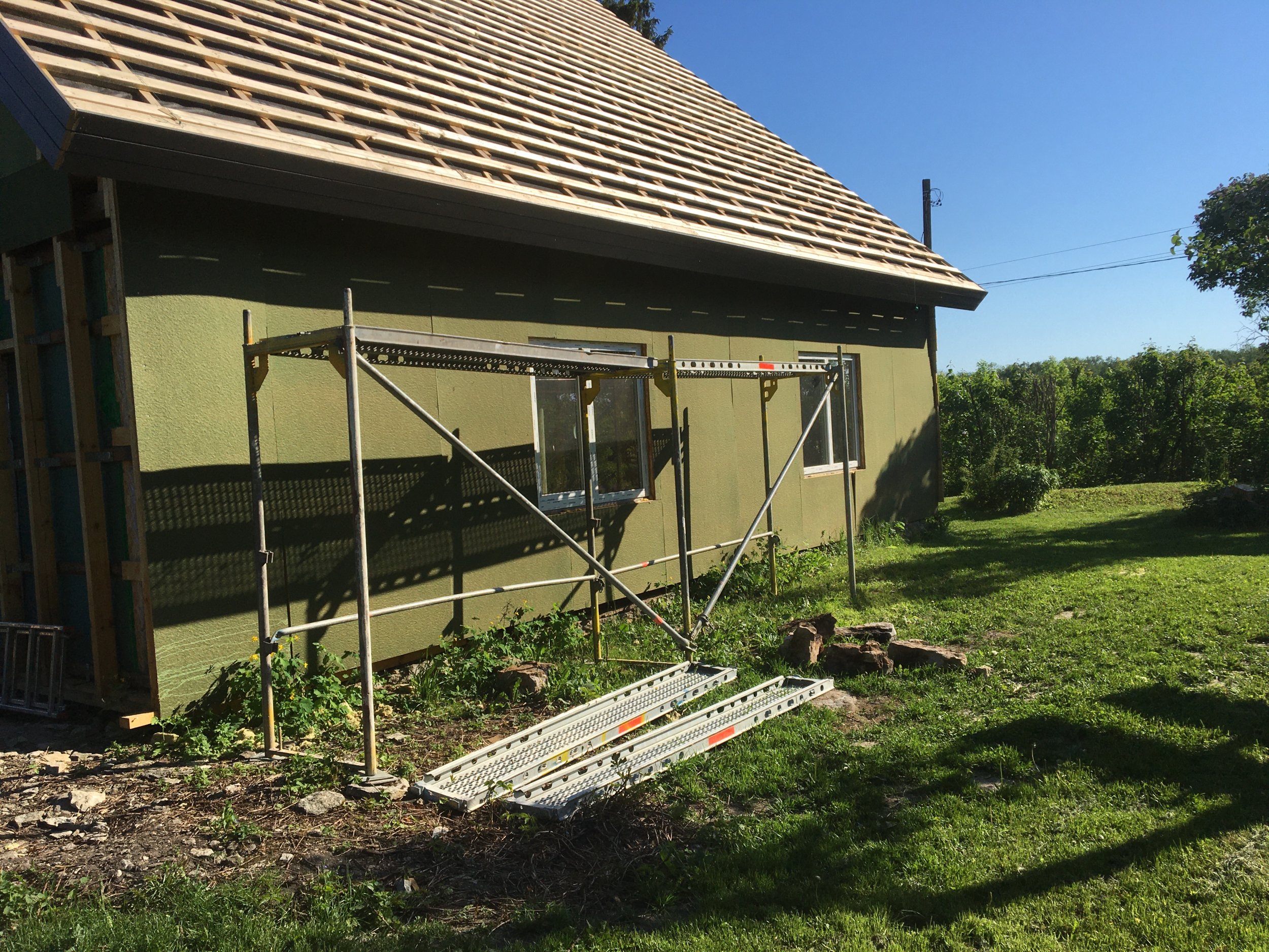 Oleks vaja pildil olevad seinad voodrilaua alla saada. Üks sein on juba soojustatud, otsasein koos otsaviiluga on osaliselt soojustatud. Samuti oleks vaja paigaldada ülemised aknad ja paigaldada akende serva lauad, nii alla kui üles ning hea pakkumuse korral telliks ka soklitööd(soojustus, külmatõke, krohv). Ka maja nurga lauad on vajalik paigaldada.