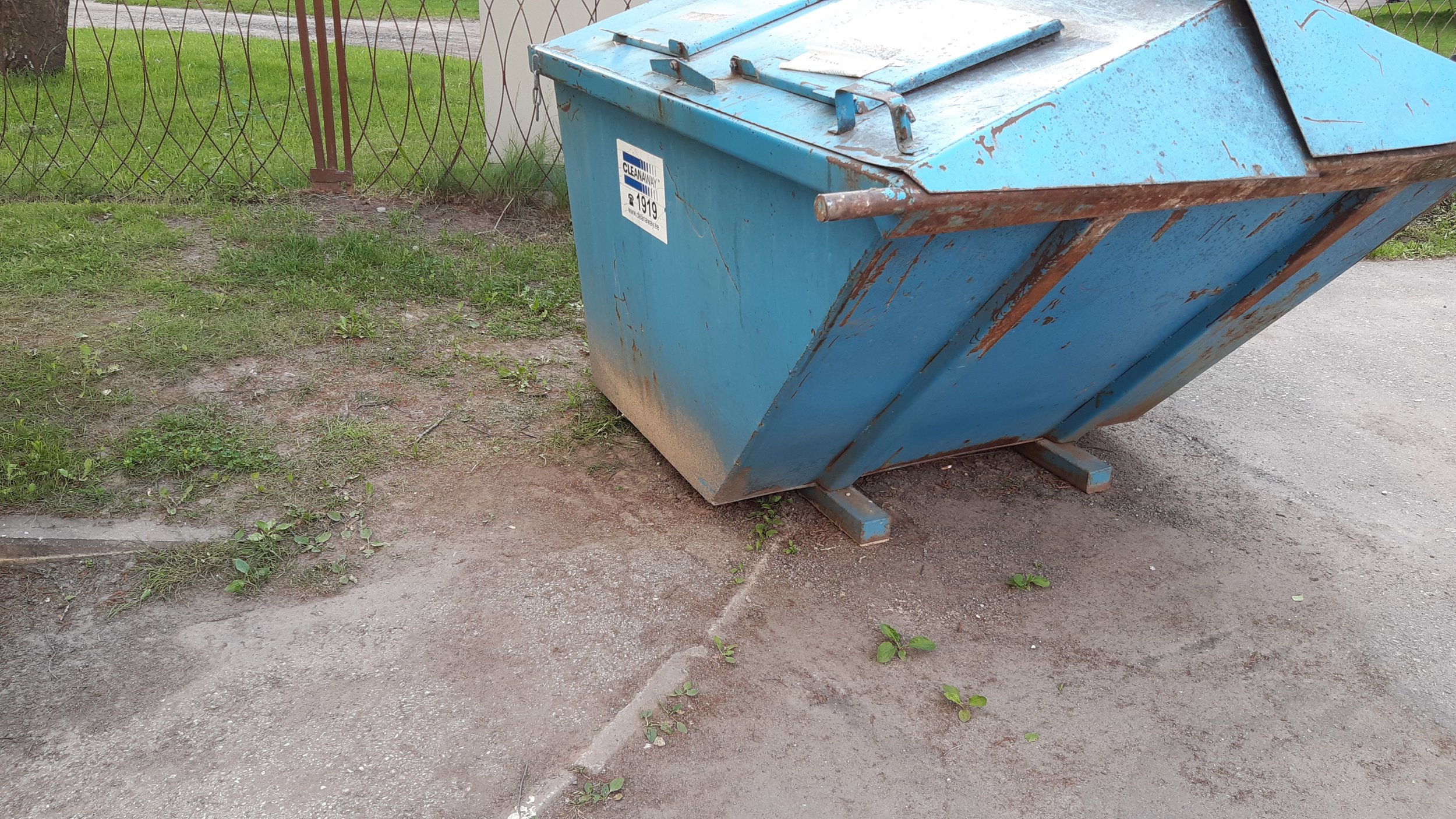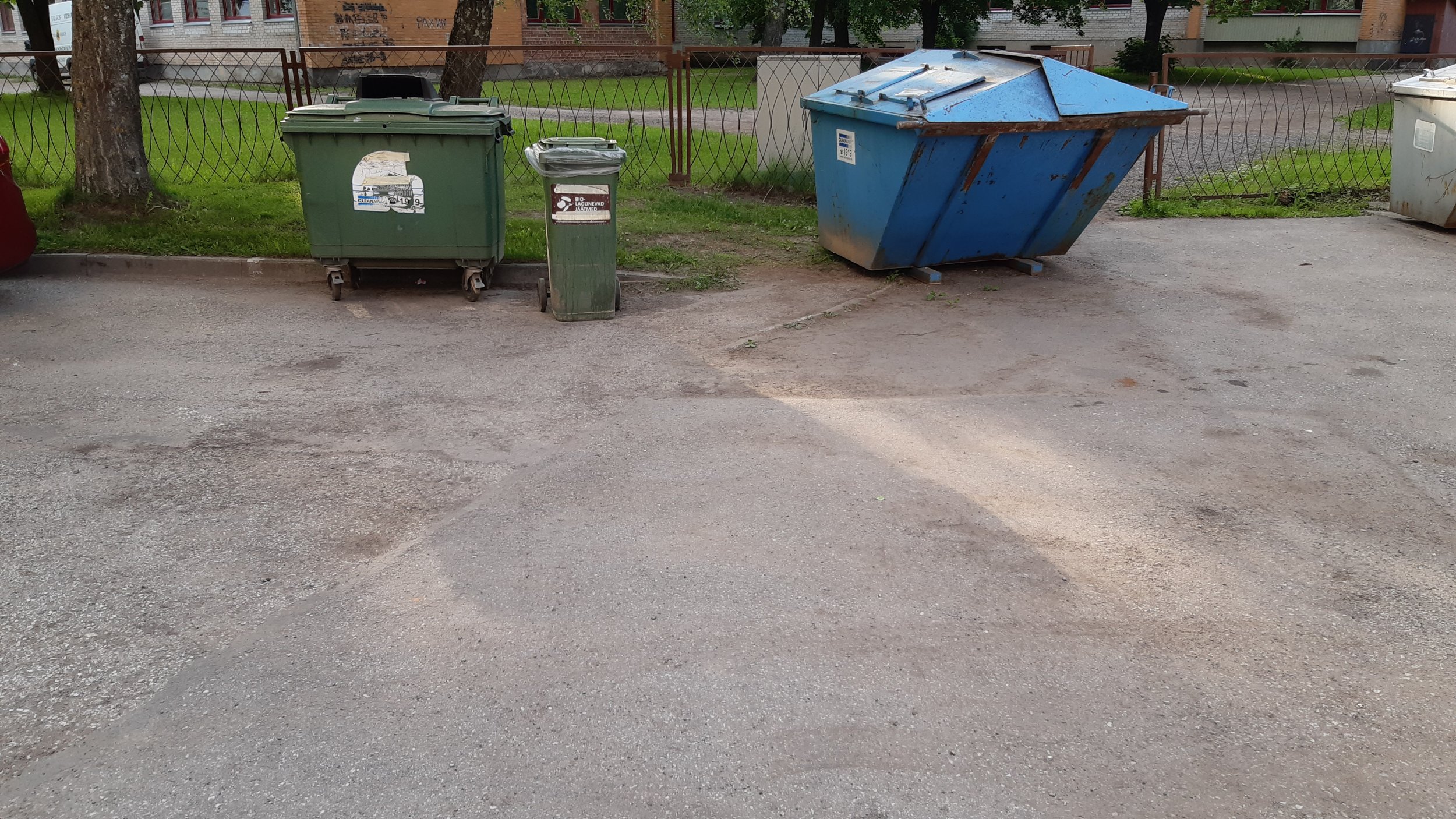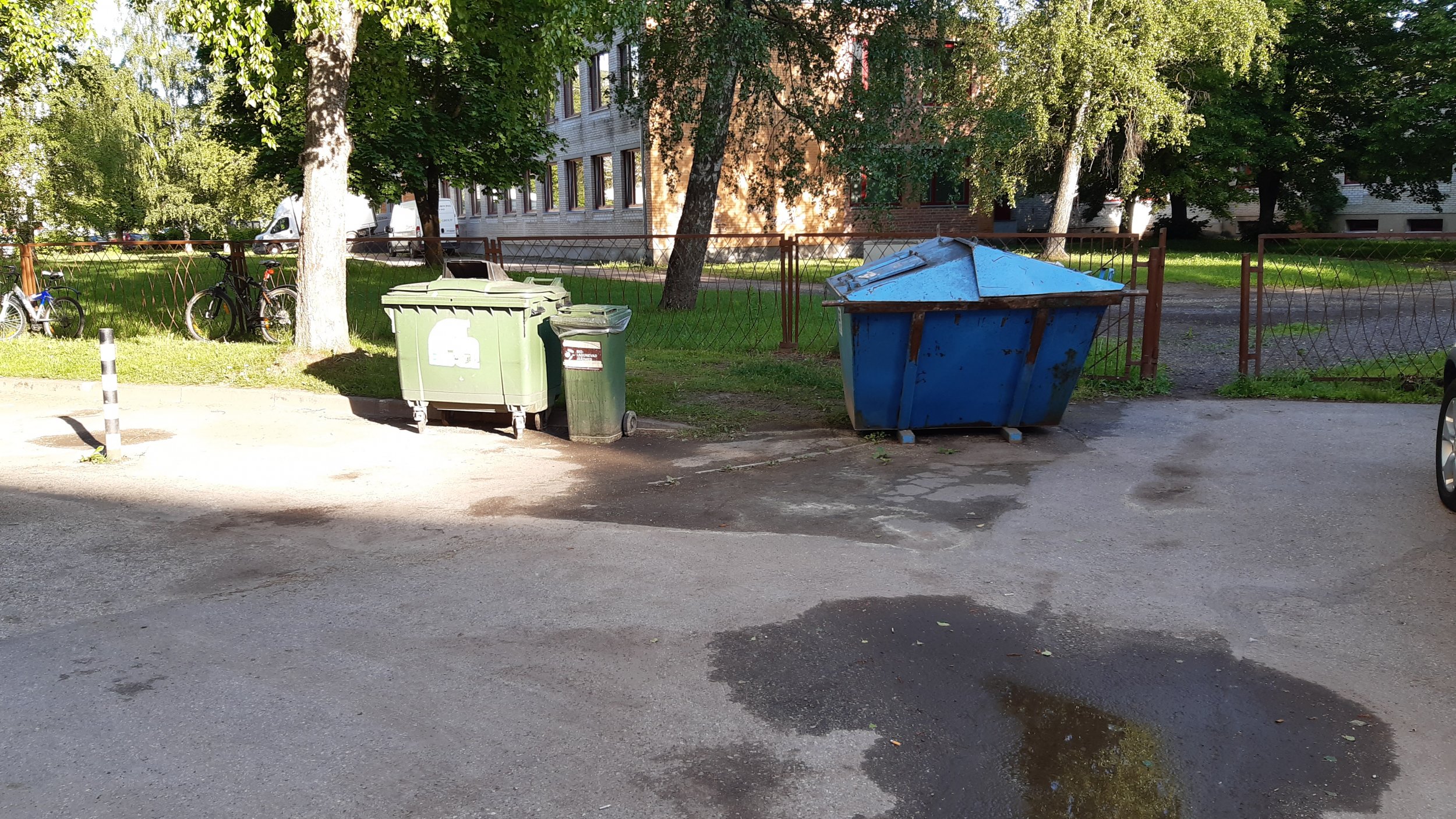 Kortermaja kõrval pind, kus asuvad prügikonteinerid, kevadel on vesi all.
