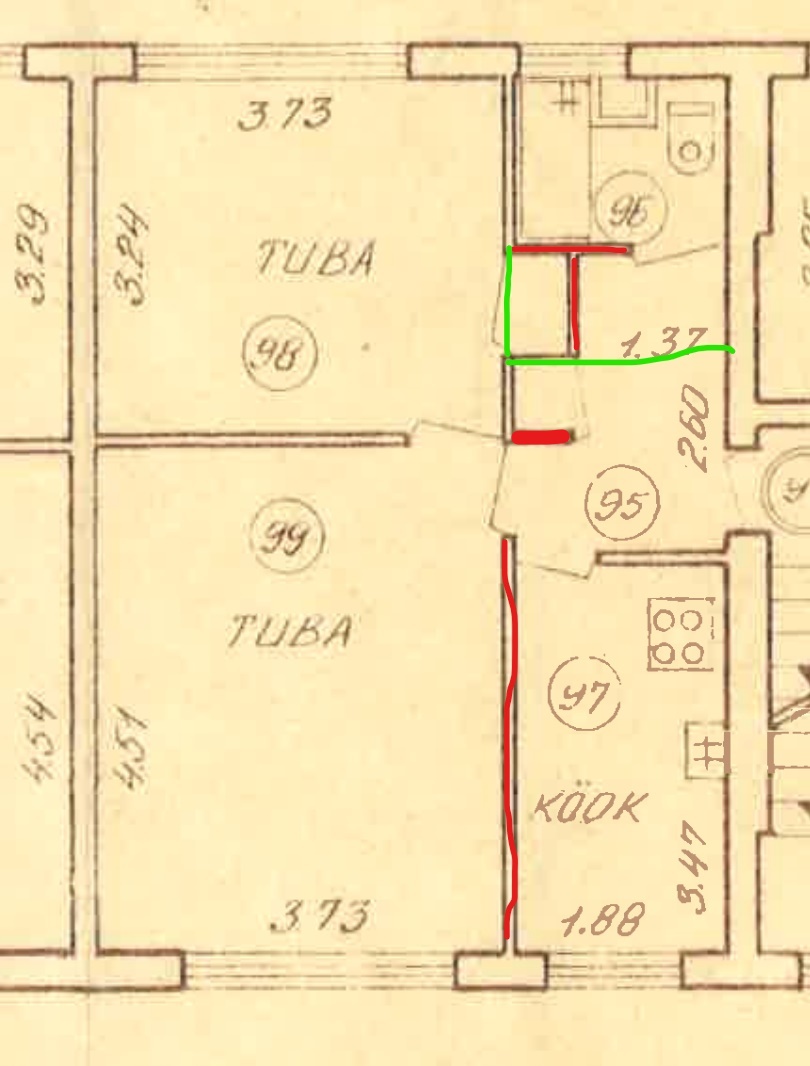 Vannitoa suurendamine esiku arvelt (lisatud korteri plaani foto koos kirjeldusega,(punane joon seina eemaldus, roheline joon seina ehitamine))