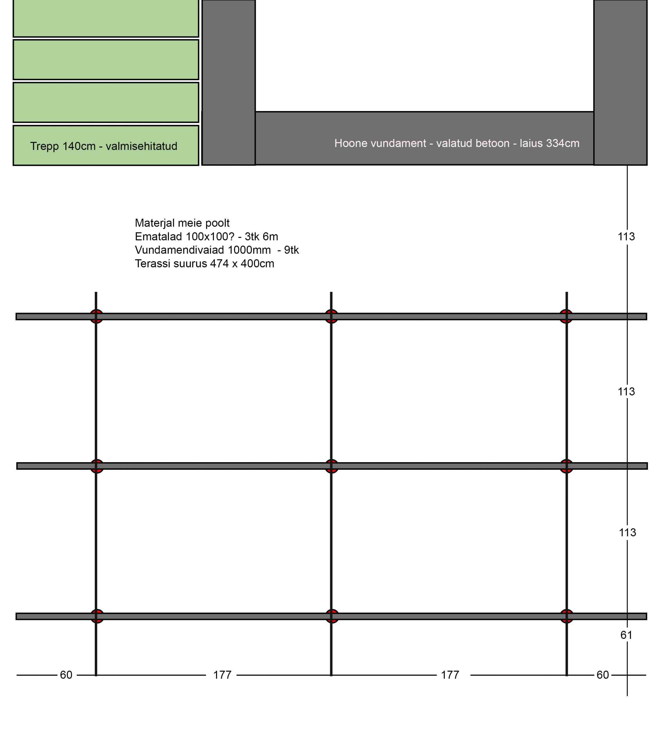 Pakkumine sisaldab pinnase välja kaevamist kuni 15 cm- teostatakse käsitsi ladustamine paari meetri kaugusele terrassist. Võimalik pinnast ka kaugemale viia, kuid sel juhul vaja eraldi läbirääkida. Geotekstiili paigaldus, killustiku paigaldus tingimusel, et killustik asub lähedal, kuni 25 meetri kaugusel. Kui kaugemal, siis vaja juba rasketehnikat ning see eraldi tasuga. Kruvivaiade paigaldus ning talade rihtimine, loodimine ja paigaldus. Antud kruvivaiade puhul soovitaks kasutada talasid 150x50, siis on võimalik rihtida ja loodida. 100x100 tala paigalduse soovi korral meie pakkumisega mitte arvestada, kuna kruvivaia ei saa millimeetri pealt paika panna ning antud pruss ei jäta ruumi tolerantsile või siis kaaluda teistsuguse kruvivaia soetamist, millel on võimalik taldmiku laiust reguleerida. Tööde teostamine võtab aega orienteeruvalt kuni 2 päeva. Toredat Jaaniõhtut soovides Rauno |