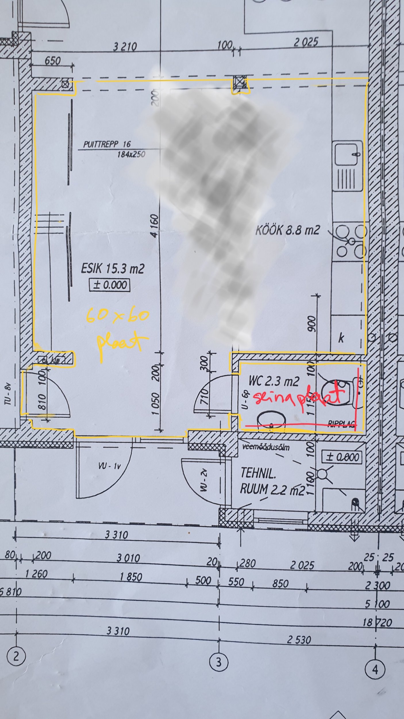 2) 60x60 põrandaplaadi paigaldus esik-köök-wc kokku ca. 26m2