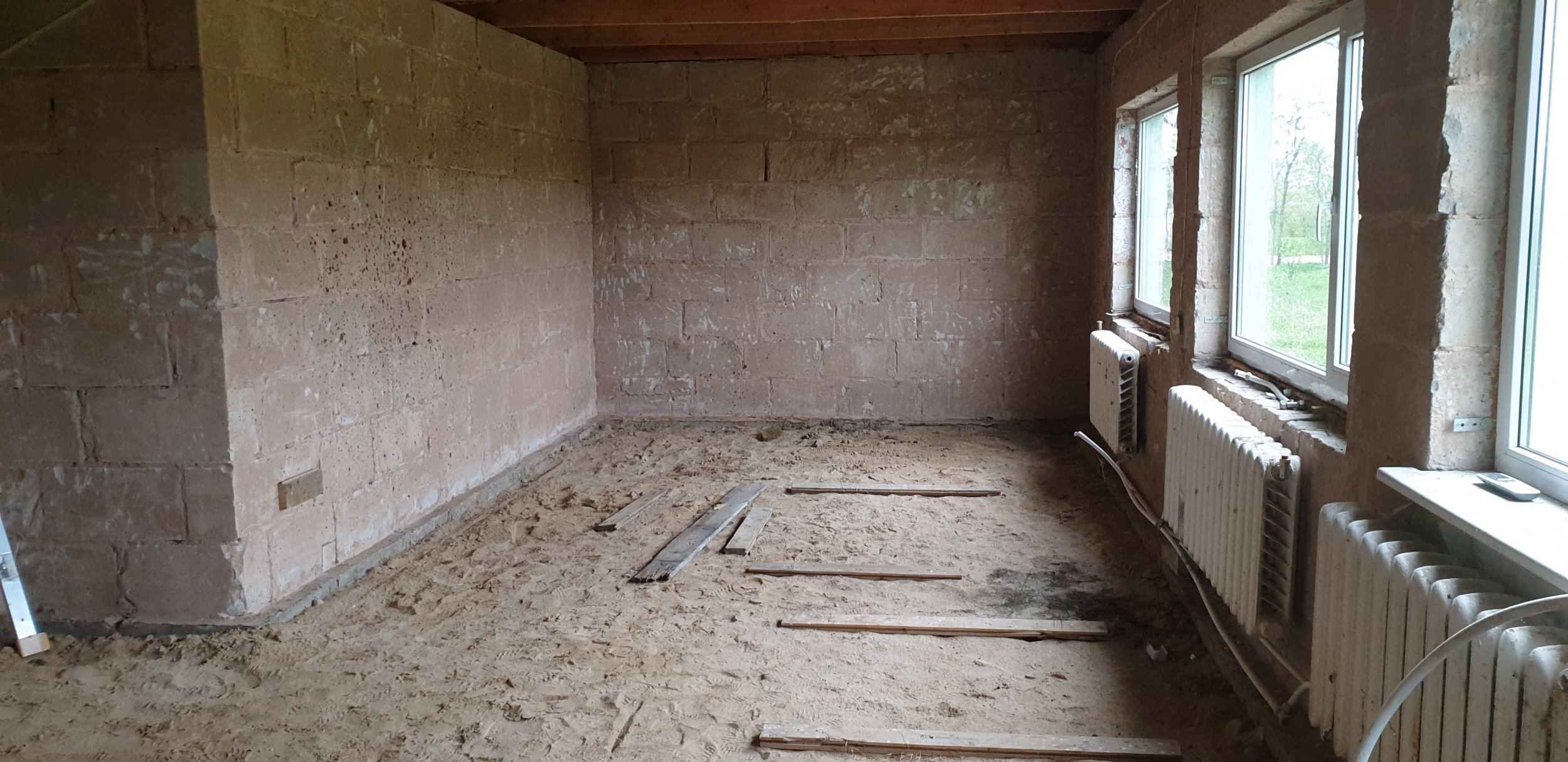 Kahekordse eramu esimese korruse osaliselt, 87m2, soojustamine, betoonpõranda valamine ja põrandakütte paigaldamine. Vana põrand välja lõhutud. Pinnas mulla- liiva segu eemaldatud, asendatud liivaga.