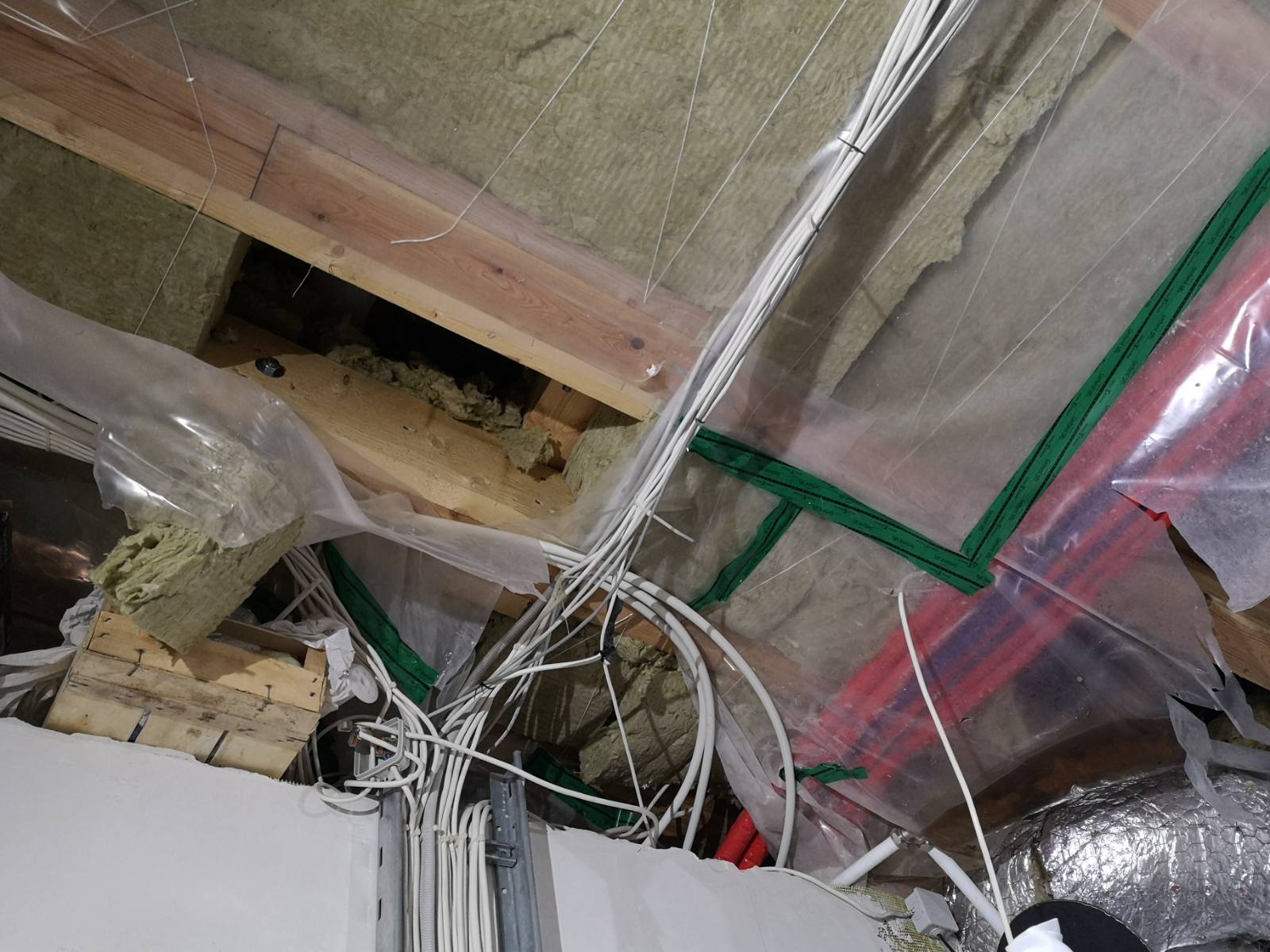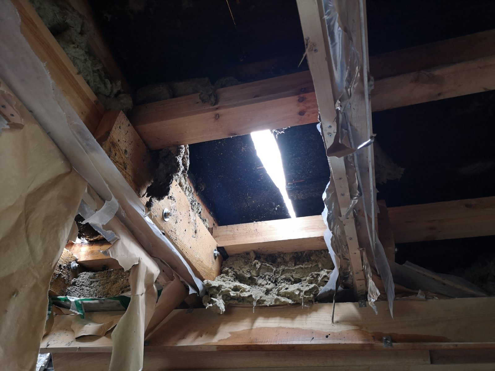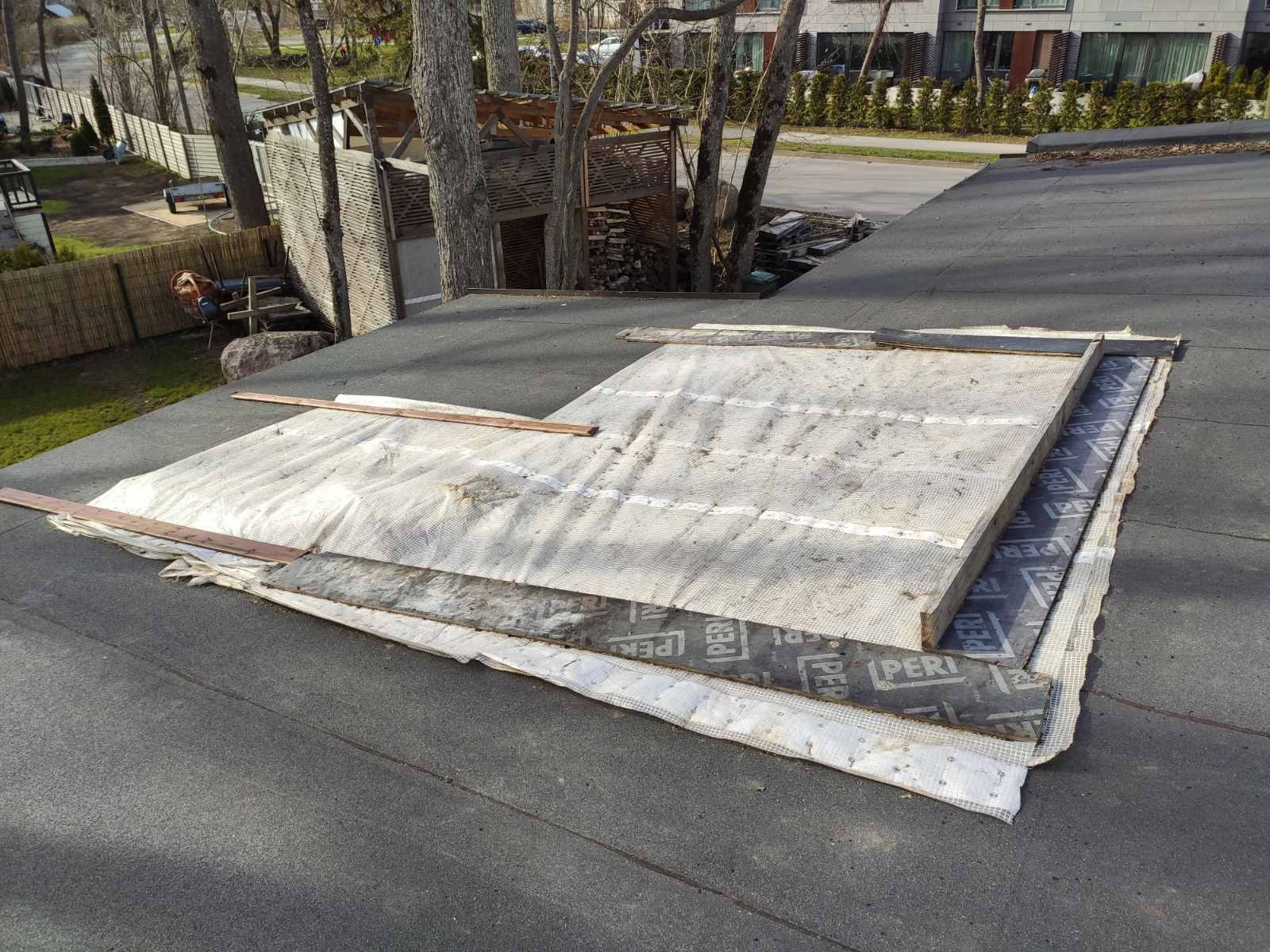 Sauna maja osa katus. Katusekalle on 8 kraadi. Kattematerjal on doppelt rullmaterjal . Kogu katuse pind on 100m2. Ümber korstna kahjustatud OSB osa vaja lahti võtta. Kahjustatud sarikad välja võtta ja paigaldada uued. Panna aurutõkke kile, roovitus, OSB paksusega 22mm ja uus Ruberoid Tehno Nikol Uniflex (aluskiht 4.0, pealiskiht 5.0). Osaliselt vill välja vahetada. Vill on 100+100+200 Rockwool Superrock. Paigaldada kaks lamekatuse tuuluti. Osaliselt taastada tuulekasti (umbes 20jm).