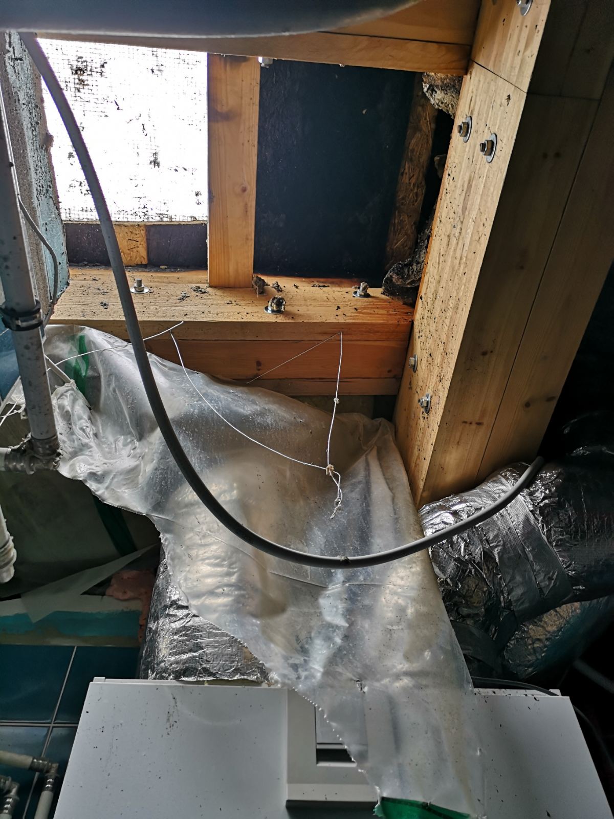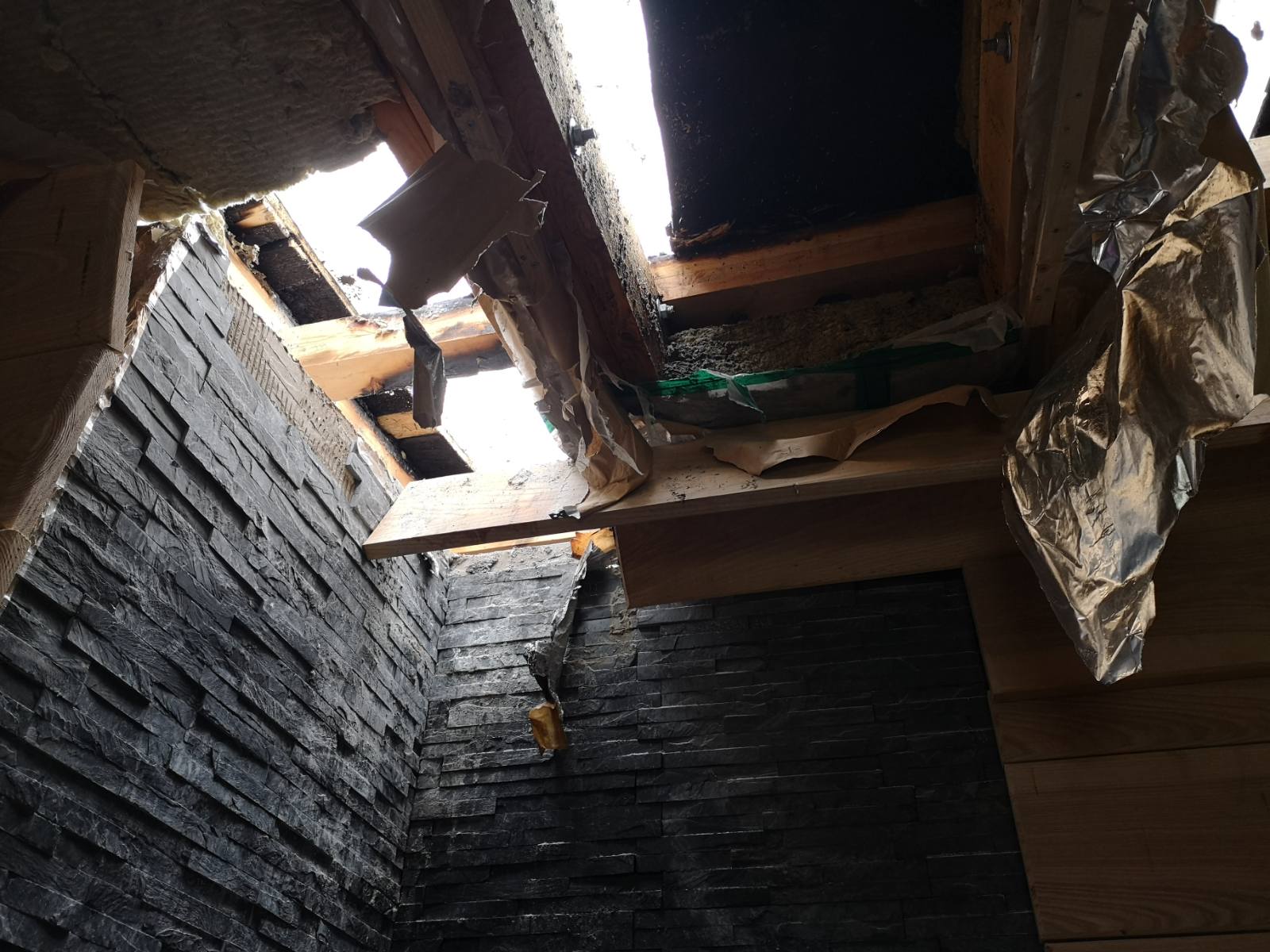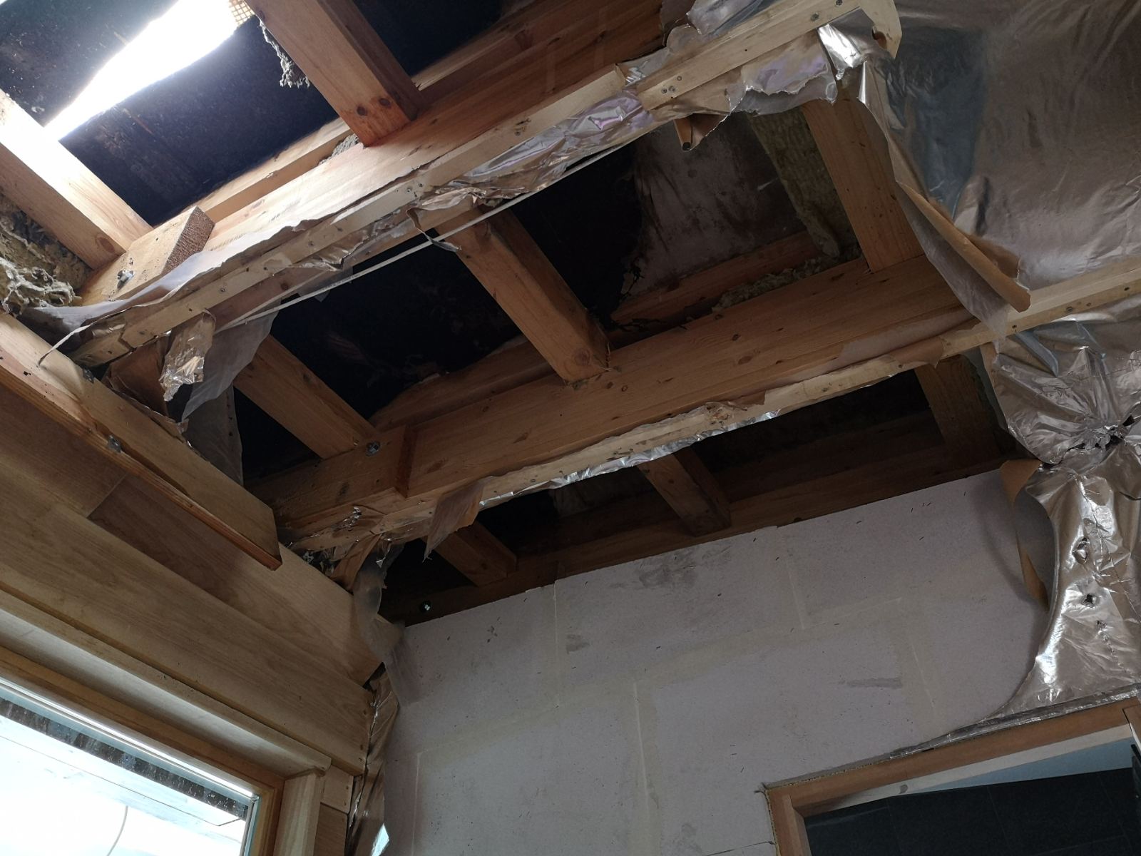 Sauna maja osa katus. Katusekalle on 8 kraadi. Kattematerjal on doppelt rullmaterjal . Kogu katuse pind on 100m2. Ümber korstna kahjustatud OSB osa vaja lahti võtta. Kahjustatud sarikad välja võtta ja paigaldada uued. Panna aurutõkke kile, roovitus, OSB paksusega 22mm ja uus Ruberoid Tehno Nikol Uniflex (aluskiht 4.0, pealiskiht 5.0). Osaliselt vill välja vahetada. Vill on 100+100+200 Rockwool Superrock. Paigaldada kaks lamekatuse tuuluti. Osaliselt taastada tuulekasti (umbes 20jm).