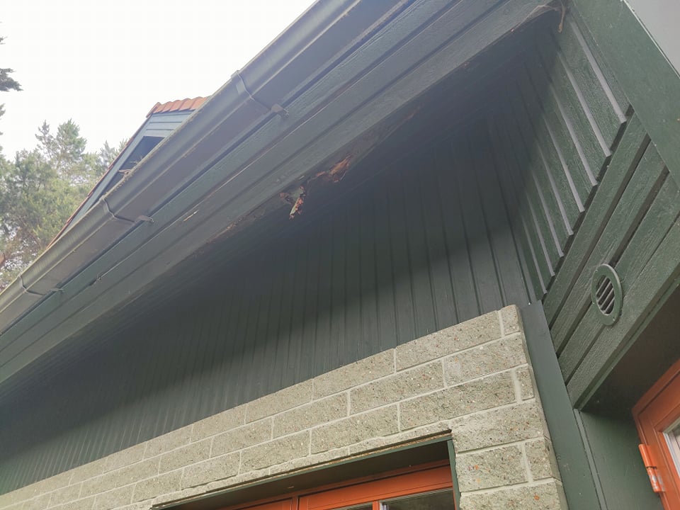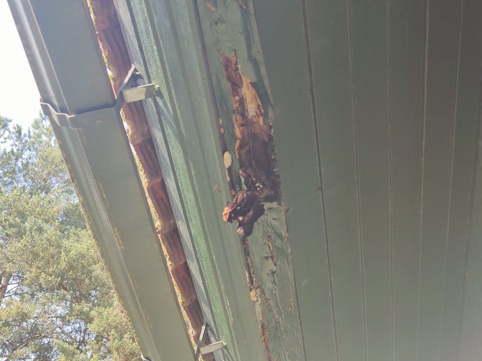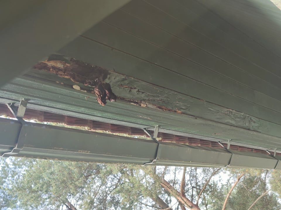 Ilmselt läbijooksu tõttu on kahjustunud katuseräästa laudis, mis nüüd on värskelt lagunema hakanud. Vaja on kahjustus lahti võtta, hinnata selle ulatust, likvideerida probleem ja uus laudis paigaldada.